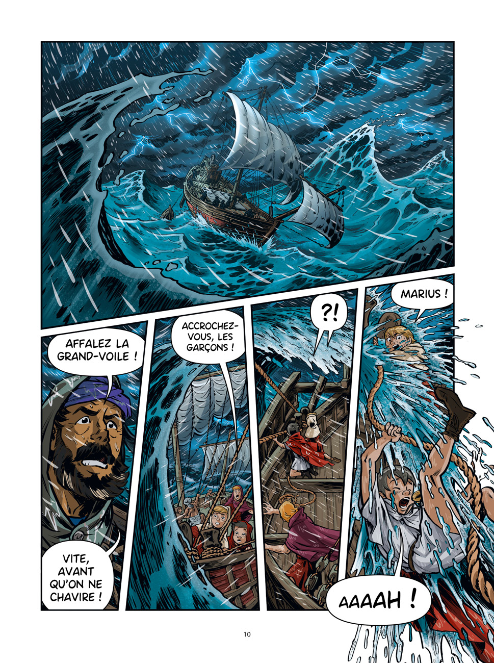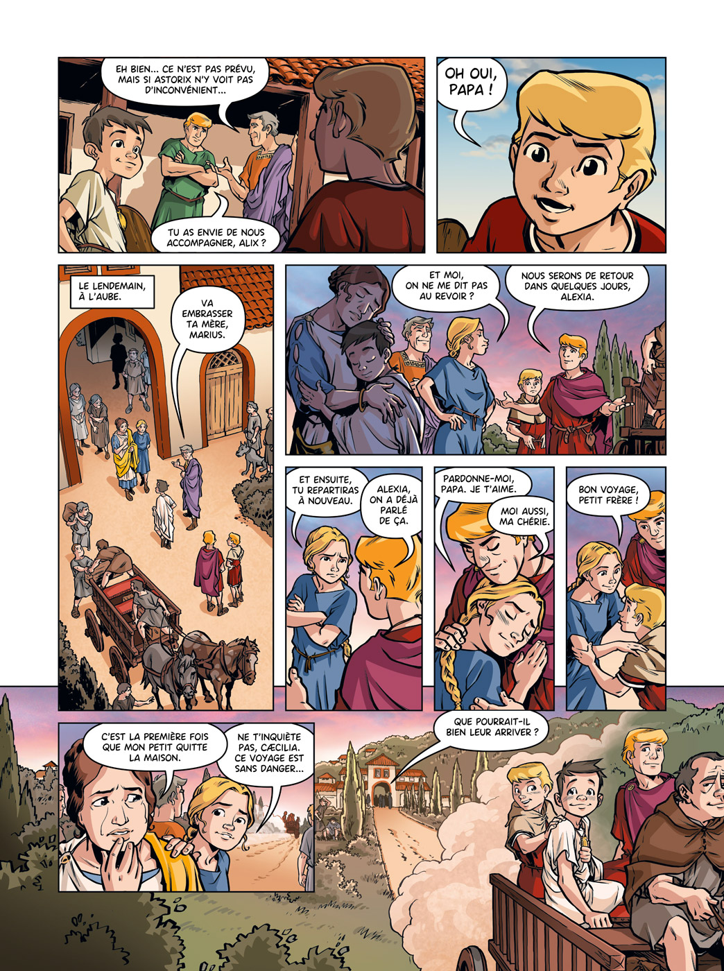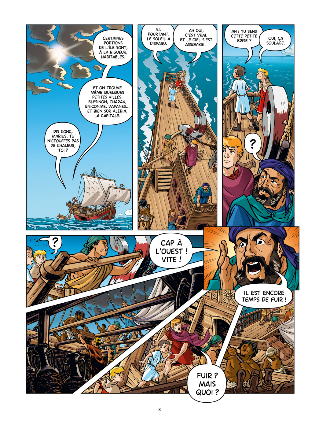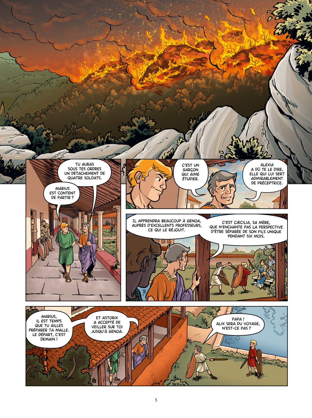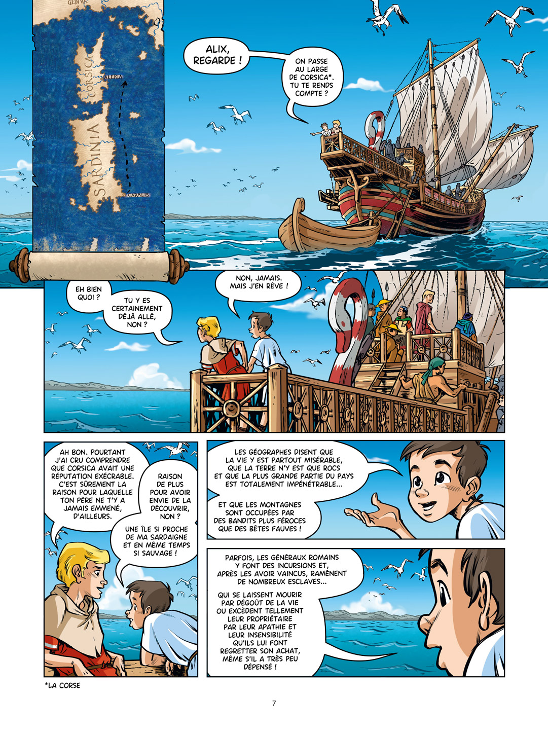 Après l’Égypte, Marc Bourgne (Michel Vaillant – Nouvelle Saison) entraîne Alix dans sa version adolescente de la Sardaigne vers la Corse voisine pour une nouvelle aventure très rythmée et plaisante où il découvre les paysages de l’île, certes dévastée par les flammes ici, et ses habitants réputés exécrables et ayant une farouche mentalité indépendante. Le récit continue de poser judicieusement les bases du personnage créé par Jacques Martin et qui, comme les précédents, mêle fiction et réalité historique de manière assez subtile mais surtout de façon suffisamment intelligible pour les plus jeunes dès 8 ans. D’ailleurs, un QR code en page 2 donne accès à des fiches pédagogiques à destination des enseignants et des élèves afin d’étudier la série en classe. Saluons le clin d’œil à la langue corse par le biais de quelques mots placés de-ci de-là. Laurent Libessart (Moréa) reprend le relais d’Olivier Weinberg pour la mise en images de ce cinquième opus. Le dessinateur assure une prestation de très belle facture dans le style voulu par la charte graphique de la série qu’il a créée dès le premier tome et qui est parfaitement en phase avec les attentes du public cible. L’ensemble est colorisé avec goût par Florence Torta.