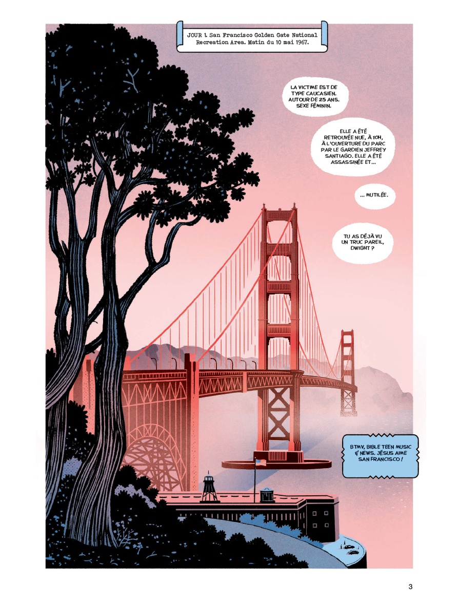 Maxime le Forestier et Nicolas Peyrac n’ont rien à voir avec cette histoire qui se déroule pourtant à San Francisco. Nous sommes en 1967 et une jeune étudiante est retrouvée morte près du Golden Gate. Contrairement à Pamela Rose, qu’on retrouvera bien plus tard, à Bornsville, avec une clé a molette plantée entre les omoplates et une bougie enfoncée dans la gorge, et qui n’a rien à faire non plus dans cette histoire, l’étudiante retrouvée ici a une marque satanique tracée au couteau sur le ventre. Le lieutenant chevronné Ulysses Ford et la jeune inspectrice Kim Tyler sont chargés de l’enquête, et décident de cuisiner le Baron Yeval, escroc bien connu très suivi pour les messes noires qu’il organise…
