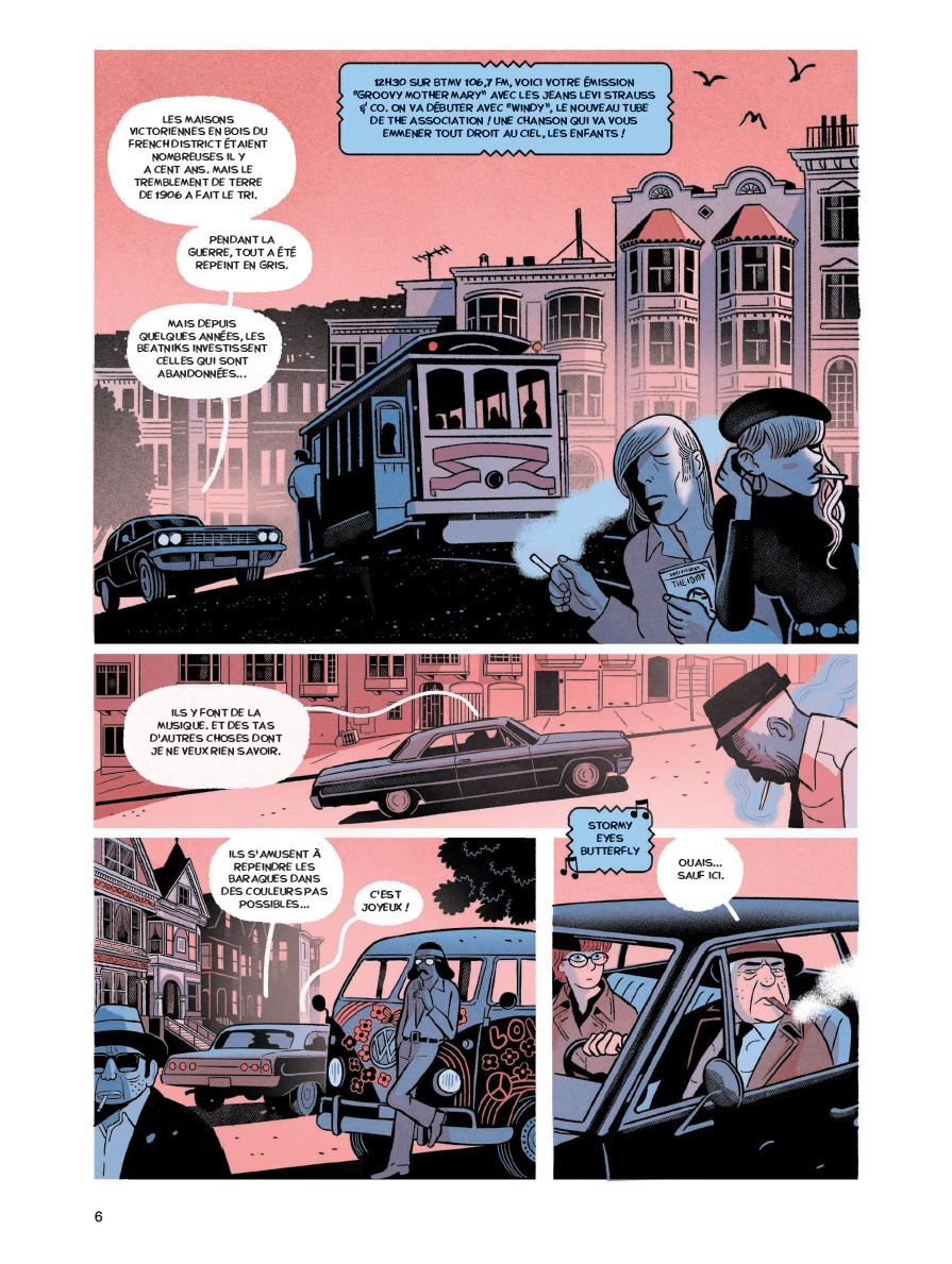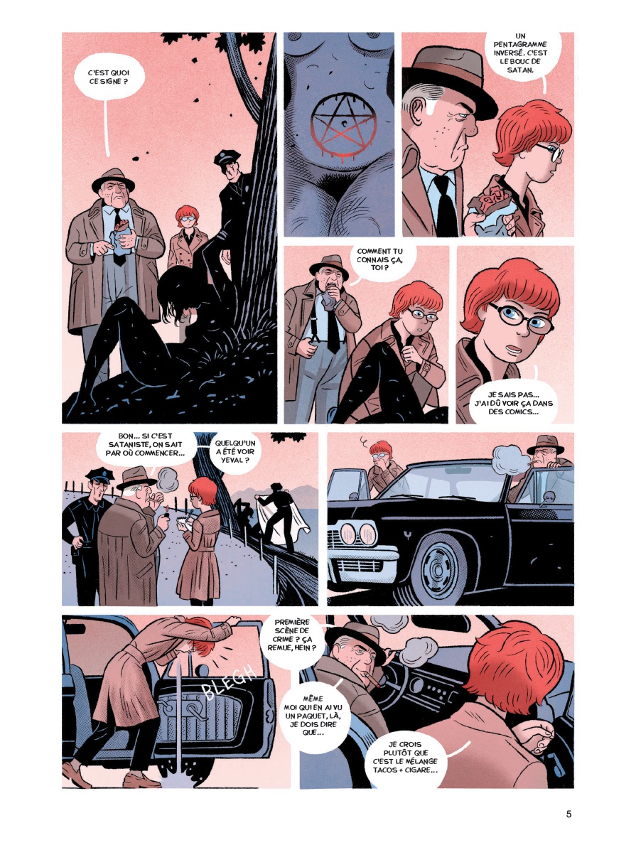 Après avoir publié ensemble Le Labo chez Dargaud, Hervé Bourhis et Lucas Varela entament cette nouvelle série policière aux éditions Dupuis. Le premier, en vieux briscard de scénariste, parsème cette enquête de petits détails sympathiques qui rythment les différentes séquences, comme ces bulles bleues débitant les paroles d’un animateur radio. La réussite de l’album repose ensuite sur deux envies du scénariste, plutôt bien exploitées, à savoir un personnage principal féminin (starring Kim Tyler en femme flic maline et flegmatique) et l’incursion dans l’intrigue d’un ersatz de papier d’Anton Lavey, le pape du satanisme aux États-Unis. Les ingrédients fonctionnent bien et le trait et les couleurs de Lucas Varela, collaborateur du moment tout trouvé pour cette mission, apportent une très grande lisibilité et de belles nuances de rouge au pays du polar noir.