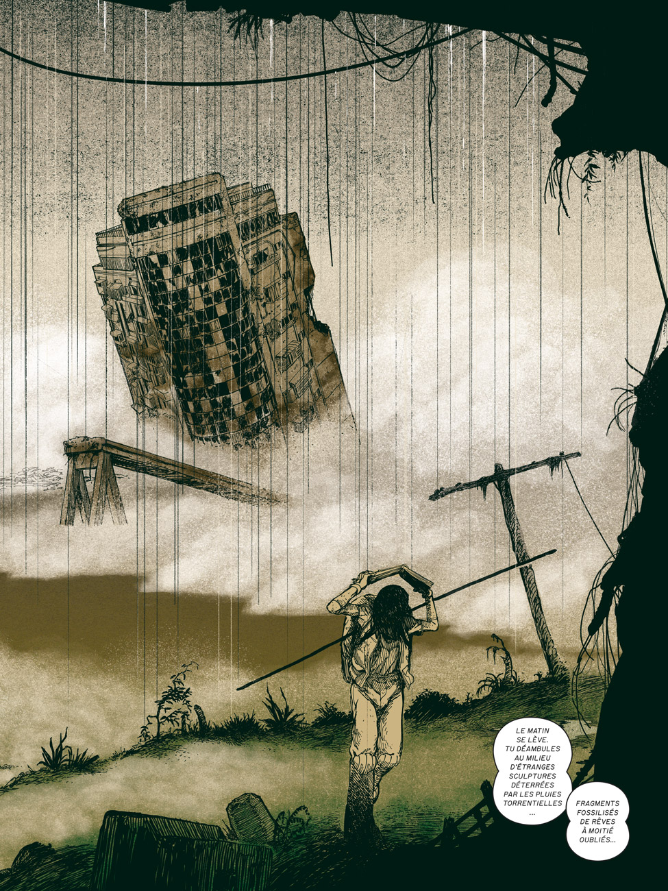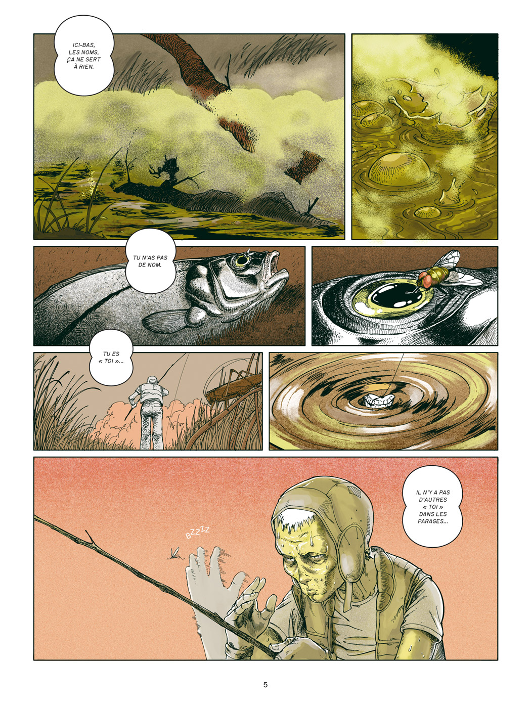 L’Arpenteur est assurément une des très belles surprises de ce début d’année. En effet, le designer, illustrateur et artiste néerlandais Viktor Hachmang y développe un récit de science-fiction digne des meilleurs récits du genre, qui puise une partie de son inspiration de l’incontournable Métal Hurlant. Si le devenir de la Terre que l’auteur propose comme base de départ est clairement dystopique, il n’en est pas moins qu’il est tout à fait plausible en regard de la situation actuelle de notre belle planète bleue, véritable allégorie de ce que pourrait être le monde de demain si les climato-sceptiques continuent leur travail de sape. L’auteur découpe l’histoire en quatre chapitres intitulés comme les quatre saisons et nous fait donc vivre une année de l’errance terrestre de Geo, l’Arpenteur. Du fait de sa solitude forcée et irréversible, il cogite, se raccroche au livre trouvé, La Tempête, et son psychisme en vient même à donner vie à l’un des personnages de l’oeuvre de Shakespeare, Ariel, l’esprit positif de l’air et du souffle de vie maîtrisé par Prospero, que l’éboueur de l’espace croit voir puis rencontre finalement (mise en abyme). La retranscription graphique qui en est proposée est au diapason avec un caractère protéiforme marquant (croisement entre BD et Beaux-Arts), des mises en page originales et une colorisation qui use de teintes fluorescentes, c’est-à-dire des couleurs chimiques et non-naturelles en phase avec l’univers ambiant.