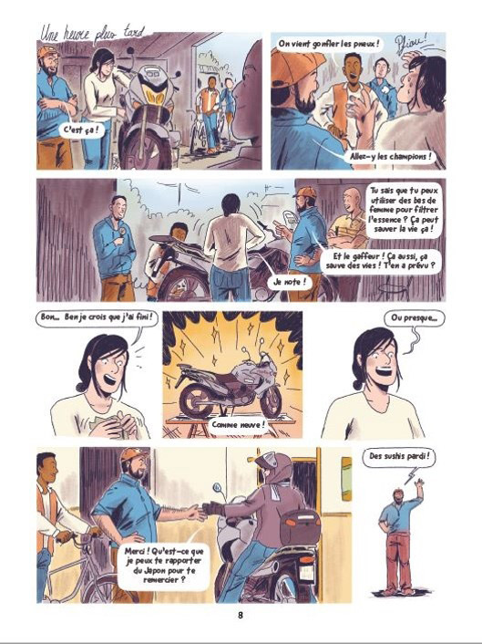 Back to Japan se destine à tous ceux qui aiment l’aventure et ses héros anonymes. Ici Mélusine Mallender s’est associée à Laure Garancher pour raconter son histoire hors du commun. La motarde démontre au fil du récit une résilience à toute épreuve pour atteindre son but mais il ne faut pas oublier l’autre personnage principal qui n’est autre que sa Varadero. Promise à la casse, sa moto va confirmer qu’elle a une endurance certaine. La relation entre Mélusine et sa Honda est comparable à une histoire d’amitié. Pour illustrer cet album de 163 pages, Clémentine Fourcade nous immerge dans le quotidien de l’héroïne tantôt compliqué à bien des égards tantôt réconfortant au gré des rencontres, dans des planches réalisées en couleurs, mis à part pour les scènes de flash-backs où la dessinatrice a opté pour une monochromie idéale pour dissocier le présent du passé.