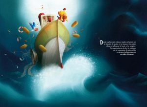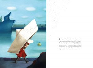 Elle vit en bord de mer et est attirée depuis toujours par les bateaux. Elle adore écouter les histoires que se transmettent de père en fils ces marins… De père en fils ! C’est bien le problème pour Amalia. Mais pourquoi n’aurait-elle pas accès elle aussi aux bateaux, à la mer et à tout ce qui en découle ? Amalia ne résiste pas à cet appel si fort qui l’entraîne sur un bateau de papier navigant sur cet océan qui l’attire tant. Rêve ou réalité, peu importe. On se laisse porter par une vague pleine de poésie dans laquelle l’océan accompagne cette petite fille qui sera obligée de prouver ses capacités à agir « à contre-courant » de son sexe. La mer, l’océan et ses nombreux habitants, les vagues, tout est superbement rendu par Eric Puybaret dans des tons assez extraordinaires, tout comme les personnages.