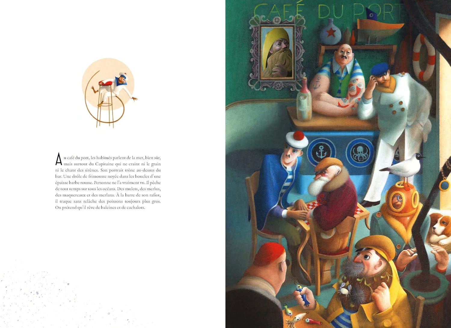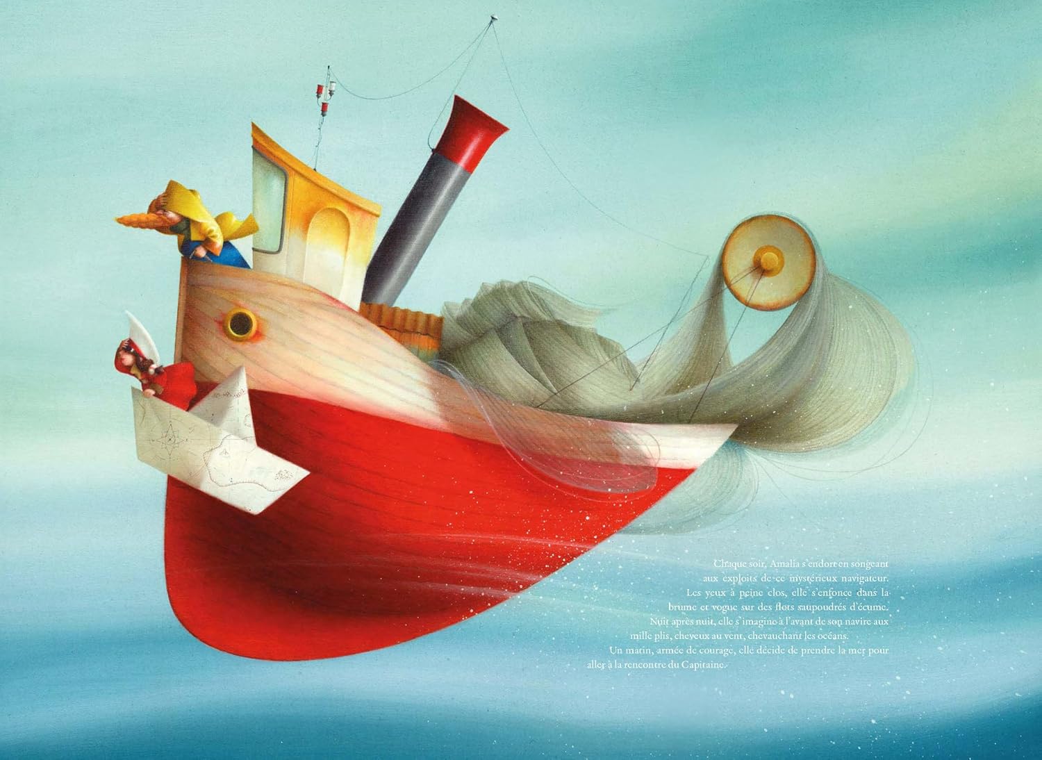 Comment ne pas rêver de partir en mer lorsque depuis l’enfance on est bercé par des histoires de marins et de bateaux ? Amalia est fascinée par ce monde d’hommes et d’océans. Mais c’est dans un bateau de papier, qu’elle porte sur son dos sous les moqueries des gens, qu’elle met son espoir de grand large. Nuit et jour, l’enfant rêve de suivre les exploits du Capitaine dont le portrait décore le mur du café du port. Un jour, elle se décide à prendre la mer. Amalia apprécie la proximité de dauphins quand soudain le ciel devient noir et le vent se transforme en ouragan.