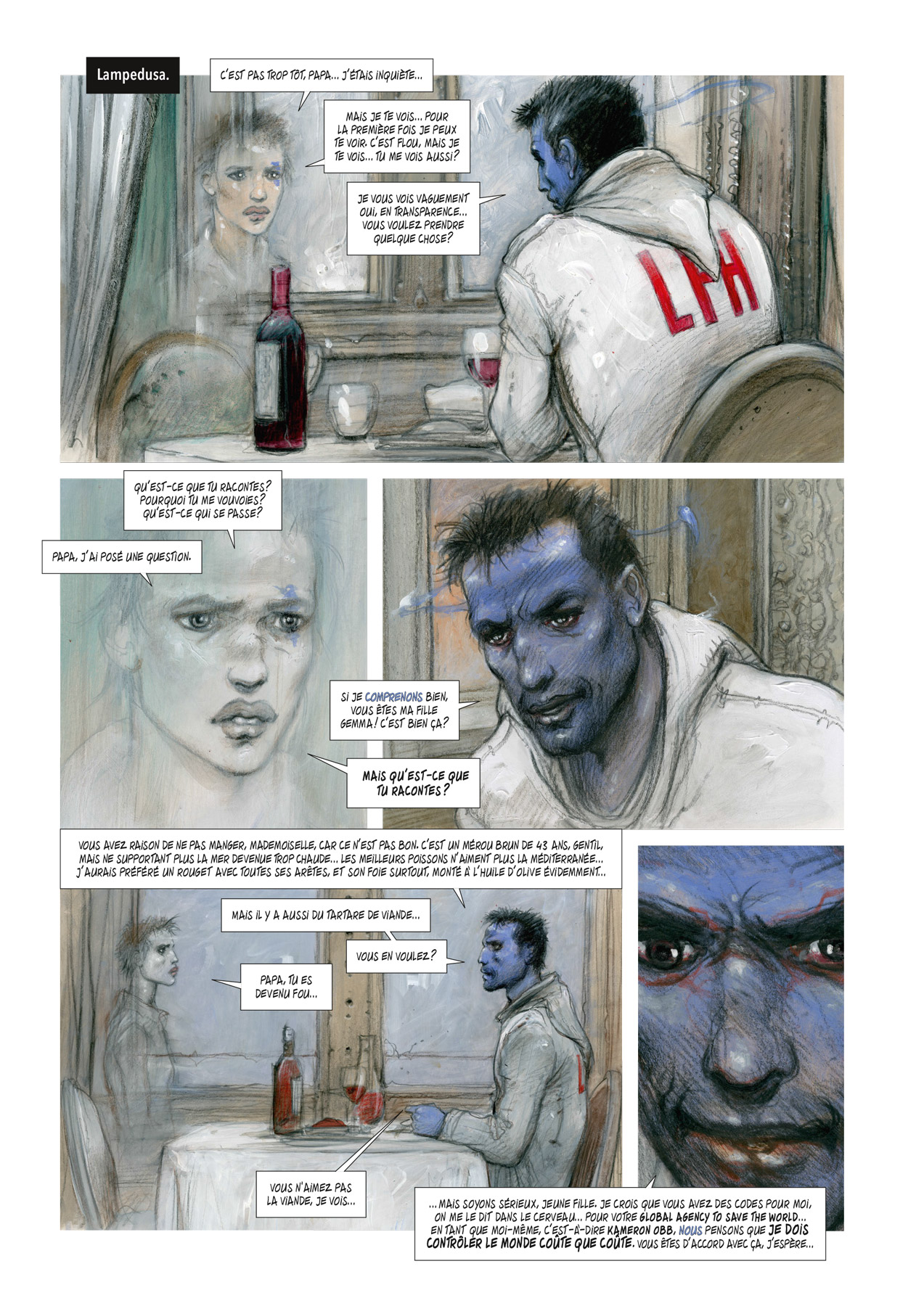 2042, ère du bug planétaire qui a rendu impossible l’accès aux données numériques. Désormais installé à l’hôpital sur l’île de Lampedusa où il a échoué, l’hypermnésique Kameron Obb est touché par un dédoublement entre le Bien et le Mal qui met sa santé mentale à rude épreuve, comme si une entité, un dieu, avait pris possession de son esprit. Malgré cela, se fille Gemma rentre en contact avec lui de manière immatérielle, le temps d’échanger quelques mots et de lui communiquer des codes. Faisant toujours l’objet de toutes les convoitises, il est localisé par la Novo-Tsarine Yulia qui envoie Awden Marxoe, un de ses anciens amis, en direction de Lampedusa. Bien sûr, il n’est pas le seul à se rendre en Méditerranée, à l’image d’Okto Dusapin, un autre ancien ami, à bord de son sous-marin Staller IV. De son côté, la présidente française déclenche l’intervention de forces à proximité de l’île. Gemma veut en être ! Pendant ce temps, Junia, la medecine-woman d’Obb, accompagnée de Fathma, pénètre dans l’hôpital alors que le corps du directeur de l’établissement, qui vient de mourir, brûle encore. Quelques instants après, le Mal prend le contrôle de Kameron !