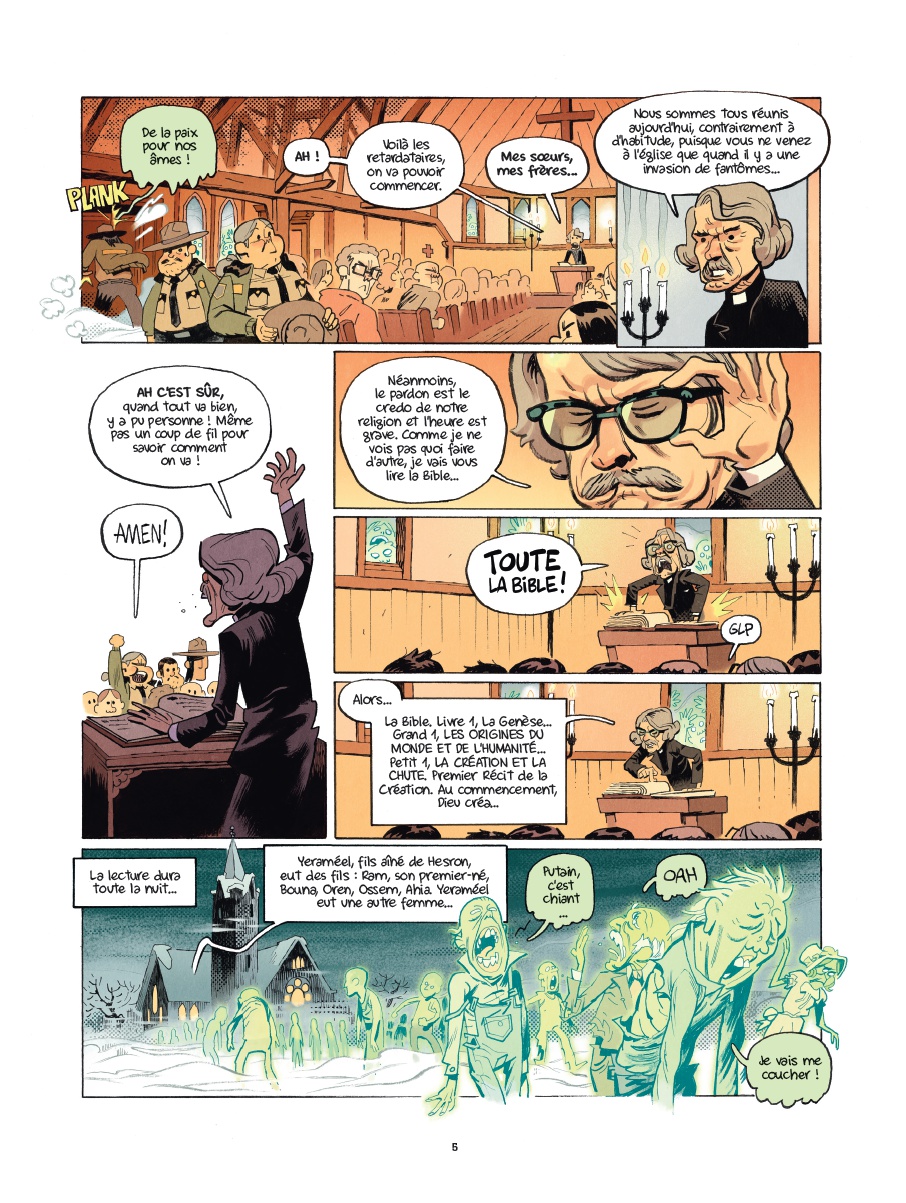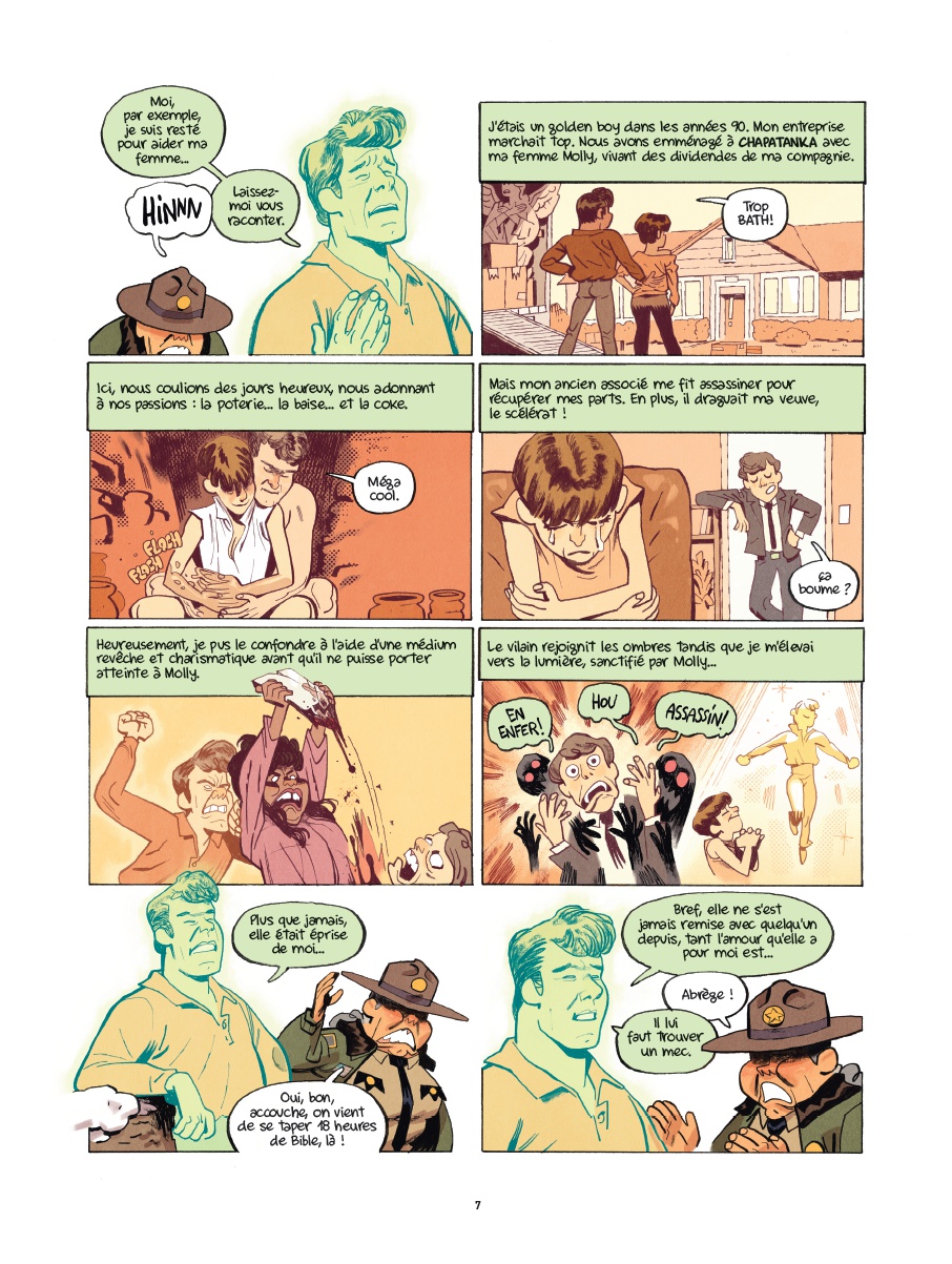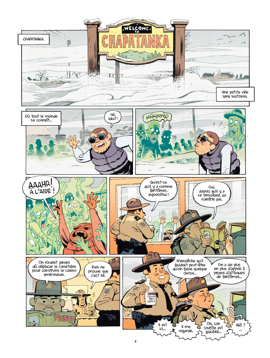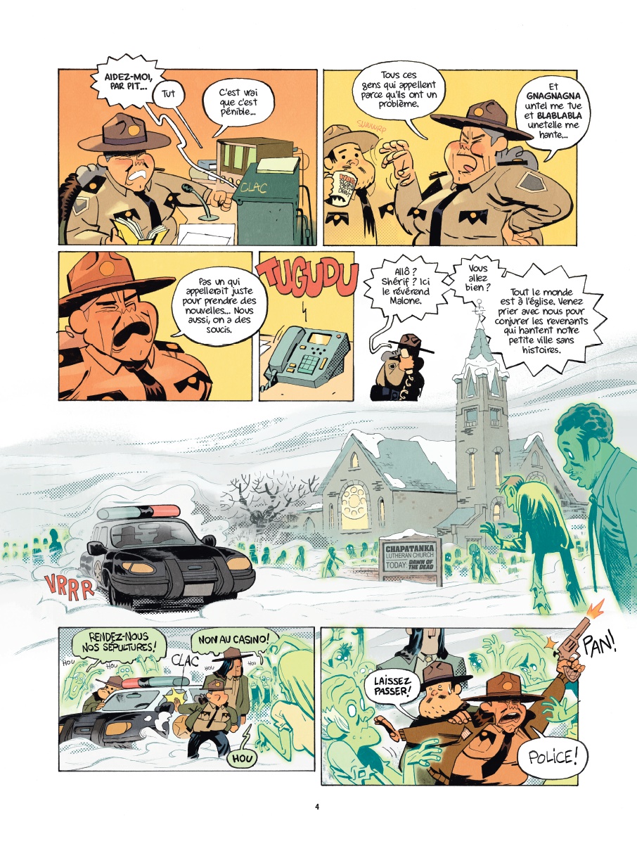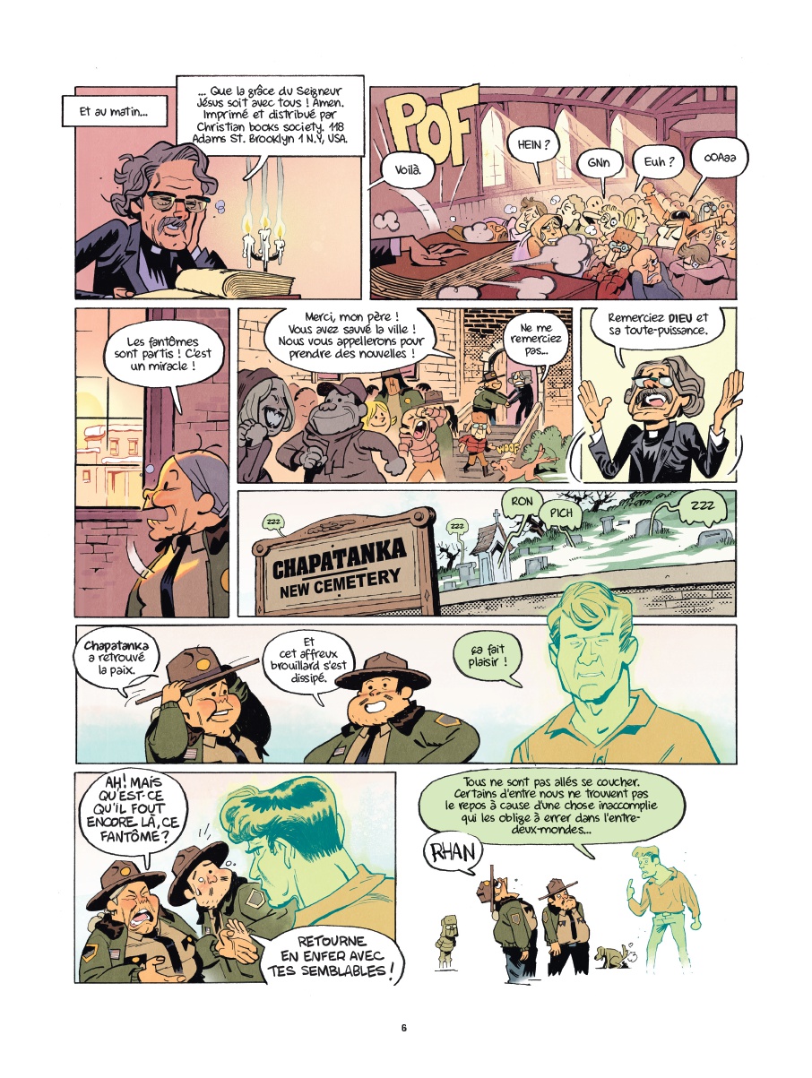 Le premier opus de Chapatanka nous avait enthousiasmé, le second allait-il être du même acabit ou décevoir son lectorat ? Il semblerait bien que la première option soit la bonne puisque Jocelyn Joret et B-gnet réussissent à se renouveler avec leurs histoires tout en conservant l’ADN humoristique du précédent tome. Les clins d’œil cinématographiques s’enchaînent au fil des différentes histoires, Bill Murray tenant d’ailleurs une place de choix avec évidemment son rôle dans SOS Fantômes mais également dans Un jour sans fin. Chaque film est une occasion pour la shérif et ses acolytes d’évoluer aux côtés de revenants aussi dangereux que touchants. L’humour décalé et les bonnes idées s’enchaînent sans que le rythme ne fléchisse, pour notre plus grand plaisir. Les trognes des personnages de Jocelyn Joret sont à mourir de rire et, malgré leur sérieux, leurs attitudes et expressions faciales font mouche à tous les coups.