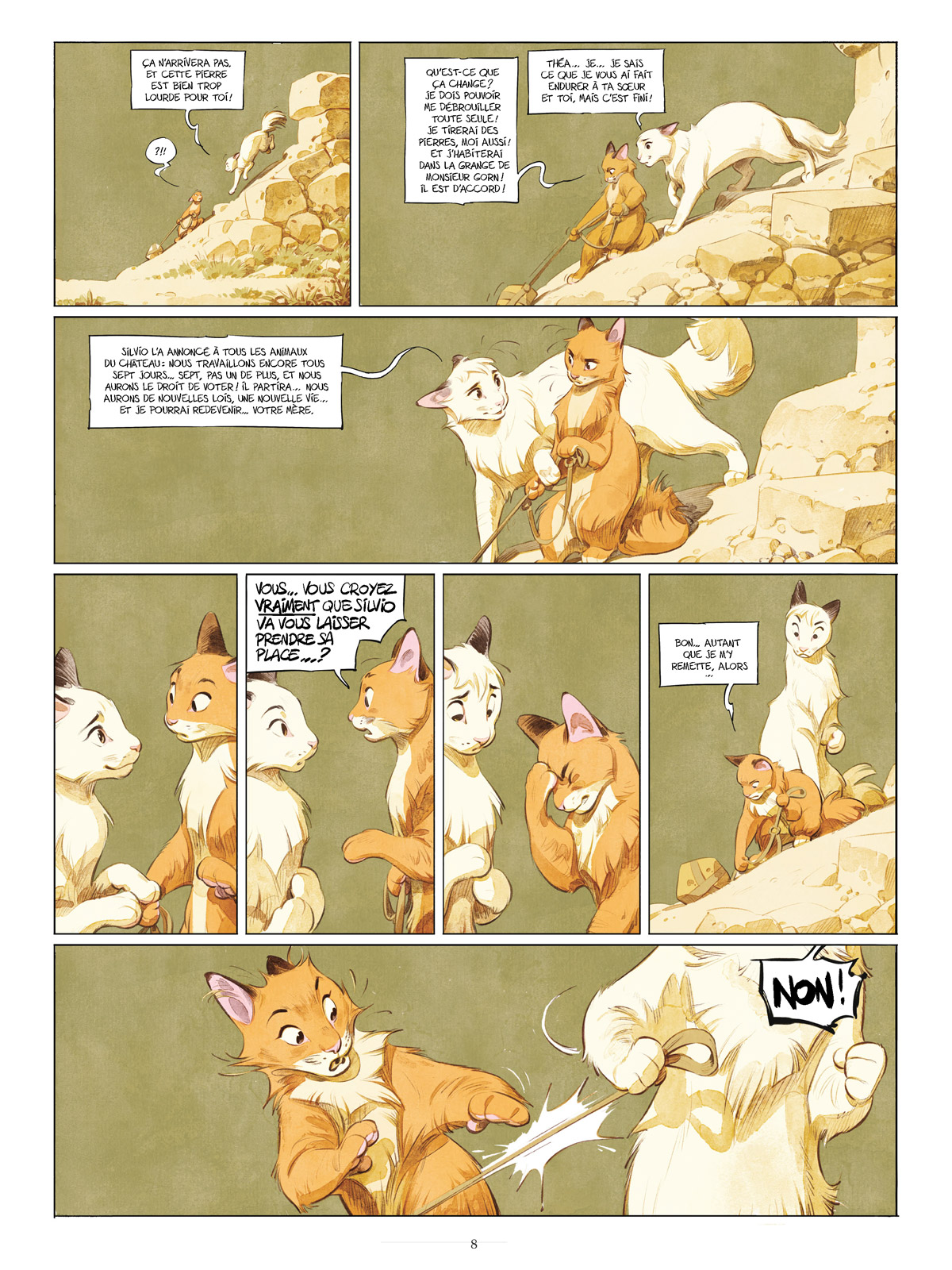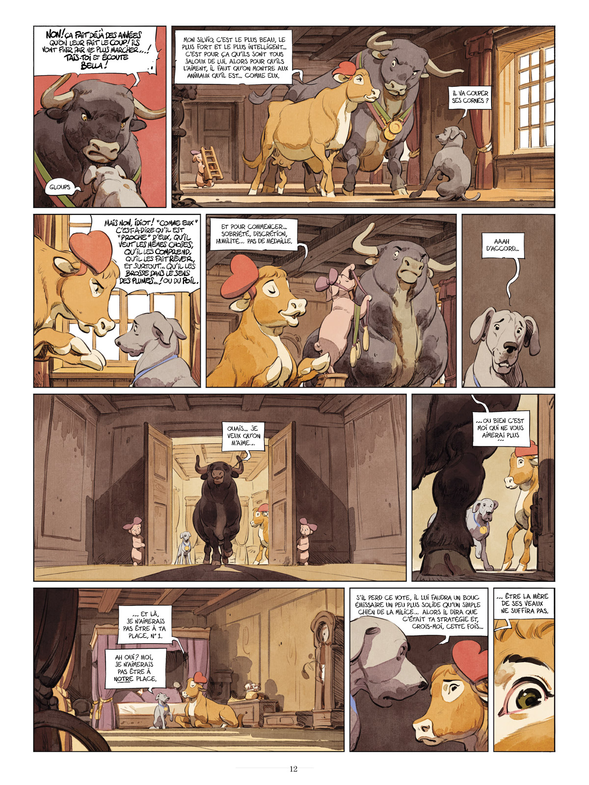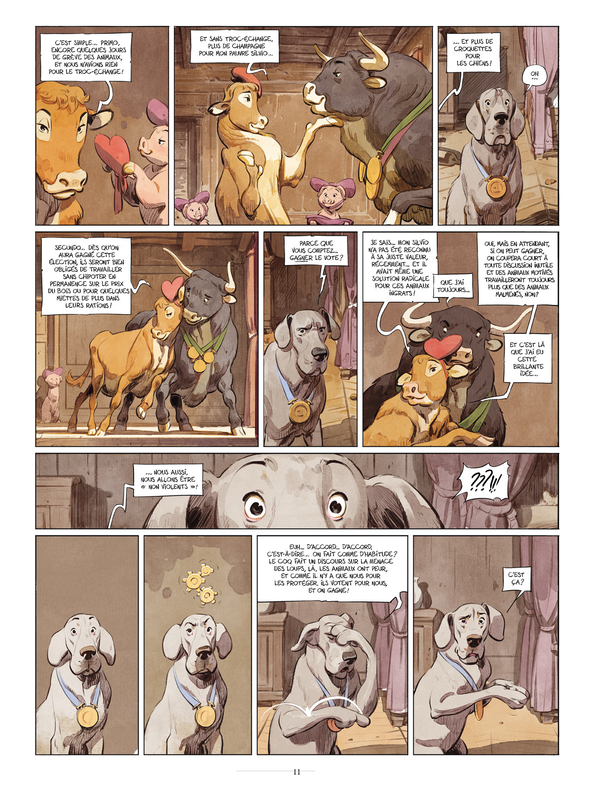 Il reste sept jours avant le vote consenti par Silvio qui remet donc en jeu son mandat, une petite victoire pour le Mouvement des Marguerites. Pendant la campagne électorale, le taureau-despote donne de sa personne et partage le quotidien des animaux du Château. Affable, il va aux champs et promet monts et merveilles à qui veut bien l’entendre. Le cruel Silvio aurait-il enfin changé ? Que nenni ! Il ne s’agit là que d’une apparence car il suit le plan que Bella, sa tendre épouse, lui a soufflé. Un plan que ses chiens de garde, numéro un en tête, ont bien du mal à comprendre. Cependant, par deux occasions, la vache joue un double jeu en n’hésitant pas à se rapprocher de Miss B. puis de César pour assurer ses arrières ainsi que ceux de ses veaux en cas de défaite de son mari. Malheureusement pour elle, numéro onze en est témoin et rapporte les faits à Silvio qui rentre dans une colère noire et prend une décision irréversible, lourde de conséquences. Peu après après avoir décrypté un message de Bella, Azélar fait une découverte dans le glacier du palais qui pourrait bien changer le cours de l’élection. Est-ce que cela sera suffisant ou faudra-t-il un dernier acte héroïque des animaux pour faire tomber le dictateur et enfin retrouver leur liberté ?