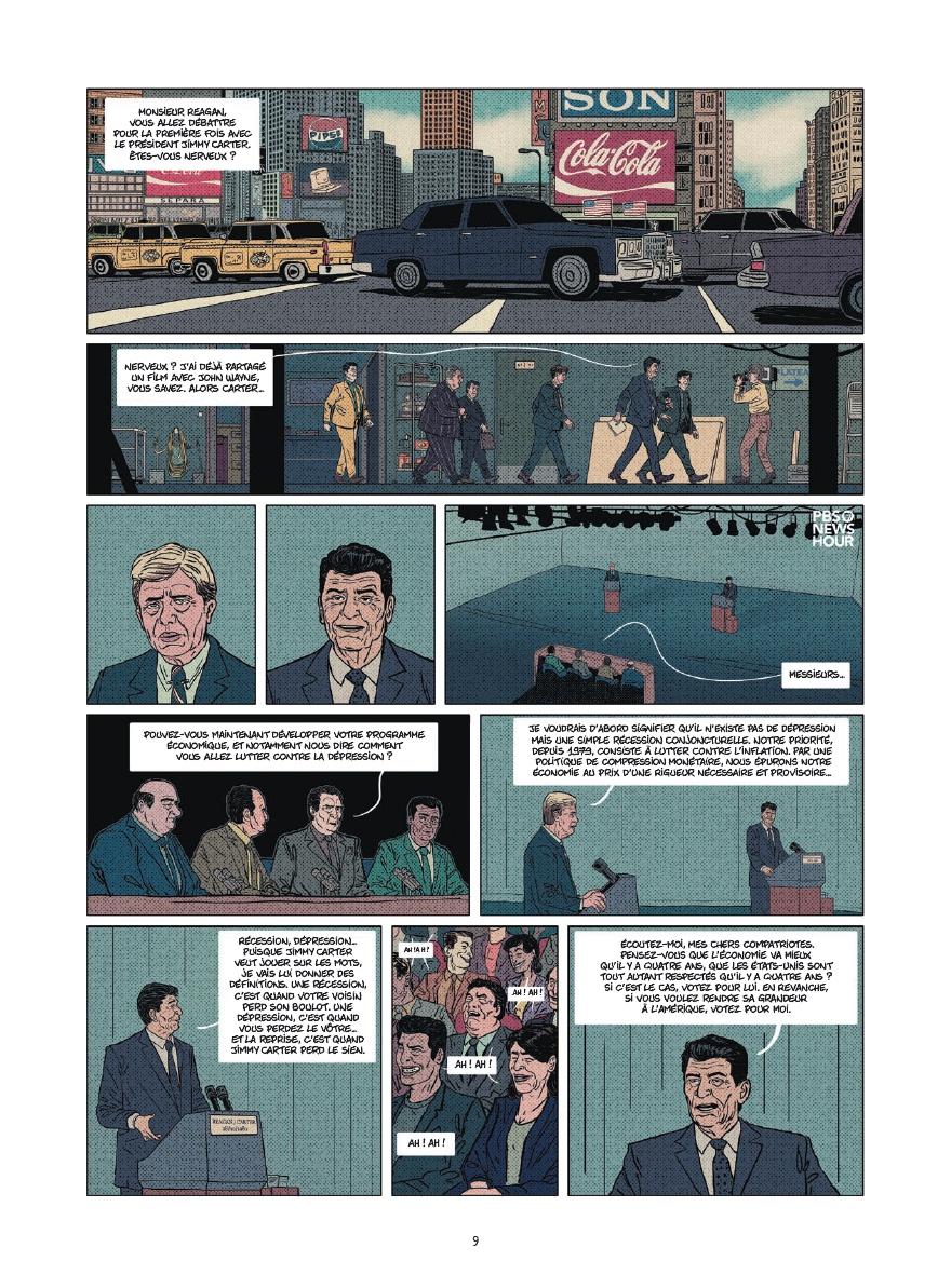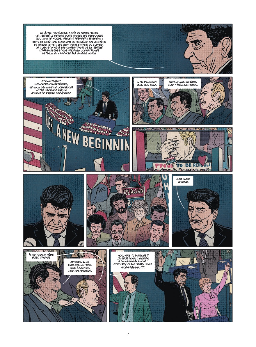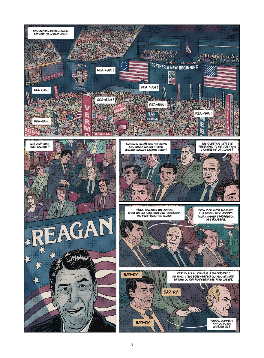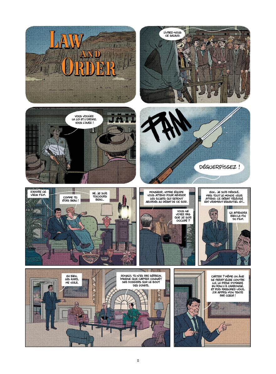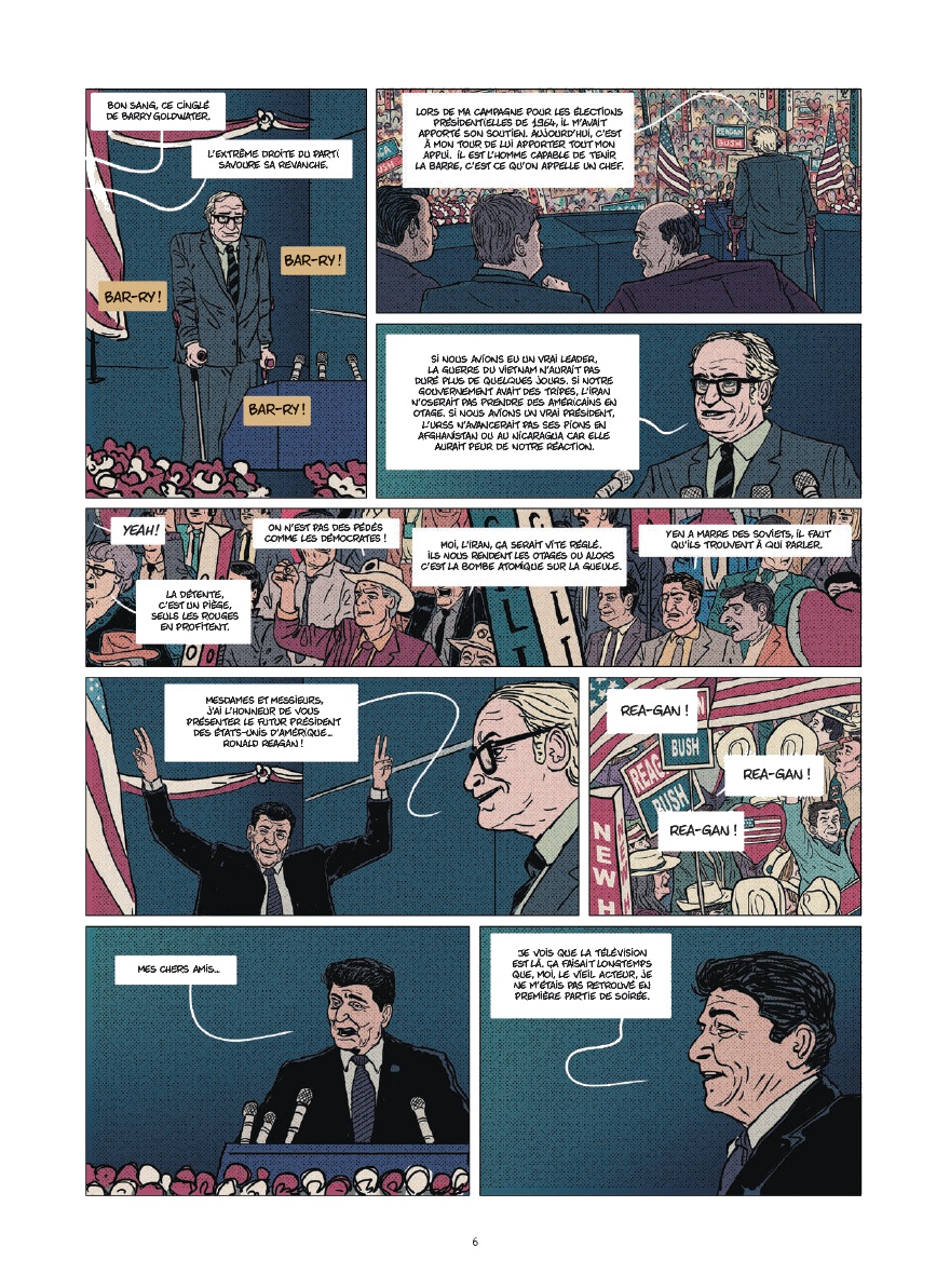 Même pour ceux qui connaissent un peu l’Histoire de la guerre froide, il reste intéressant de découvrir ce personnage qu’était Ronald Reagan. A la fois déroutant et efficace (malgré lui ?), ce président des Etats-Unis, élu à deux reprises, fait penser par bien des aspects au président actuel, dont on n’a pas besoin de citer le nom pour savoir de qui l’on parle. Jean-Yves Le Naour cerne parfaitement Reagan et offre, au fil de l’album, des moments très drôles. On pense par exemple à la collection de blagues de ce dernier mais aussi à sa maîtrise d’une seule et unique phrase en russe dont il abuse auprès de son homologue soviétique. Ce récit très instructif n’aurait pas pu l’être sans un style graphique en adéquation avec le sujet et la façon dont il est traité. Ainsi, Cédrick Le Bihan use d’un style réaliste tout en s’autorisant des faciès moins sérieux et même cartoonesques par moment pour coller à l’ambiance de la scène.