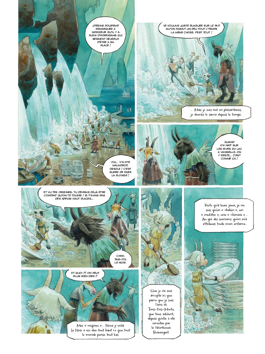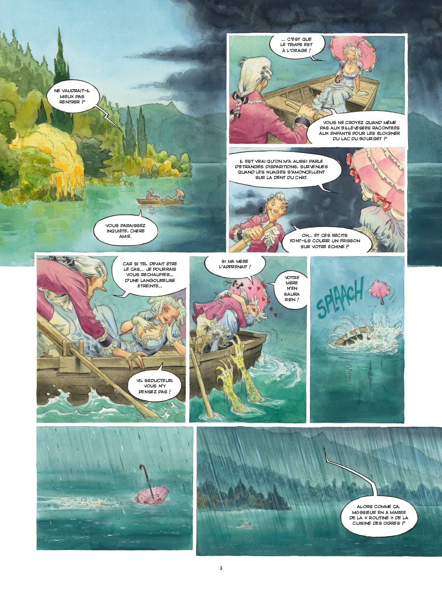 La Cuisine des Ogres avait été un magnifique succès critique que les lecteurs avaient encensé à sa sortie. C’est donc tout naturellement, et sans grande surprise, qu’une suite fut entreprise rapidement pour prolonger cet étrange voyage dans un univers de contes porté par des personnages attachants. Dans ce deuxième volume, Fabien Vehlmann se détache de sa précédente héroïne pour mieux s’intéresser à un autre protagoniste dont l’histoire restait à raconter. En suivant Brèche-Dent, on replonge ainsi dans les coulisses de la fameuse cuisine, notamment la brigade Tout-Sucre chargée des desserts. L’idée est maline et contribue à exploiter tous les mystères de ces lieux avant d’initier un voyage périlleux rempli de créatures étranges, parfois inquiétantes parfois amusantes, et nourrie de légendes et de contes (une scène rappellera immanquablement Les Aventures de Pinocchio de Carlo Collodi). Inspiré par ce monde où tout ou presque est possible, le scénariste offre un fabuleux terrain de jeu pour Jean-Baptiste Andreae qui, une fois encore, semble s’éclater à mettre en scène ces péripéties extravagantes. Compositions, couleurs, trognes, tout est une invitation au rêve (ou au cauchemar) et on se régale.