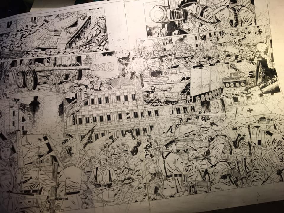 J’ai déjà réalisé la moitié du tome 2, il me restera ensuite le tome 3 à faire pour conclure le triptyque puis je m’attaquerais à mon projet sur la LVF. J’ai également d’autres projets en tant que scénariste, j’ai écrit un scénario sur la poche de Colmar, une région que je connais bien car c’est du côté de chez moi. C’est une bataille du même style que dans les Ardennes mais beaucoup moins connue, pourtant il y a eu des villages entiers rasés. Le dessinateur n’est pas encore choisi mais je cherche plutôt un dessinateur ligne claire, comme Olivier Dauger, parce que je veux vraiment que ça soit accessible à un large public. J’aimerais que ce soit un album que l’on pourrait présenter dans les collèges et dans les lycées de la région pour faire connaître l’Histoire de celle-ci aux plus jeunes.
