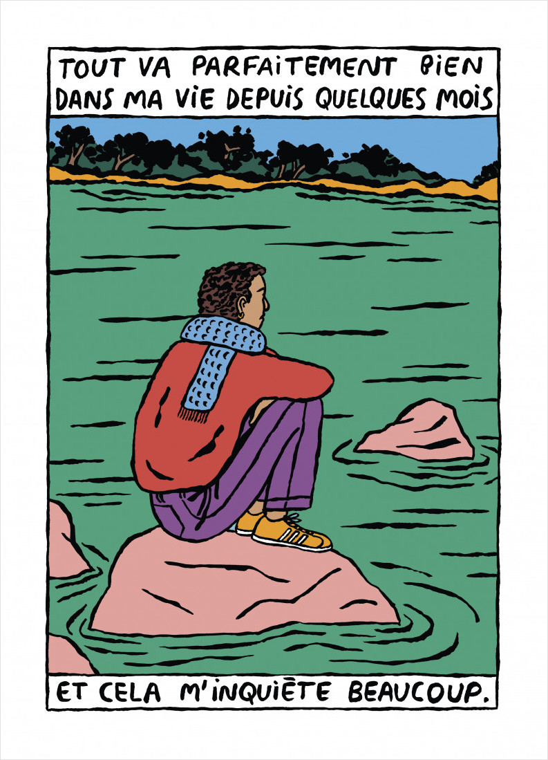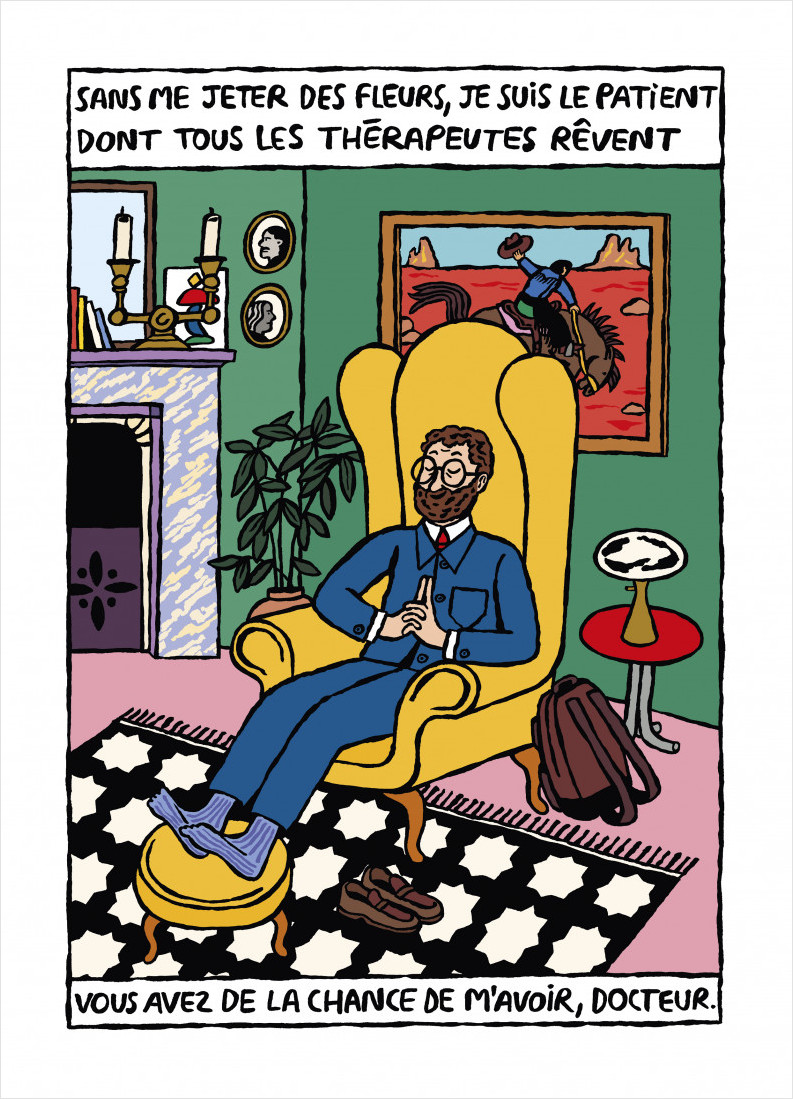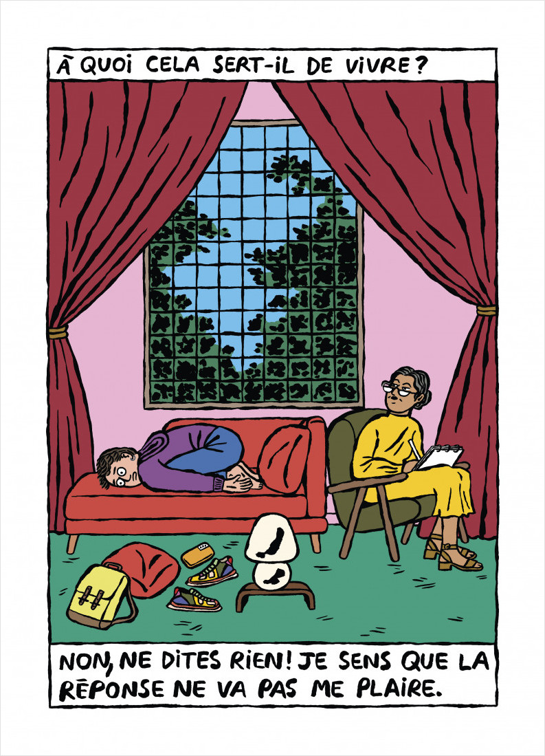 Un patient prostré sur le divan qui demande à quoi sert de vivre avant de se raviser car il sent que la réponse de sa psy risque de ne pas lui plaire ; un homme assis sur un rocher au milieu de l’océan qui s’inquiète parce que tout va étrangement bien dans sa vie ; le patient qui « sans vouloir [s]e jeter de fleurs » s’auto-déclare « le patient dont tous les thérapeutes rêvent » ; une patiente ravie de son analyse car elle pourra désormais faire les mêmes erreurs « mais en sachant pourquoi ». Toutes et tous se succèdent chez le ou la psy ou s’épanchent au mauvais endroit…