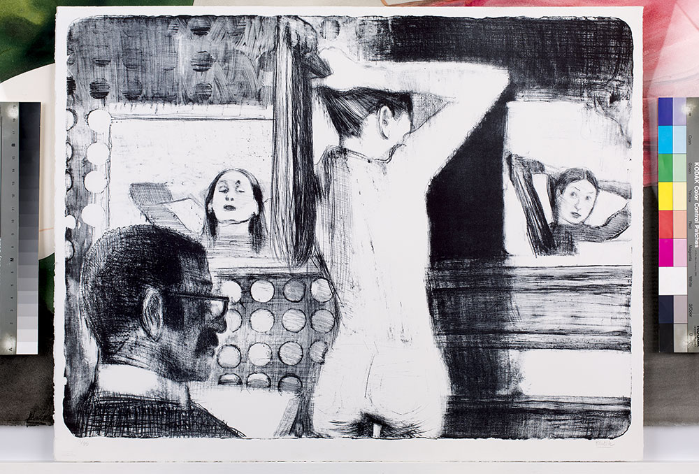 Lithographie : Procédé d’impression à plat d’un dessin réalisé le plus souvent sur une pierre calcaire. Cette technique est fondée sur le principe de l’antagonisme entre l’eau et les corps gras.
