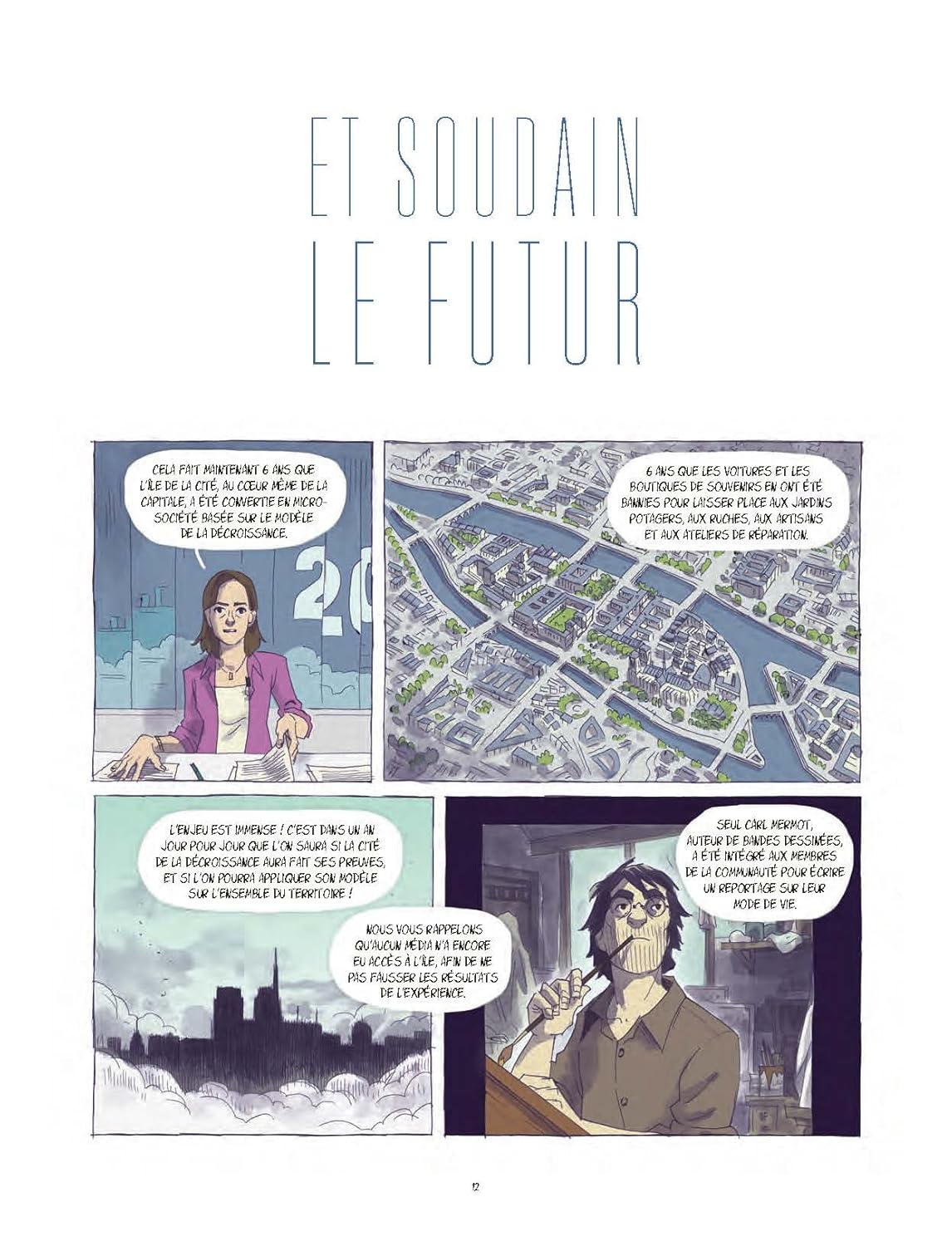 Voilà déjà six ans qu’une extraordinaire expérience humaine et sociologique a vu le jour en plein Paris, afin de tester et préparer tout le pays à la décroissance tant redoutée par beaucoup. Toute l’île de la Cité a été ainsi isolée du reste de la société pour y faire vivre une communauté autonome, représentative de la population. Un nouvel élément y fait toutefois son apparition en la personne de Mila, qui sort de prison pour l’occasion. Pour Carl, un auteur de BD devant relater l’aventure, elle est celle qui lui permettra de savoir comment raconter cette histoire…