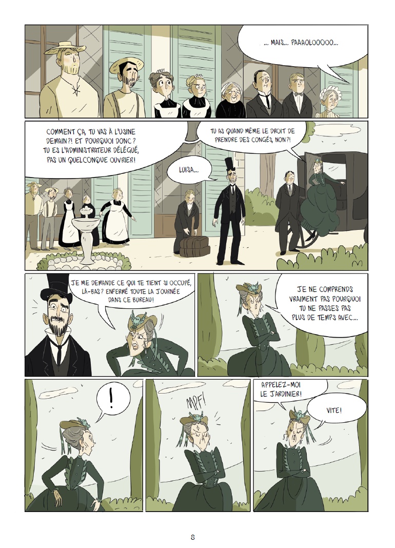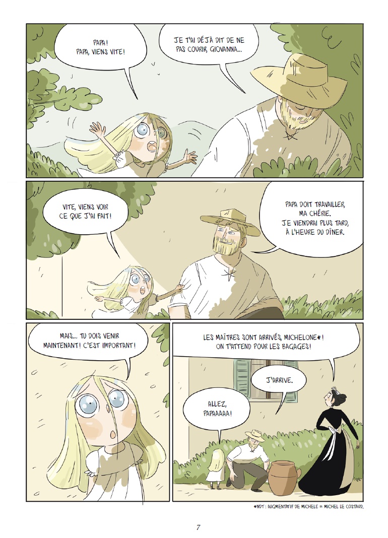 Elena Triolo revisite Pinocchio de façon originale puisque c’est plutôt l’histoire de sa création et tout ce qui tourne autour qui trouve ici tout son sens. La Fille aux cheveux turquoise est avant tout une histoire pleine d’humanité et de rencontres qui se font au fil du temps. En effet, le lecteur suit la vie de Giovannina, de sa plus tendre enfance jusqu’à sa mort, elle qui fut le témoin privilégié de cette création littéraire qui fait encore rêver petits et grands de nos jours. On se laisse emporter par cette jolie histoire animée par des personnages qui ont construit leur amitié au fil du temps. Ces derniers, sous le trait d’Elena Triolo, dégagent une telle expressivité à travers leurs yeux que l’on ne peut rester insensible à leur destin.