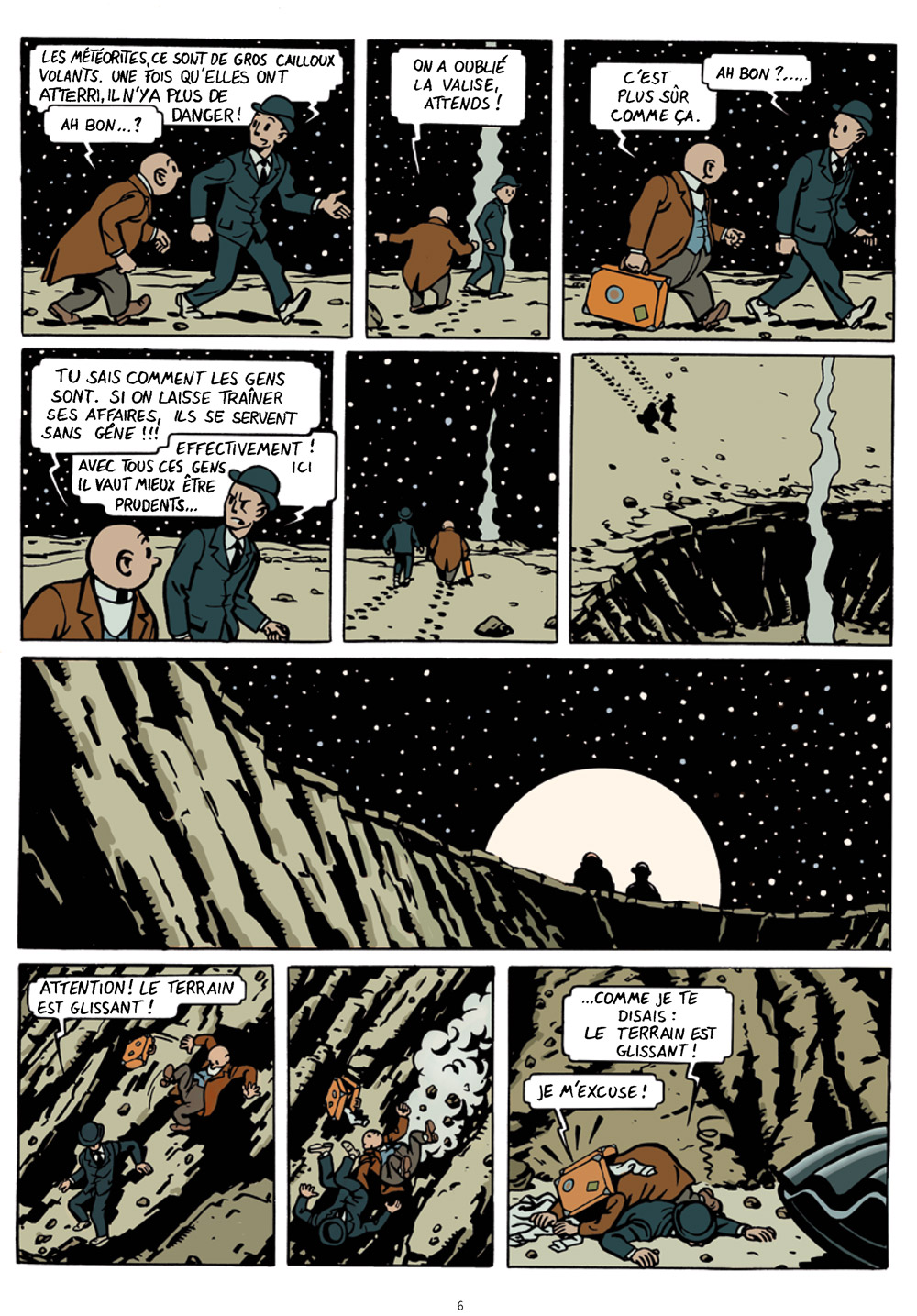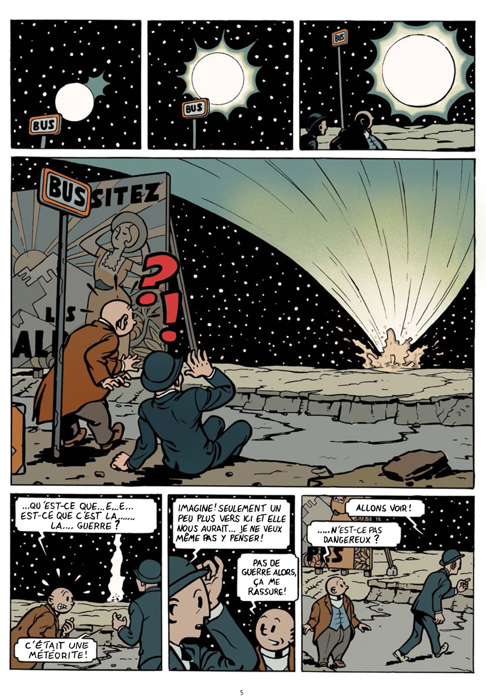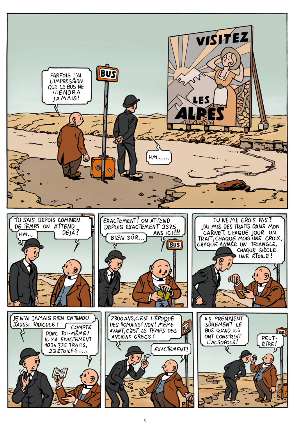 N’éprouvant pas suffisamment de plaisir en lisant les bandes dessinées parues après les années 1960, M. C. Breton a décidé de dessiner les albums qu’il aurait envie de lire… En résulte cette aventure parfaitement loufoque au trait rétro, évoquant de grandes figures comme Hergé et Jacobs mais aussi Tillieux ou Will (Pompon ayant clairement des faux airs de Tif). Si ces Fissures nous font au départ assez naturellement penser à En attendant Godot de Samuel Beckett, l’irruption du bébé déposé par la météorite fait basculer dans un monde encore plus absurde où le bébé devient en quatre planches une jeune femme puis lance les deux héros sur la piste d’une mystérieuse fontaine qui pourrait sauver le monde et arrêter ces fissures qui le morcèlent. Évidemment, nous ne voulons pas trop en dire mais ne fuyez pas devant cette description : si l’auteur fait évoluer son histoire au fil de l’avancée des planches, le résultat est réussi !