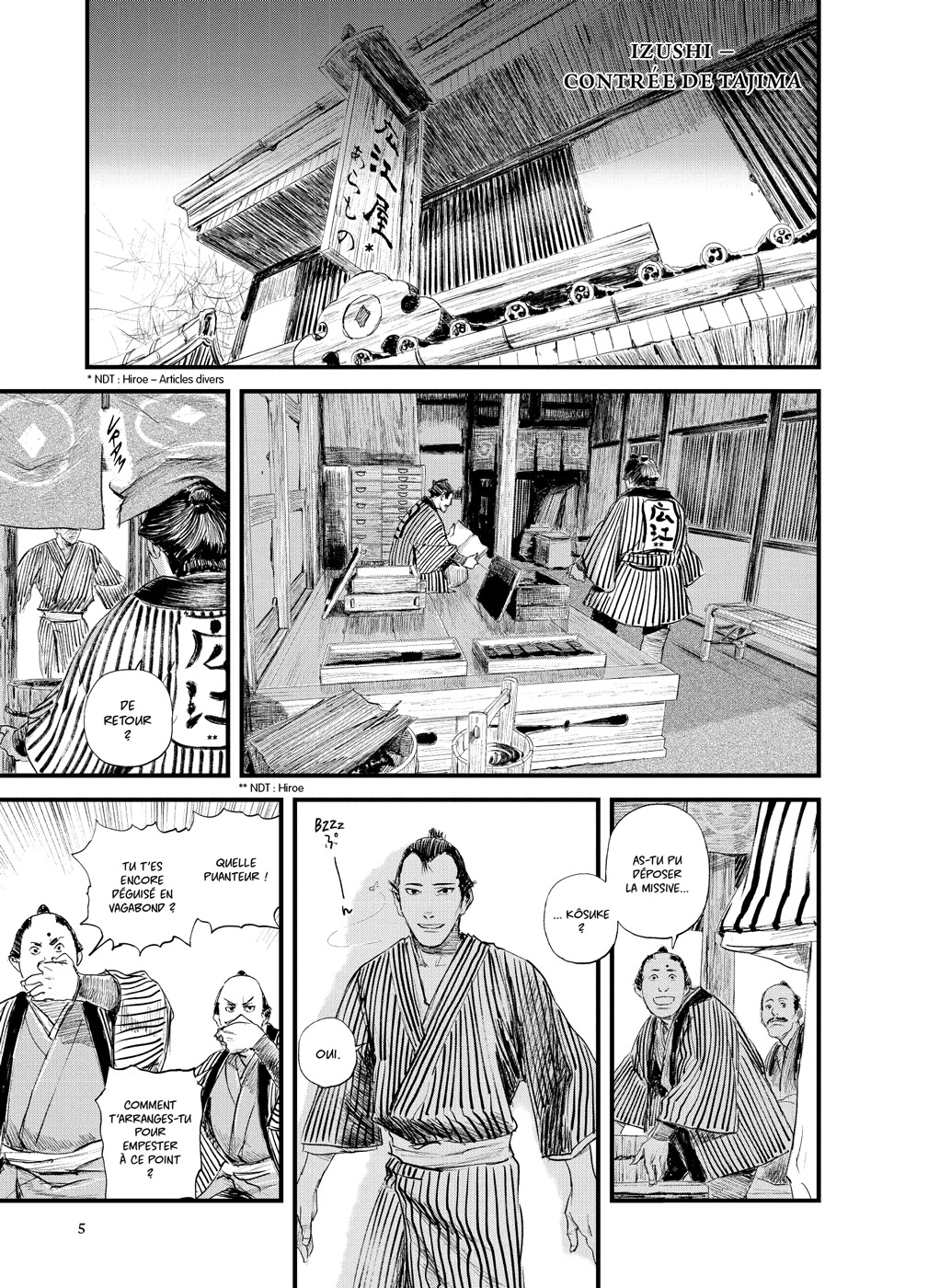 Depuis l’incident des portes interdites, Katsura Kogorô s’est réfugié à Izushi, où il a pris ses marques. Mais, en apprenant que Shinsaku Takasugi a levé une armée à Chôshû, il prend à nouveau conscience qu’il ne peut plus vivre tranquillement alors que l’avenir du pays est en péril. Il envoie de fait une missive à Shinsaku par l’intermédiaire de Murata Zorokû et de son aimée, Dame Ikumatsu, qui doit le rejoindre. Pour ce faire, Murata précise qu’une seule personne devra accompagner Dame Ikumatsu vers son mari, une mission tout indiquée pour Manji, qu’elle a reconnu. Si le chemin vers Katsura et les retrouvailles des époux se déroulent sans encombre, la deuxième partie du voyage n’est pas du même acabit. Manji et le couple tombent dans une embuscade tendue par Sasaki Tadasaburô et ses hommes. Si Katsura et son épouse arrivent à fuir, l’immortel, proprement « découpé » par Tadasaburô, est recueilli inconscient sur le bord d’une rivière par Ayame Buran et les espionnes Ôei, Ururu, Tsukumo, qui étaient justement à sa recherche. Il conclut une alliance surprenante avec les jeunes femmes afin de se débarrasser de ses assaillants.