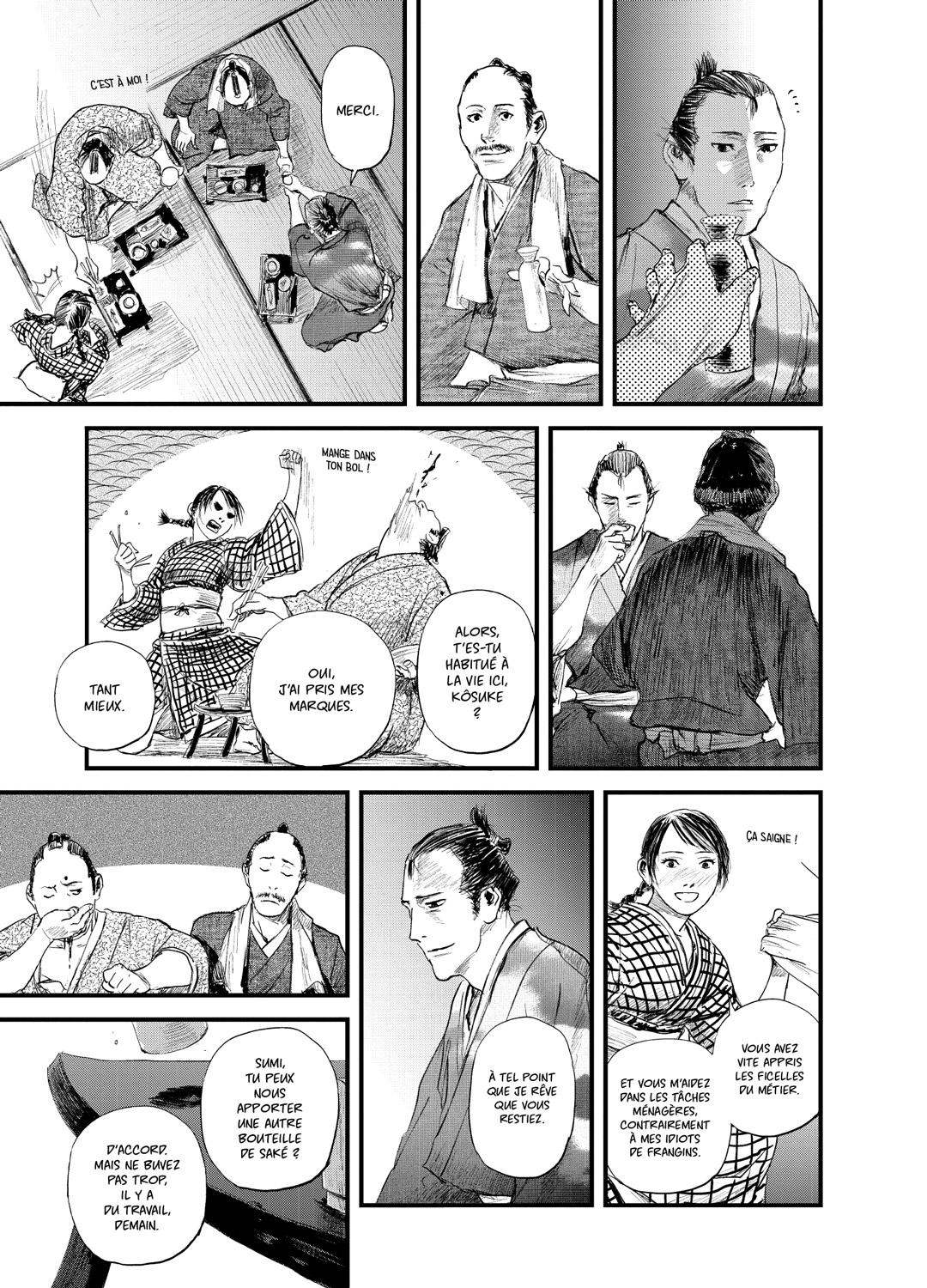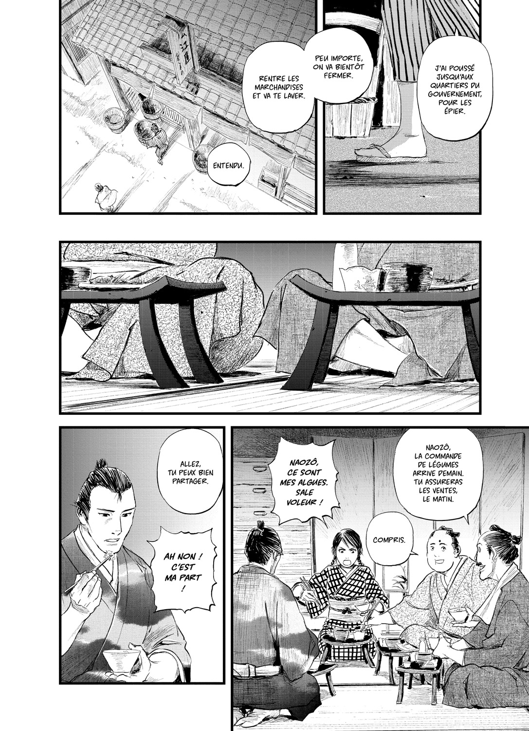 Renji Takigawa profite de ce septième épisode pour arranger une rencontre entre Ayame Buran, ses protectrices – les espionnes Ôei, Ururu, Tsukumo – et Manji. Bien que cet événement paraisse hasardeux, le scénariste glisse quelques éléments qui prouvent le contraire. En tout état de cause, cela arrange bien Ayame dont c’était l’objectif afin d’atteindre un certain but. De fait, une embuscade sanglante plus tard, nous en apprenons plus sur la très jeune spécialiste en immortologie et sur les expériences dans le domaine. Et bien d’autres choses encore ! De plus, chacun appréciera à sa juste valeur les interventions de personnages historiques dans la trame du récit comme celles de Matsumoto Ryôjun qui a été le médecin personnel du dernier shogun au pouvoir, Yoshinobu Tokugawa. Une précision historique qui n’a d’égale que celle du dessin de Ryû Suenobu. À cela nous pouvons également ajouter la finesse du trait du mangaka qui est absolument incroyable en ce qui concerne la représentation des personnages féminins ainsi que la nervosité qu’il dégage lors des violents combats. Même si la patte du maître Hiroaki Samura est bien présente du fait de sa supervision, Renji Takigawa et Ryû Suenobu livrent un nouvel opus qui rayonne de leurs énergies.