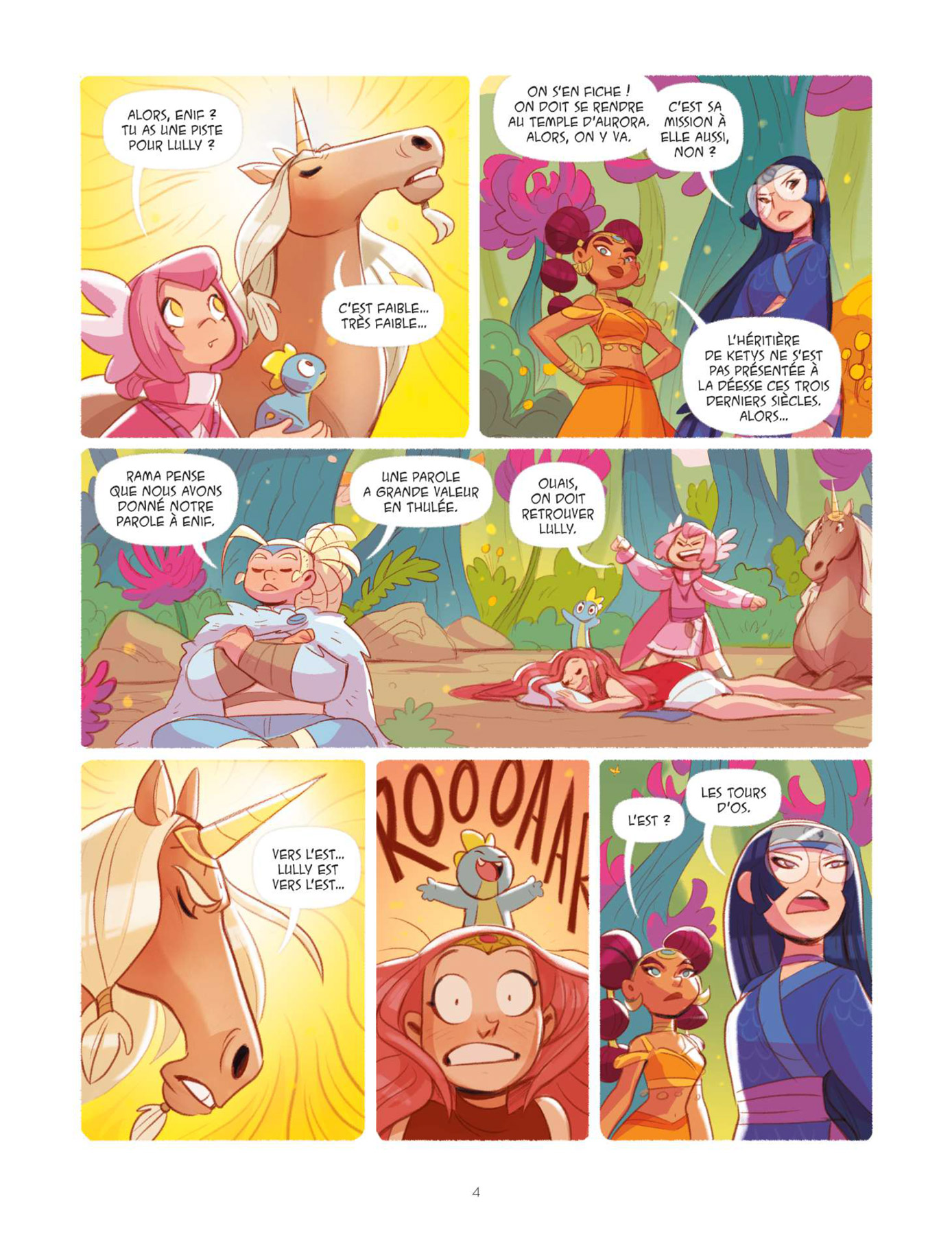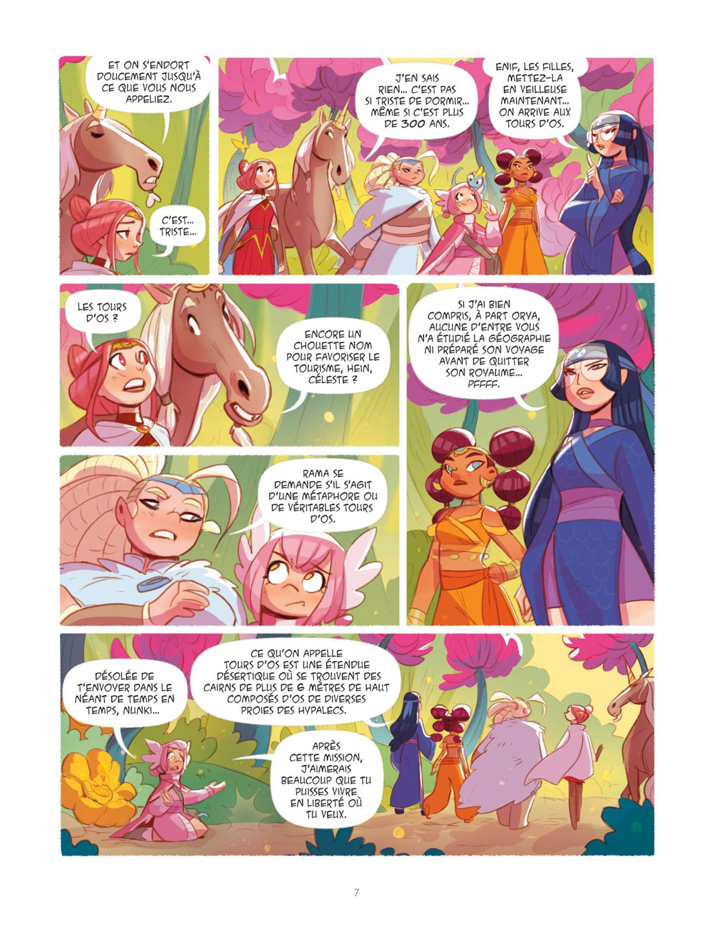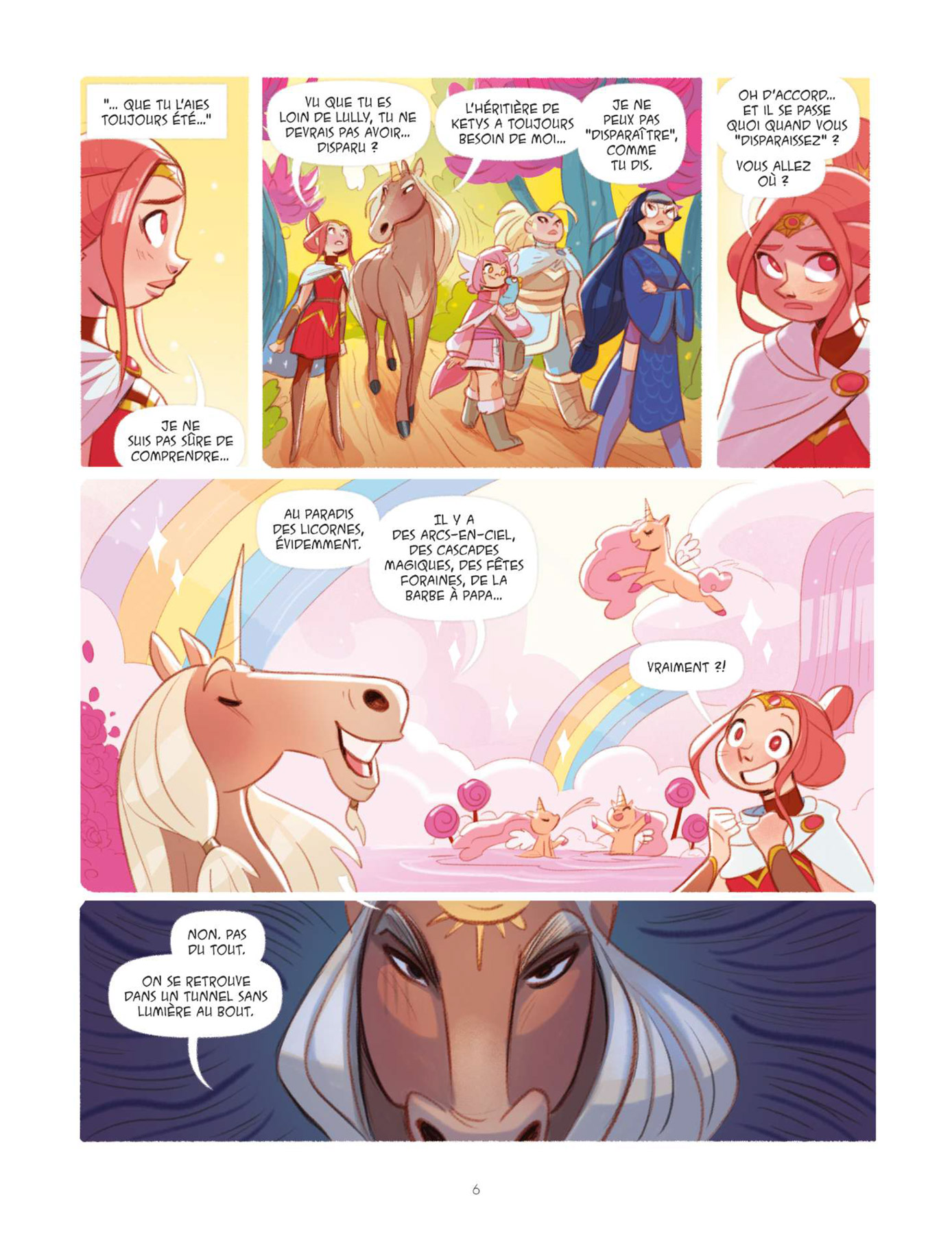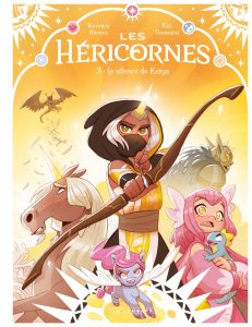 Dans ce troisième tome des Héricornes, Kid Toussaint (Masques) révèle beaucoup de choses. Le scénariste conte tout d’abord l’histoire personnelle de Lully qui est l’héritière de Ketys en suivant le schéma bien rôdé des flashbacks, apprend quelle est la véritable nature de Nell, dévoile Nunki sa licorne invisible et fait entrevoir le lien existant entre Luna, la grand-mère de Céleste, et Luna, la sorcière, tout cela en poursuivant le développement de la mission première des héritières qui est, ne l’oublions pas, d’atteindre le temple d’Aurora. Au cours de ce dernier, les rebondissements et les coups de théâtre ne manquent pas et tiennent en haleine de bout en bout. Une fois encore, le récit est parfaitement scénarisé par un Kid Toussaint toujours aussi efficace. Graphiquement, Verónica Álvarez illustre cette nouvelle partie de l’aventure avec beaucoup de classe et de peps. Le dessin est complètement en phase avec le dynamisme du récit et le trait tout en rondeur de l’illustratrice ibérique apporte beaucoup de douceur, rendant ainsi la lecture toujours plus agréable. La mise en couleurs quant à elle dégage une énergie positive incroyable qui profite à cette très bonne série jeunesse. Chacun appréciera à sa juste valeur le traitement particulier appliqué « aux retours en arrière » consacrés à l’enfance de Lully.