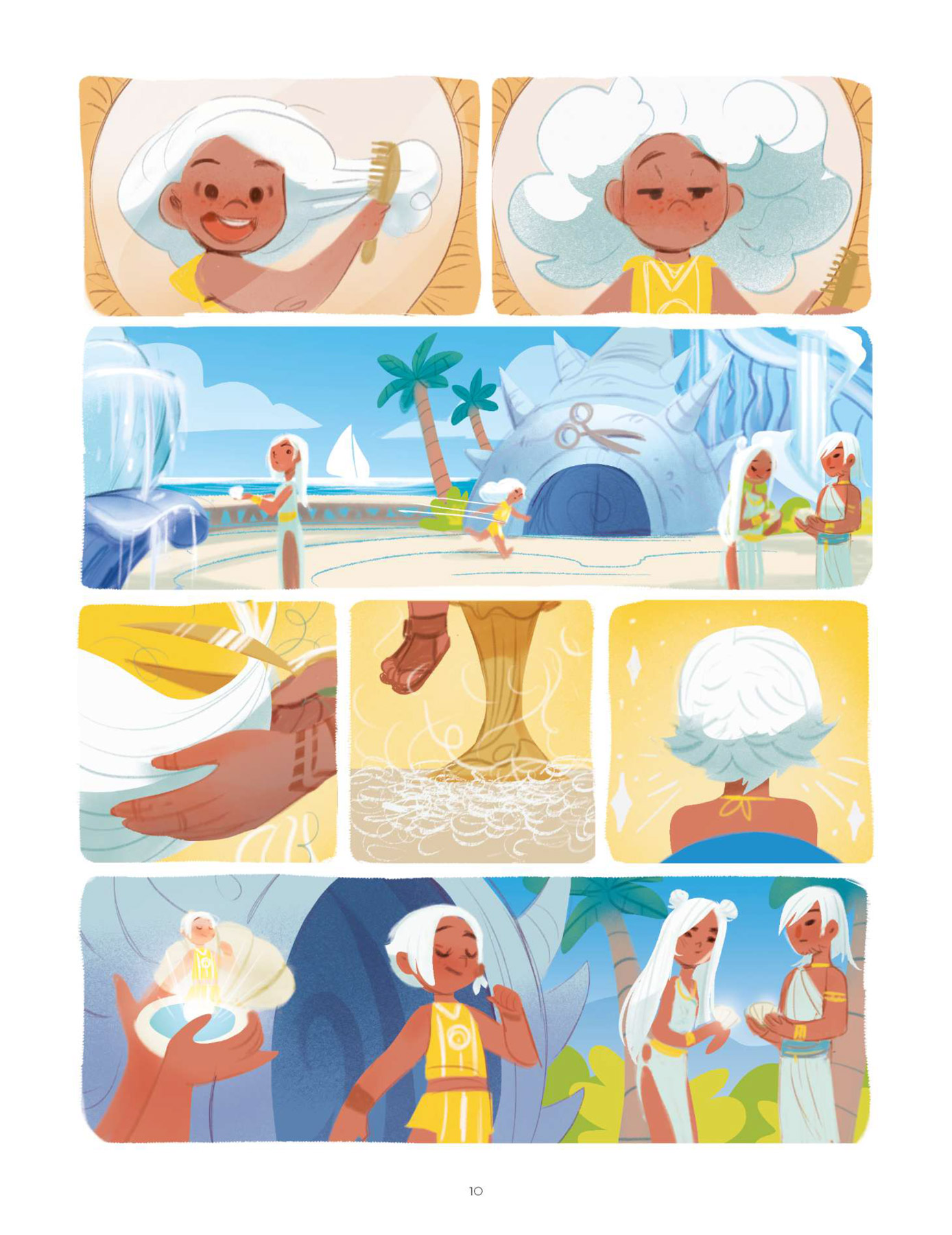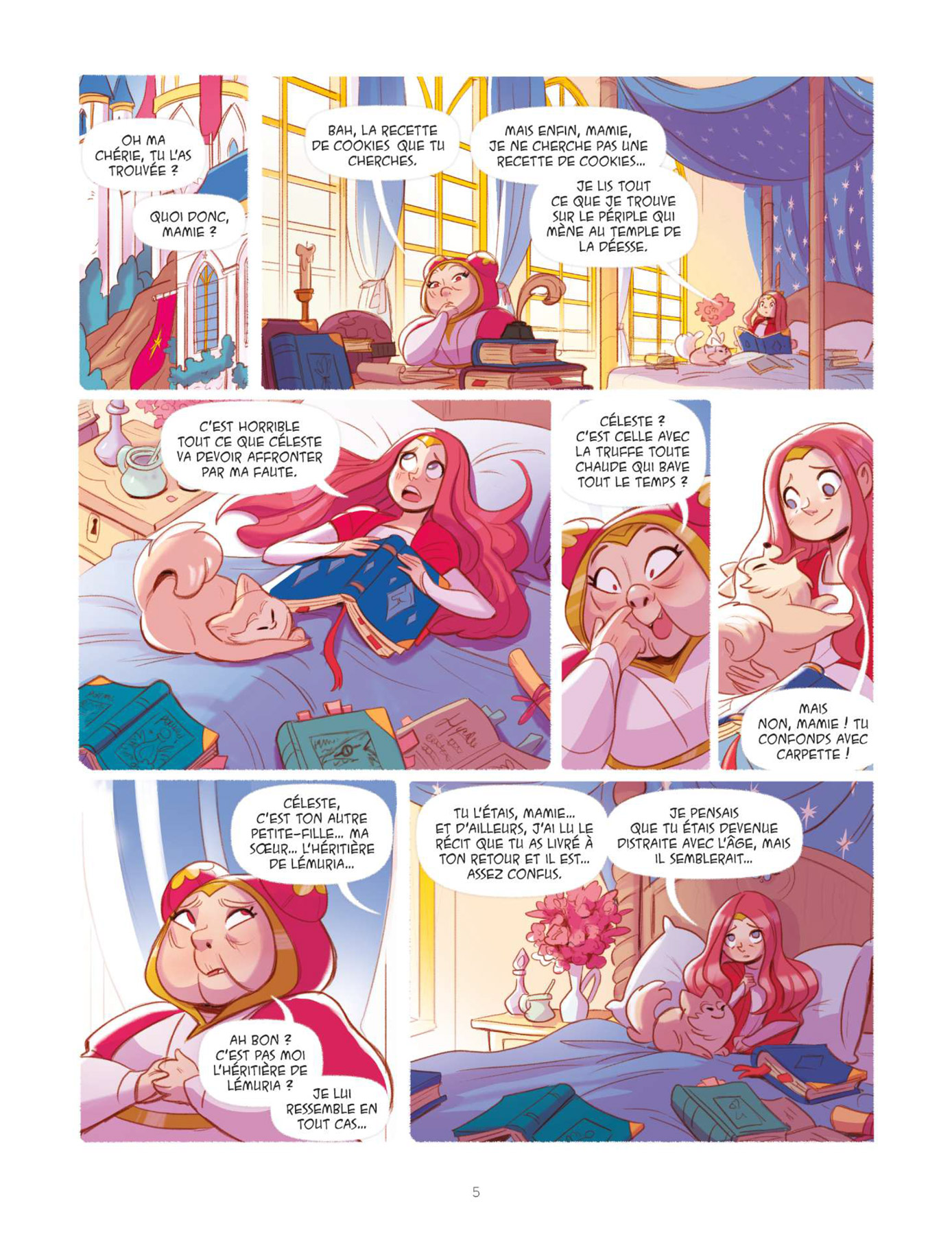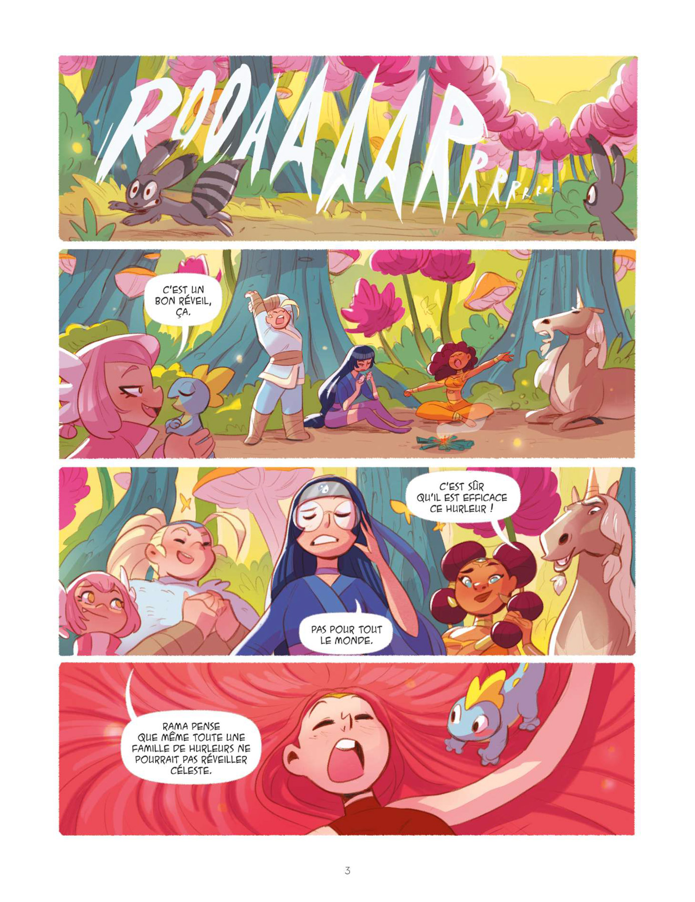Dans ce troisième tome des Héricornes, Kid Toussaint (Masques) révèle beaucoup de choses. Le scénariste conte tout d’abord l’histoire personnelle de Lully qui est l’héritière de Ketys en suivant le schéma bien rôdé des flashbacks, apprend quelle est la véritable nature de Nell, dévoile Nunki sa licorne invisible et fait entrevoir le lien existant entre Luna, la grand-mère de Céleste, et Luna, la sorcière, tout cela en poursuivant le développement de la mission première des héritières qui est, ne l’oublions pas, d’atteindre le temple d’Aurora. Au cours de ce dernier, les rebondissements et les coups de théâtre ne manquent pas et tiennent en haleine de bout en bout. Une fois encore, le récit est parfaitement scénarisé par un Kid Toussaint toujours aussi efficace. Graphiquement, Verónica Álvarez illustre cette nouvelle partie de l’aventure avec beaucoup de classe et de peps. Le dessin est complètement en phase avec le dynamisme du récit et le trait tout en rondeur de l’illustratrice ibérique apporte beaucoup de douceur, rendant ainsi la lecture toujours plus agréable. La mise en couleurs quant à elle dégage une énergie positive incroyable qui profite à cette très bonne série jeunesse. Chacun appréciera à sa juste valeur le traitement particulier appliqué « aux retours en arrière » consacrés à l’enfance de Lully.