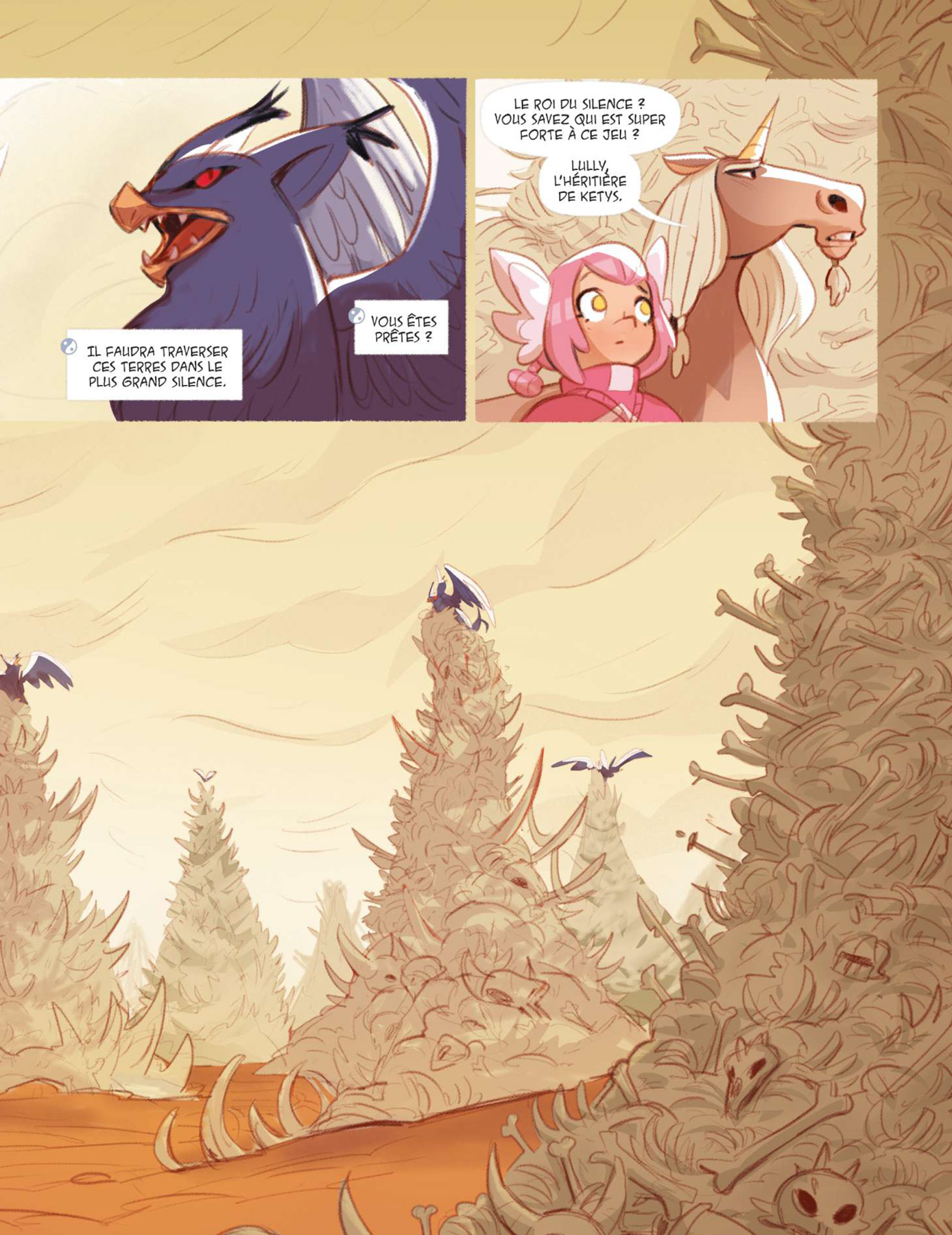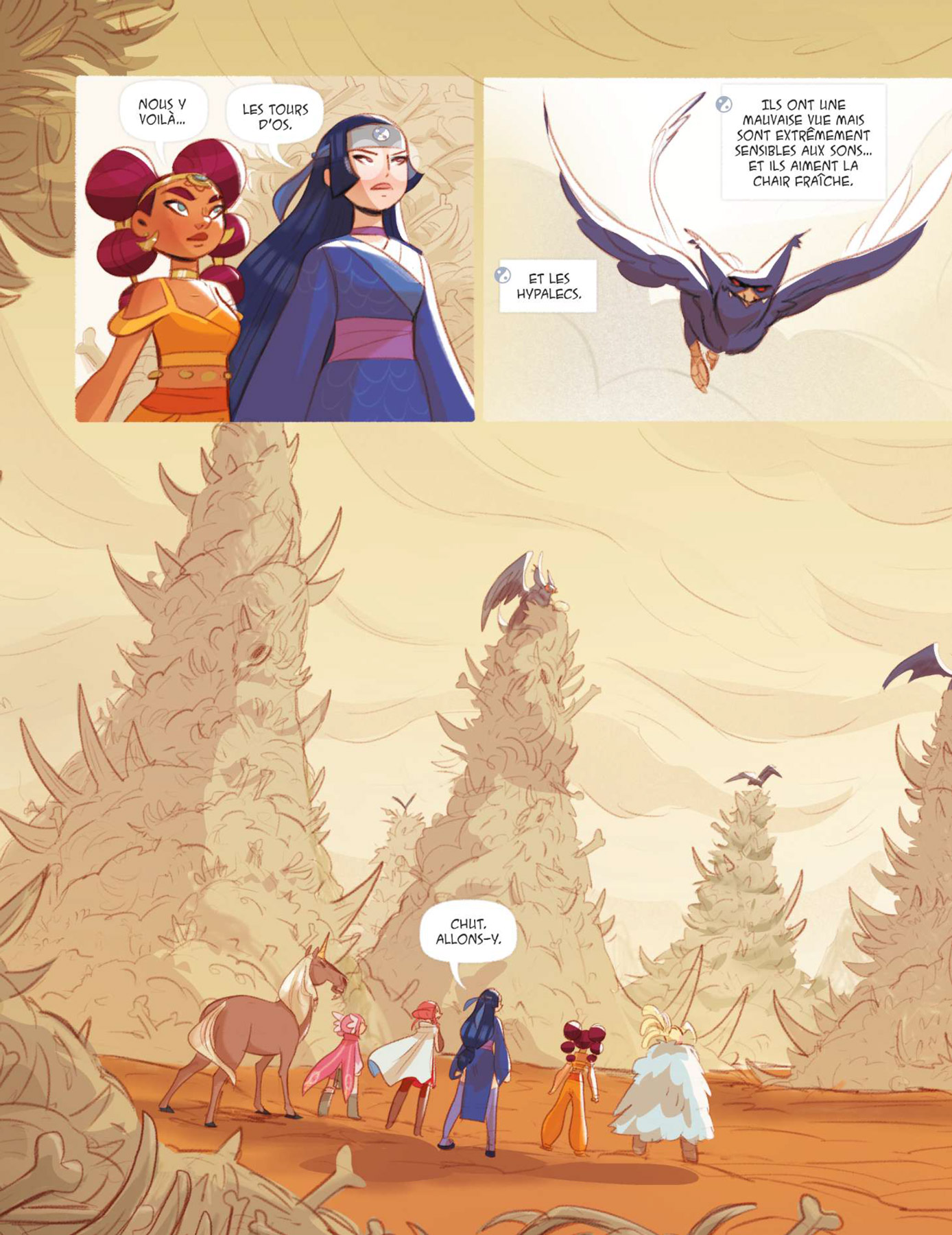 Grâce à l’union de leurs forces, les Héricornes ont libéré leurs licornes des mains des braconniers et font un nouveau détour, au grand dam d’Izandre, pour aider Lully, l’héritière de Ketys, disparue après son affrontement avec la sorcière. Pour ce faire, elles doivent aller vers l’Est et traverser les Tours d’Os, une étendue désertique où se trouvent de très hauts cairns composés d’os de diverses proies des Hypalecs. Malgré leur prudence, les monstres volants les attaquent et font que les Héricornes sont séparées. Rama, Izandre et Orya sont obligées de se réfugier dans une grotte en compagnie d’Enif alors que Céleste part au secours de Nell, enlevée par l’un de leurs assaillants. À cette occasion, l’héritière de Lémuria découvre à la fois le lourd secret de Nell ainsi que sa licorne invisible ! Elle apprend également quelque chose qui est en lien direct avec son propre destin et celui de son royaume, des révélations en rapport avec les faits étranges que sa sœur Astra a découverts dans le récit fait par leur grand-mère Luna après son retour du temple d’Aurora des années auparavant.
