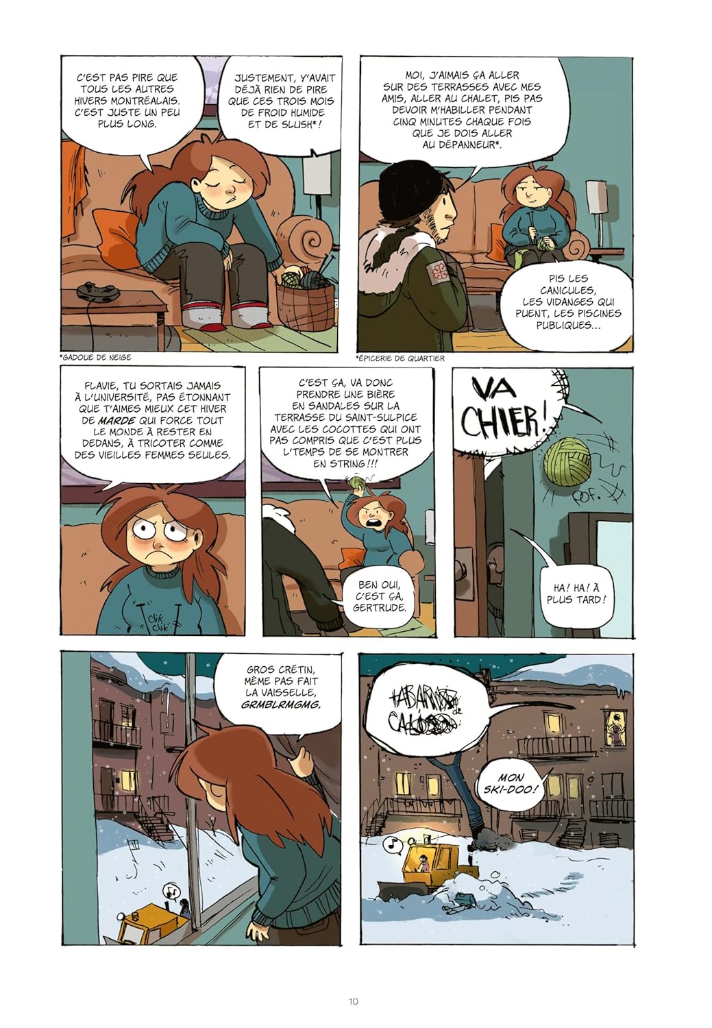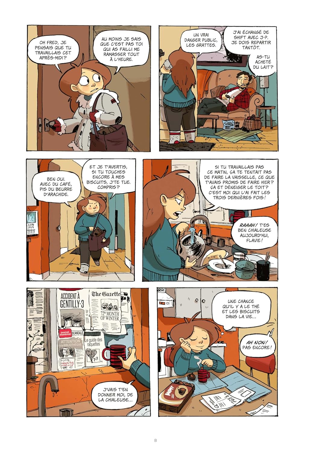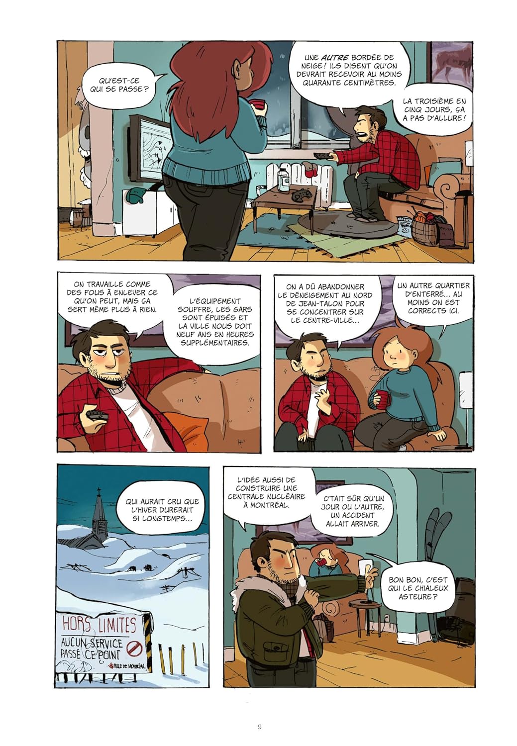 Si on se demandait à quoi ressemblerait notre vie après un accident nucléaire, cet album offrirait une version a priori pas si insensée que ça, même si pour le coup l’intrigue se déroule au Canada. D’ailleurs, lecteur français, prépare-toi à découvrir des expressions bien de là-bas. Cela peut paraître un peu déroutant au début mais, au fil de la lecture, on s’habitue au point de se surprendre à trouver la signification de celles-ci bien plus rapidement. A noter que cet album est une intégrale des trois volumes de la série initialement publiés au Canada. La protagoniste, plutôt solitaire, va s’ouvrir peu à peu aux autres au fil de l’aventure et c’est bien là où veut nous emmener Cab, l’autrice montréalaise. Les rapports humains et l’évolution climatique qui découle de la situation donnent un savant mélange où le second degré n’est jamais loin et permet de dégoupiller une situation critique.