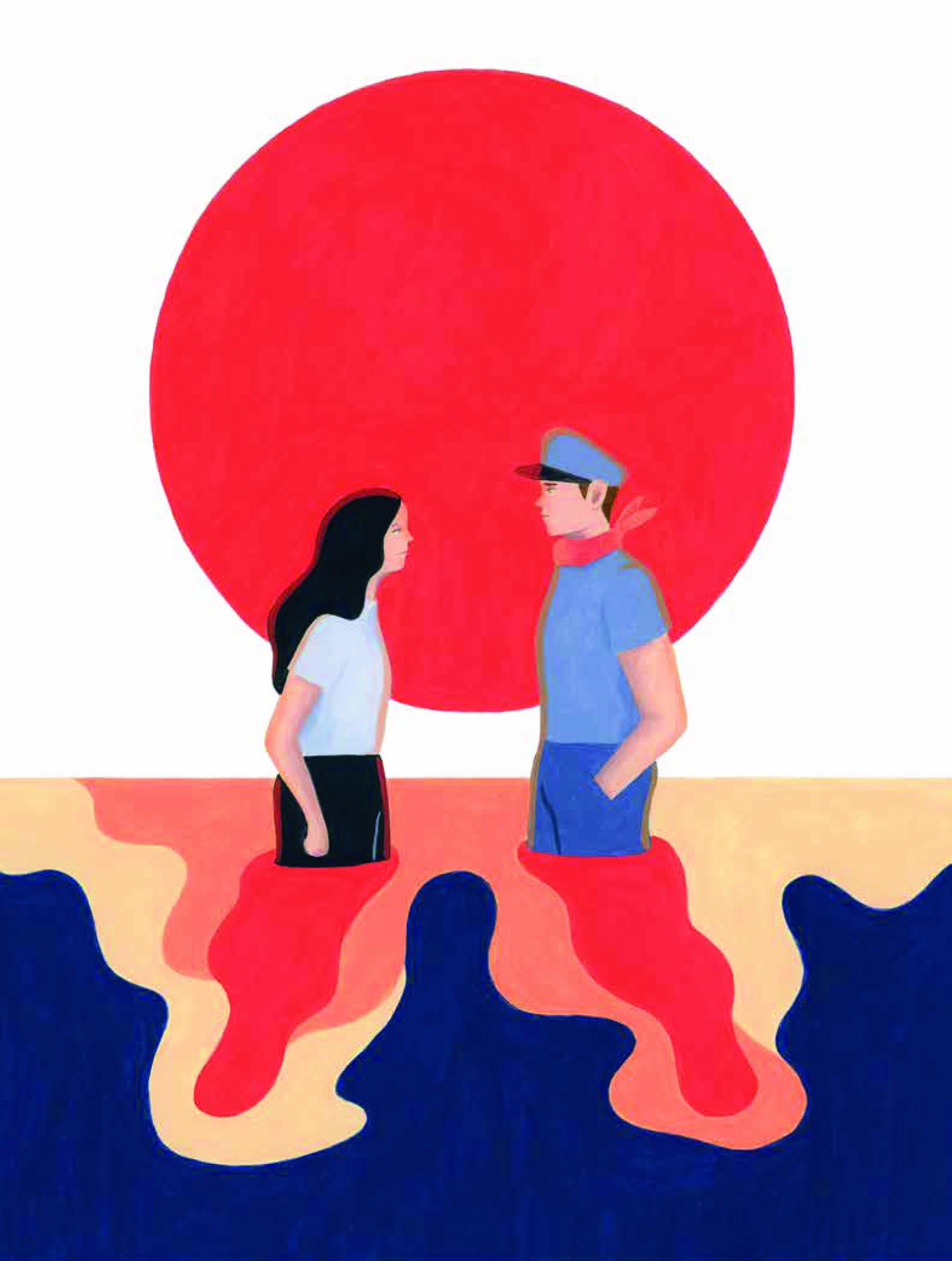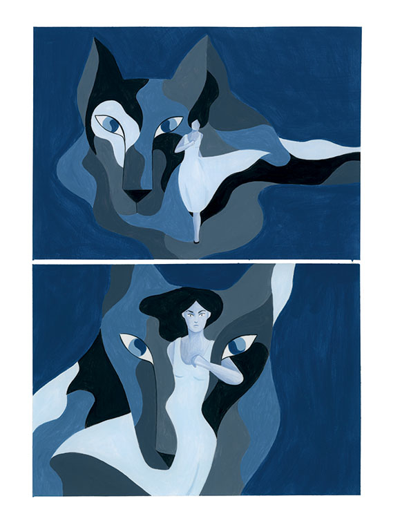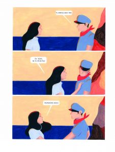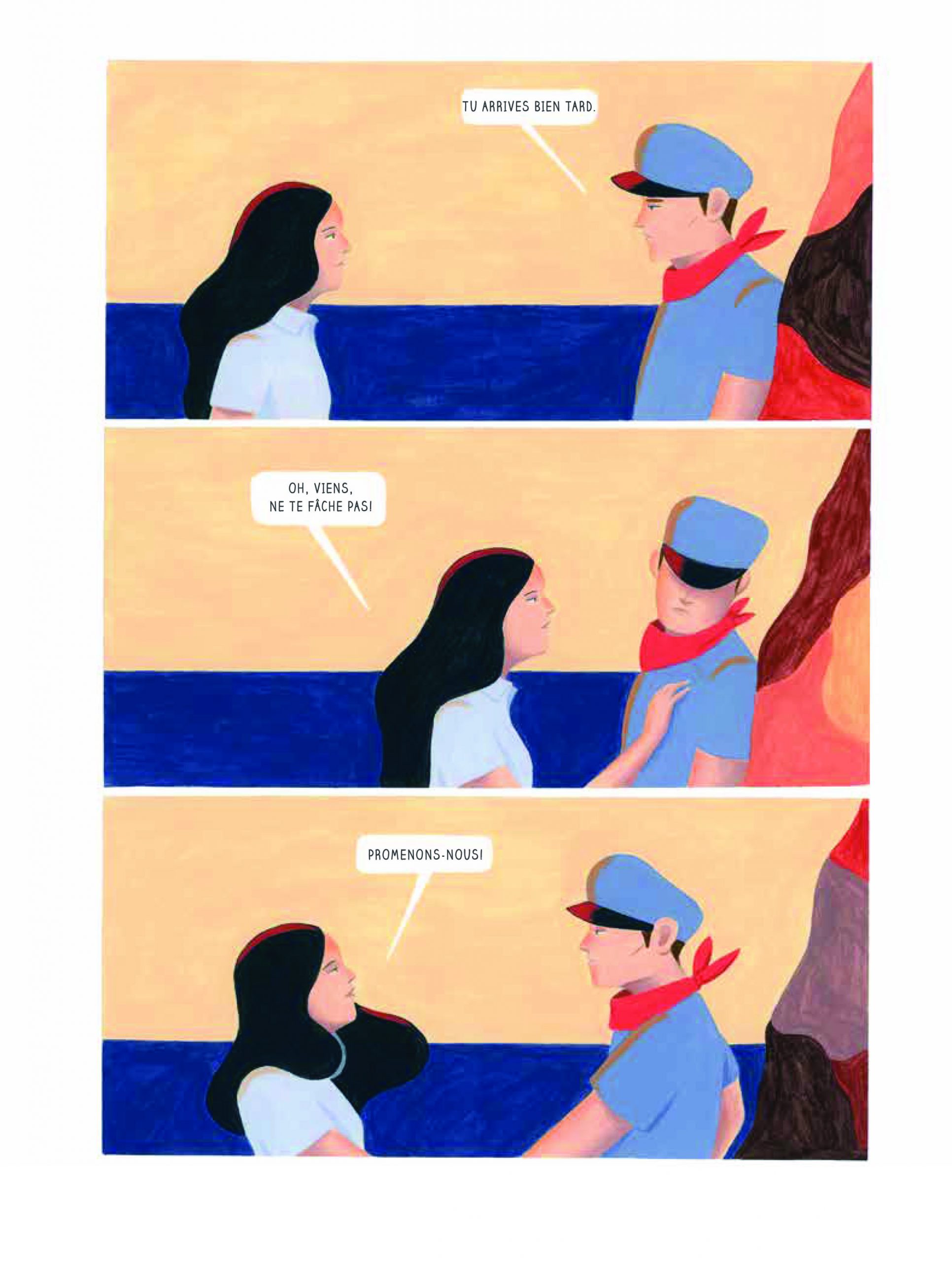 Difficile de parler de cet album (disons-le tout de suite : sublime) sans en gâcher la lecture alors parlons déjà de l’autrice, dont nous espérons bien voir d’autres œuvres publiées en France, aussi bien les passées que les futures. Révélation de la bande dessinée espagnole actuelle, Mayte Alvarado a publié une première bande dessinée il y a dix ans, E-19 (El Verano del Cohete, 2015) – avec une jolie exploration de la combinaison des couleurs bleue et orange – puis illustré l’immense classique de la littérature espagnole qu’est La Casa de Bernarda Alba de Federico García Lorca en 2017. Ont suivi, entre autres, Descalzos en 2018, de courtes bandes dessinées comme El Barcó (publiée dans le recueil En Corto) et Jardín (parue dans la revue GQ España en 2019), ou encore les illustrations de l’ouvrage Escrito al margen (textes de Juan Frau). Son style graphique déjà identifiable et infiniment poétique a enfin percé en France au printemps de cette année avec la parution de Gabriele Münter – Les Terres bleues (Seuil, 2025). Dans L’Île, la palette dominante est bleue (comme souvent, semble-t-il) mais l’autrice pare certains chapitres de vert d’eau ou de rouge flamboyant, voire de gris, renforçant l’impression de temps qui passe, de toute évidence un des thèmes de prédilection de l’autrice avec, toujours, une forte présence de la nature. Le texte s’y fait rare (mais soulignons le travail de la traductrice, Hélène Serrano), comme c’était par exemple le cas dans Gabriele Münter, mais le talent de Mayte Alvarado réside ailleurs : son découpage judicieux nous immerge dans son univers et on sentirait presque le vent s’engouffrer dans nos cheveux ! L’album avait été sacré meilleur album de l’année lors de sa sortie en Espagne et on comprend aisément pourquoi.