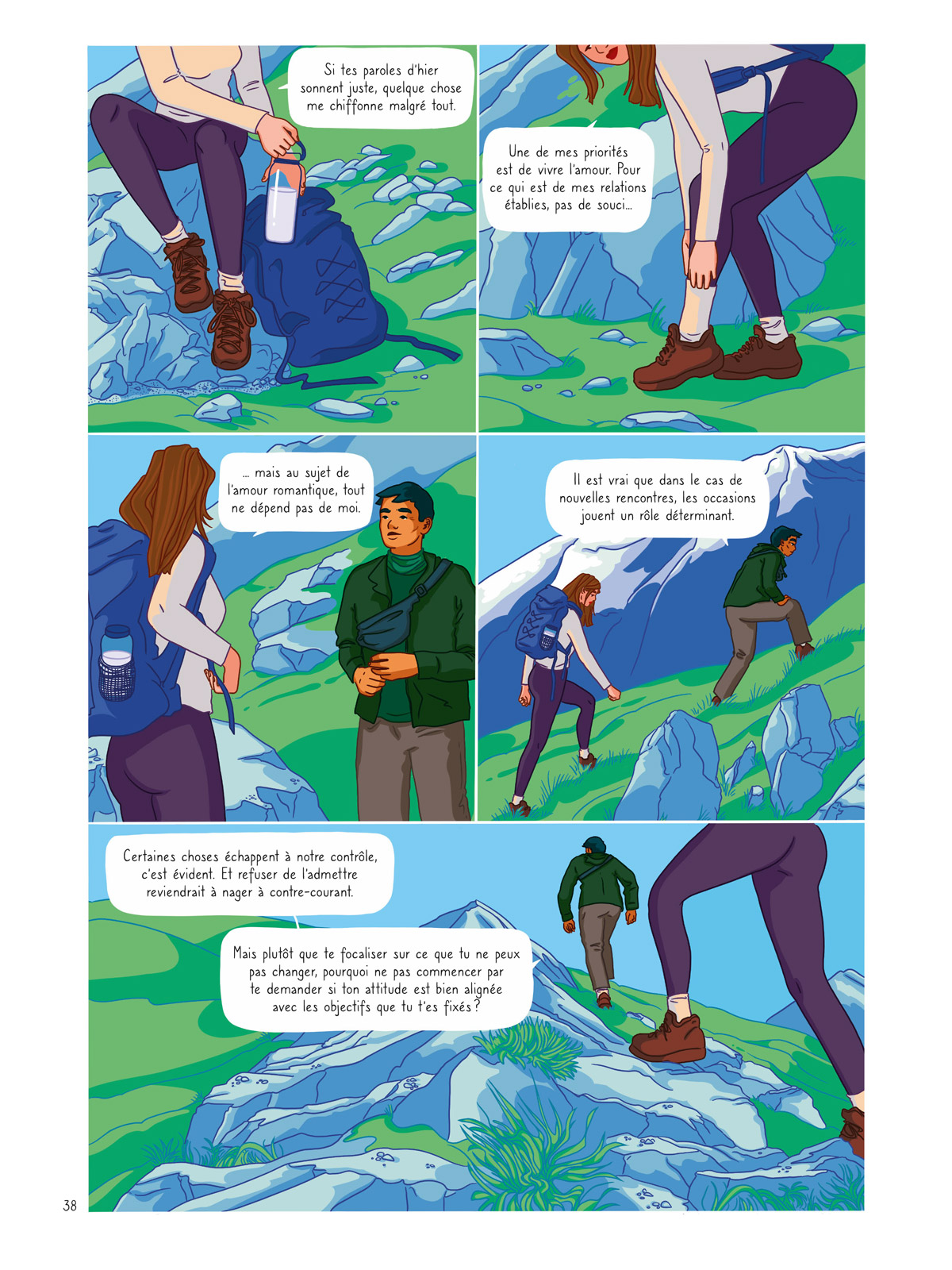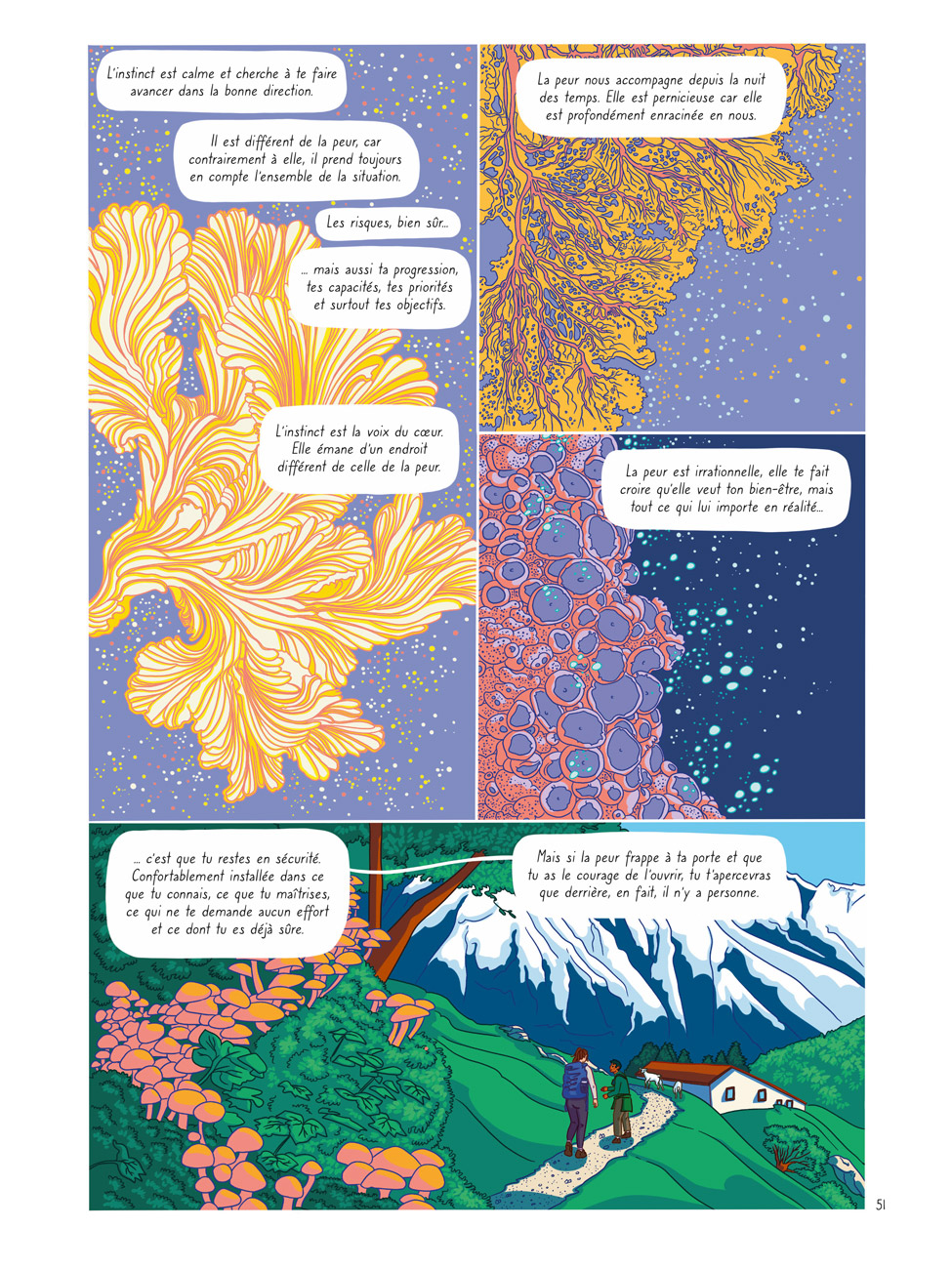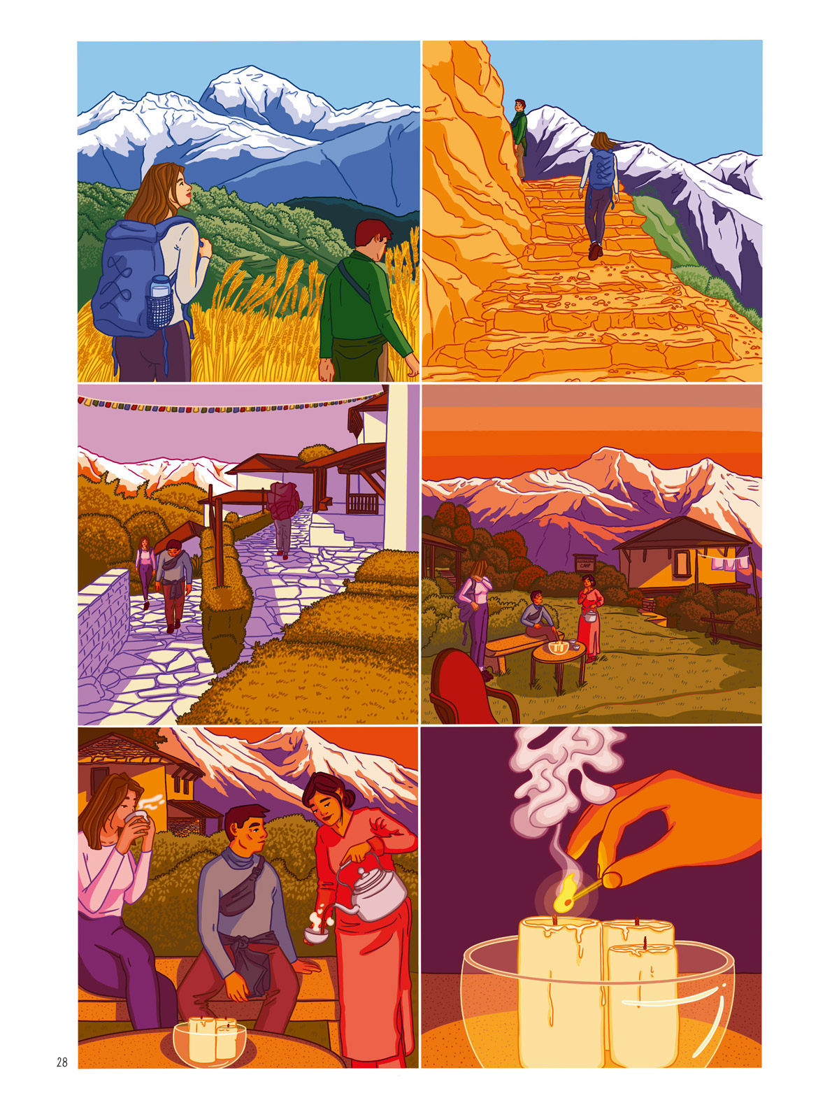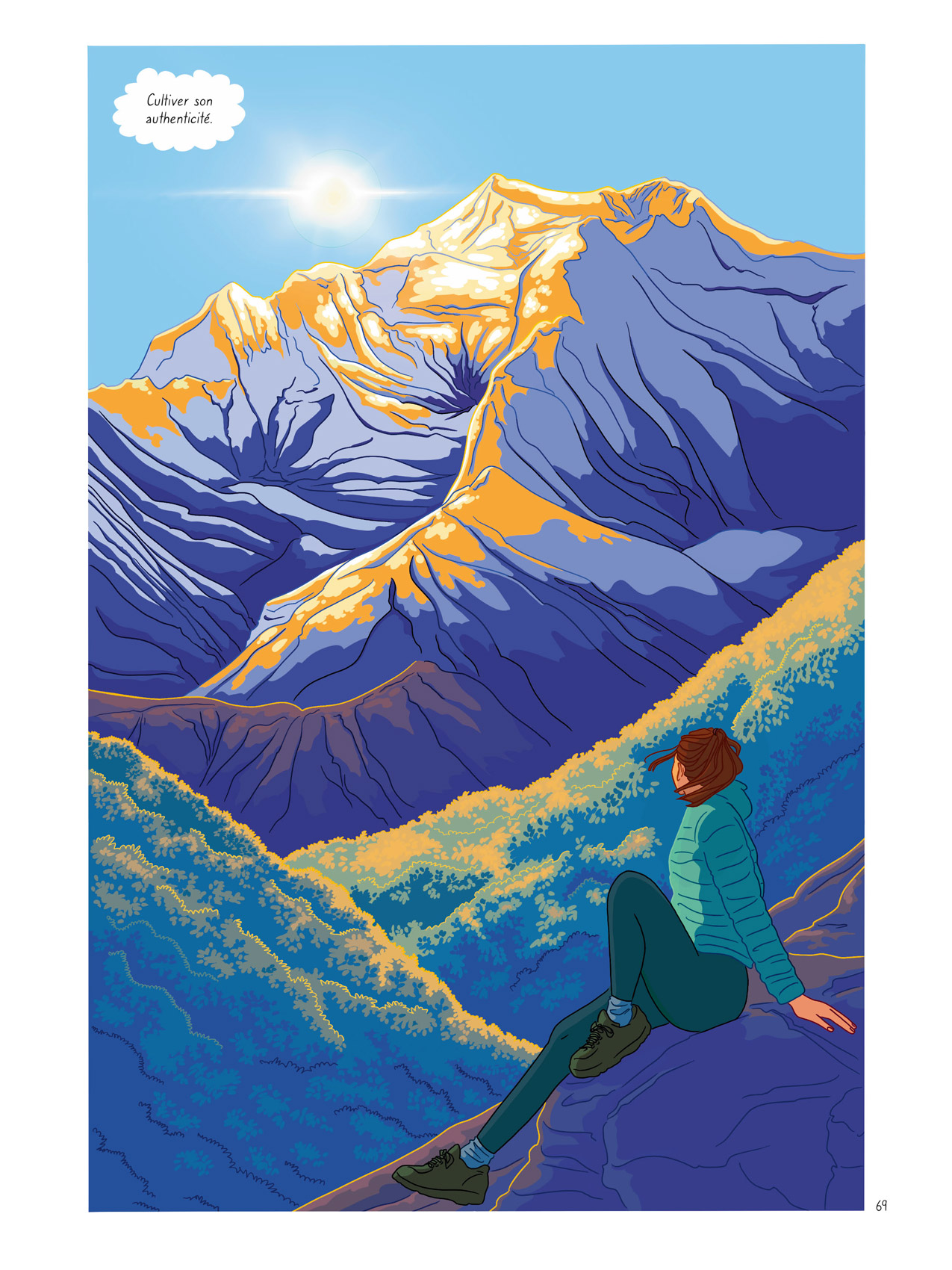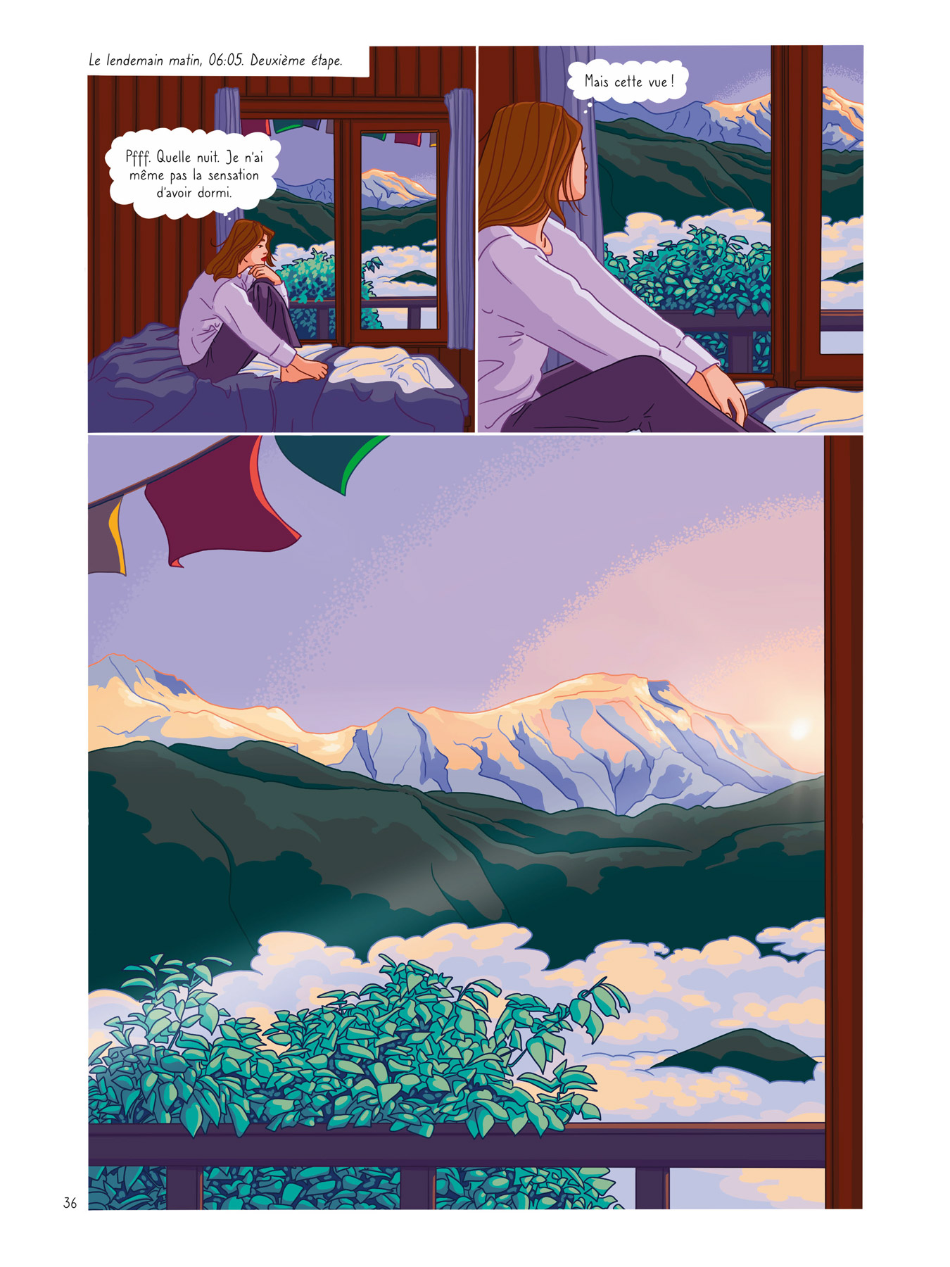 Réaliser une adaptation de roman n’est pas chose aisée, qui plus est lorsqu’il s’agit d’un best-seller comme celui de Maud Ankaoua qui a déjà séduit plus de deux millions de lecteurs. Cependant, c’est le défi que s’est fixé l’autrice de Fragile. Mathilde Ducrest a osé le relever et le résultat est somme toute des plus convaincants et enthousiasmants. Ainsi, Kilomètre Zéro touche avec son approche très précise et personnelle de la narration graphique un nouveau public, celui de la bande dessinée. En ce qui concerne le récit, il est très prenant malgré le peu d’action au sens propre du terme, si ce n’est les ascensions de montagnes que nous ne ressentons finalement pas autant que l’héroïne car il y a les échanges avec le sherpa Shanti qui focalisent notre attention tout autant que les décors magnifiés par l’illustratrice. Cette dernière a capté l’essence même du roman et l’a retranscrite via sa grammaire graphique assez exceptionnelle qui par certains aspects fait penser à celle d’Anne Baltus et n’hésite pas à s’inviter sur les sentiers d’autres artistes tels Van Gogh, Goya, Michel-Ange ou encore ceux du Paléolithique !