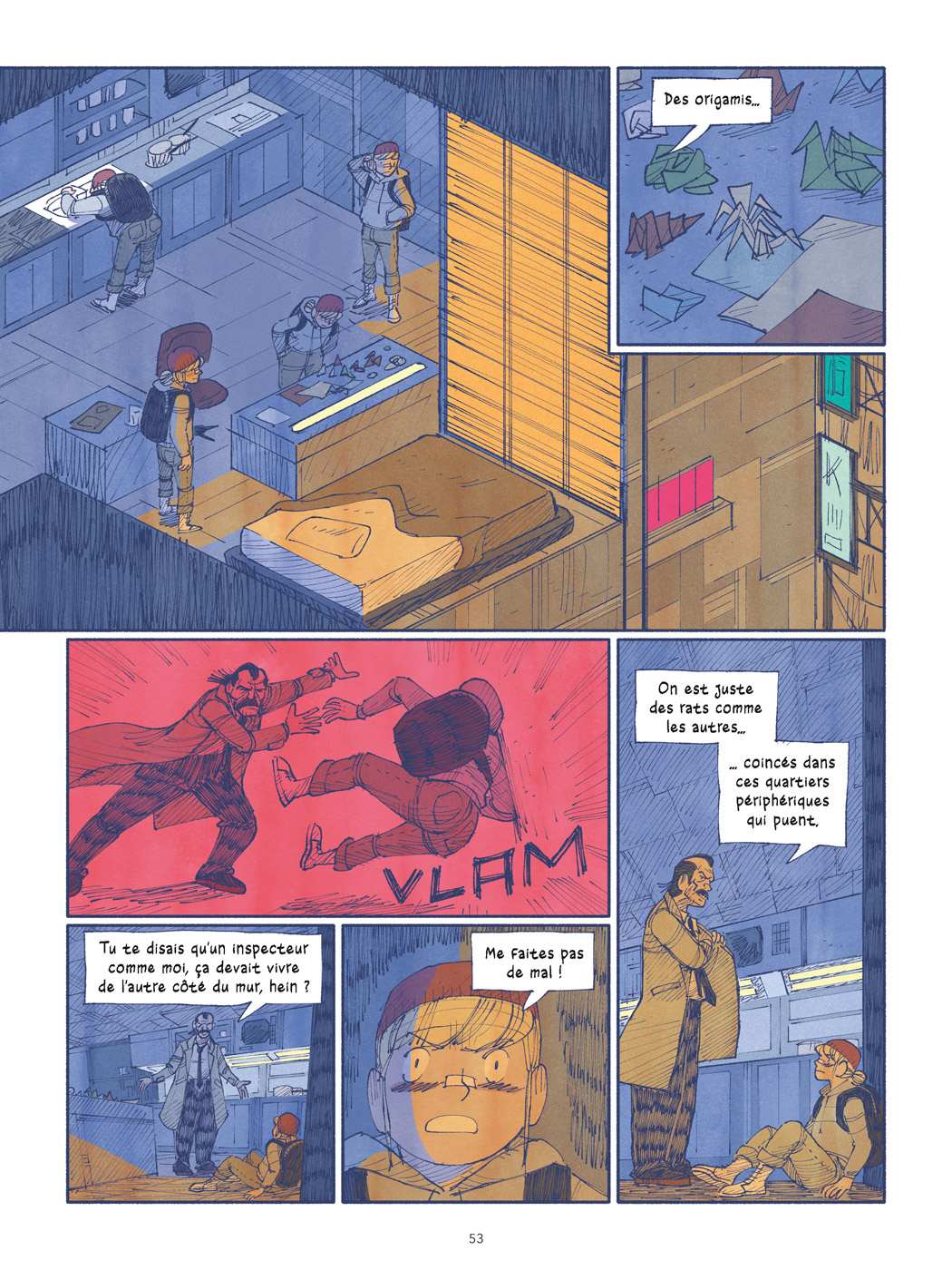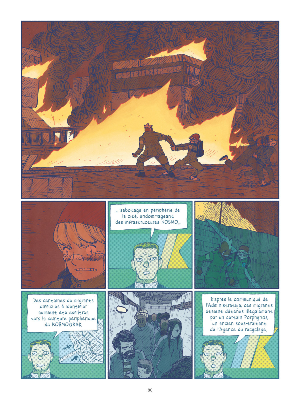 Cette fin de diptyque dystopique sur fond de dérèglement climatique est menée de main de maître par Bonaventure. L’auteur finalise ce préquel de Kosmograd sur un rythme narratif très soutenu et met en avant deux thématiques supplémentaires qui viennent se greffer à celles déjà présentes : le droit des femmes à disposer de leur corps à travers le programme de réarmement démographique de Kosmo qui va à l’encontre de celui-ci et la corruption des forces de l’ordre par le biais des agissements de Piotr Isko, un nouveau personnage fort intéressant. Le rapprochement entre les Zoya, Evane et Paouk se dessine subtilement durant les avancements de leurs actions respectives que Bonaventure développe en parallèle dans des séquences différentes. Cela tient bien en haleine car leurs agissements sont étroitement liés et souvent, voire tout le temps, dangereux car les héroïnes ne reculent pas devant les risques. De plus, il y a un petit delta temps libre entre la fin de ce diptyque et le début de Kosmograd qui laisse un espace non exploité pour permettre aux lecteurs d’imaginer le premier contact entre les trois filles. Bonaventure interprète sa partition dans une veine semi-réaliste des plus efficaces où l’identité graphique est affirmée et marque avec une mise en couleurs originale et audacieuse. Mais, surtout, l’ensemble des prestations réalisées pour l’univers de la série est parfaitement homogène.