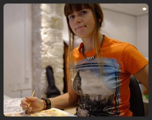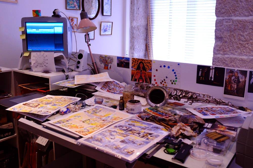 « Et voilà mon atelier, que je partage avec des réparateurs d’instruments de musique. Pèle-mêle : beaucoup de bouquins, de la documentation sur toutes les époques, les architectures, les costumes. Et tout ce que je peux avoir envie pour gribouiller : peinture, teintures, crayons et fusains, savon, papiers divers… J’ai besoin de varier les techniques et fuir ainsi la routine et les réflexes. Pour chaque nouvelle histoire, j’expérimente jusqu’à trouver le style de dessin qui collera le mieux à son ambiance particulière… Par exemple, pour réaliser la bande dessinée du moment, j’ai déniché une technique qui m’offre une bonne quantité de hasard : je commence par des taches de couleur avant de tracer le trait. »
