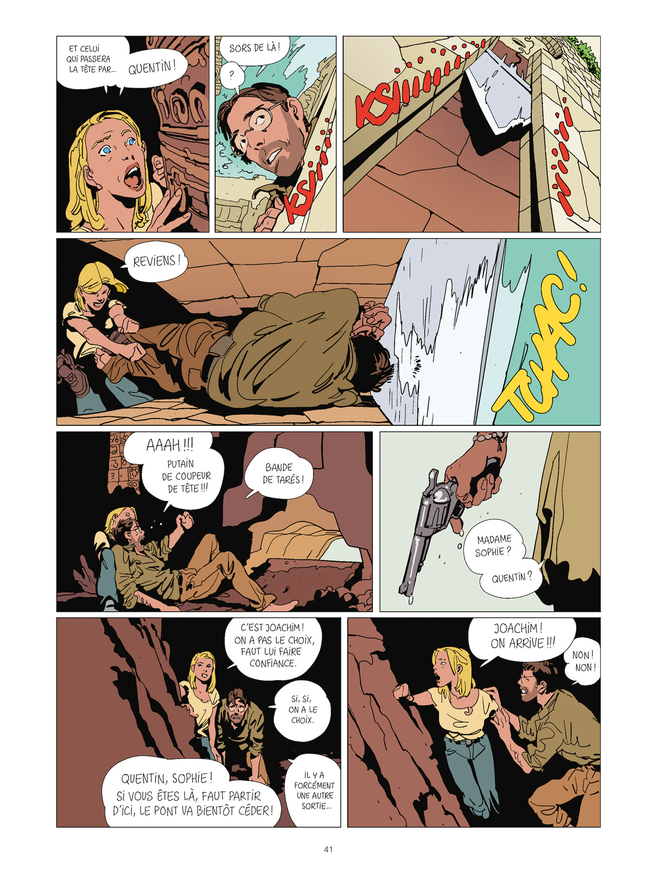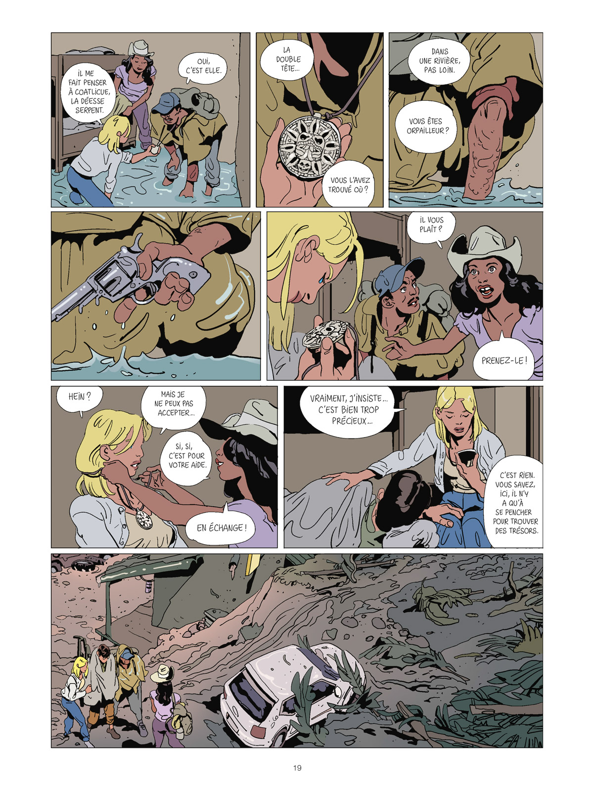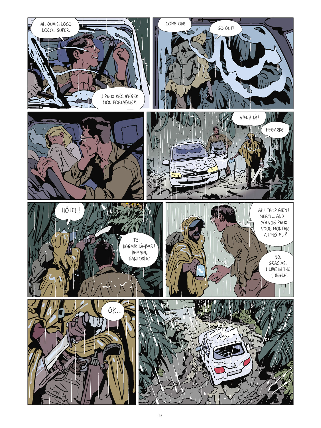 Bastien Vivès poursuit son hommage aux films d’action familiaux des années 80-90 avec bonheur. Dans ce second volet des aventures des « spécialistes des vacances ratées », le couple « chat noir » se retrouve à nouveau plongé dans une situation dangereuse où la maladie les oblige à se relayer dans l’action. En effet, l’un après l’autre, Sophie puis Quentin sont victimes d’une gastro qui les diminue sévèrement. L’auteur met habilement en place une sorte de double chasse au trésor où la première mène par hasard à la seconde et lui permet d’aborder à la fois les conditions de vie des orpailleurs et la corruption des forces de l’ordre dans des pays où sont développés ce genre d’activités. Si la ville de Santorito n’existe pas, il n’en est pas de même pour la divinité Coatlicue citée dans le titre, qui est au centre de la deuxième chasse au trésor. En effet, il s’agit de la déesse de la fertilité et de la terre dans la mythologie aztèque, aussi connue sous le nom Teteoinan. L’ensemble est parfaitement agencé et fait de ce deuxième opus une réussite des plus divertissantes. De plus, nous en apprenons un peu plus sur les personnages principaux, plus particulièrement en ce qui concerne Sophie dont Bastien Vivès nous dévoile qu’elle enseigne l’Histoire de l’Art et parle parfaitement l’espagnol et le serbo-croate. Graphiquement, l’illustrateur fait très bien le job avec son style reconnaissable entre tous et nous sert de belles séquences dynamiques mais aussi humides, que Brigitte Findakly colorise avec goût.