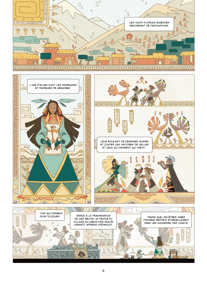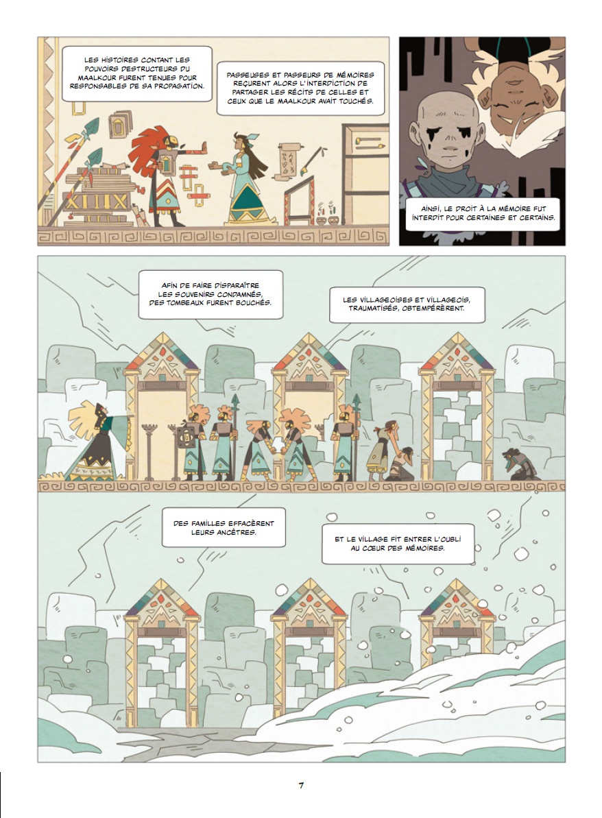 Le Maalkour est le premier tome de La Mémoire de Sage de Thanaël et Genki publié aux éditions de La Gouttière et c’est une vraie réussite ! Qu’il s’agisse du scénario écrit à quatre mains ou des dessins réalisés par Thanaël, tout est fait pour nous entraîner à l’aventure avec Enti et ses amis. L’idée des passeurs de mémoire, qui sont chargés de faire perdurer la mémoire des morts en racontant leur vie passée, est bien trouvée, mais c’est surtout le fait d’occulter une partie de ces défunts qui est intéressante car elle montre bien à quel point on peut faire des dégâts lorsque l’on veut se passer d’une partie de l’histoire. Ce premier tome met bien en place l’intrigue et nous plonge directement au cœur du sujet avec des personnages à qui l’on s’attache dès le départ et pour lesquels on a énormément d’empathie. Les dessins aux allures incas/aztèques permettent encore plus de s’immerger dans l’histoire et l’idée de réaliser certaines cases sans aucun décor, juste un fond blanc est maline, car elle permet de se focaliser réellement sur les personnages et surtout sur les dialogues. Ce premier tome est une réussite et on a hâte de voir où les auteurs vont nous entraîner pour la suite.