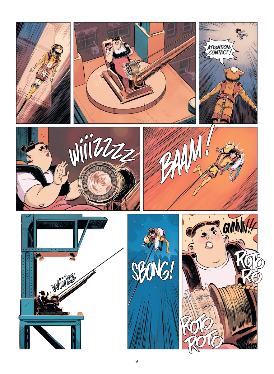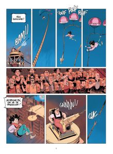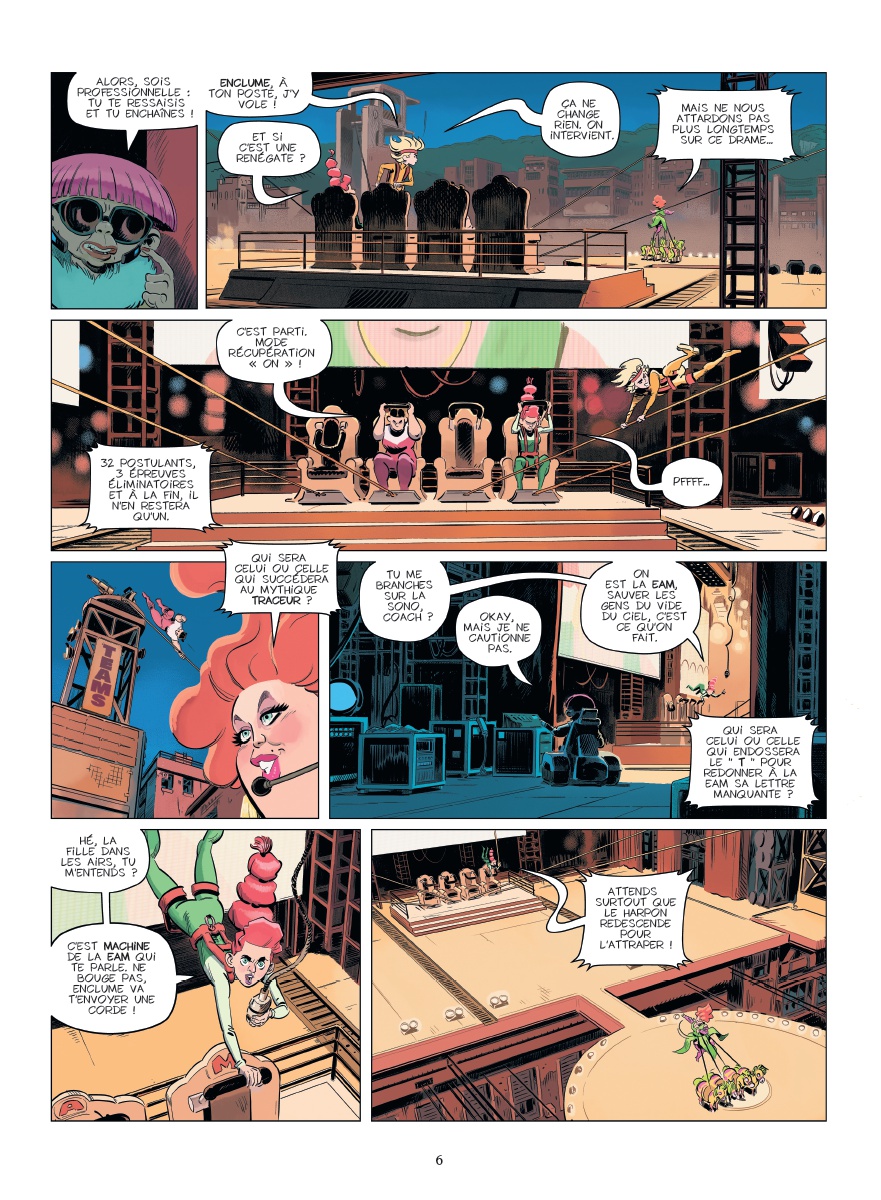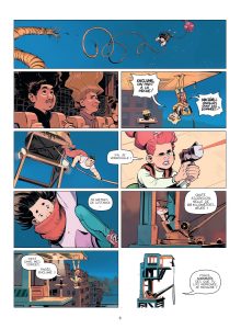 Une fois encore, cet étrange univers imaginé par Stéphane Betbeder pour un public assez jeune se révèle très exigeant et nécessitera sans doute plusieurs lectures pour que certains assimilent tous les éléments de son scénario. Dès l’ouverture de ce nouveau tome, l’action démarre et les règles de ce monde sans gravité ne sont qu’expliquées petit à petit. L’apparition de nombreux nouveaux personnages n’ayant au bout du compte pas une grande utilité prend longtemps le pas sur l’héroïne et ses compagnons d’infortune, avant que tout ne s’éclaircisse patiemment. Le fait d’avoir une pagination généreuse pour un tel projet est clairement appréciable, ce qui permet à l’histoire de ne pas être tronquée et à Paul Frichet de fournir des planches aérées, dans lesquelles les séquences peuvent être longuement présentées. Son graphisme très coloré, expressif et dynamique, est un bon contrepoint à une intrigue plus touffue que la moyenne du genre.