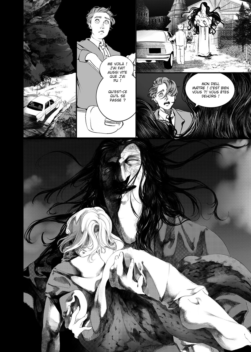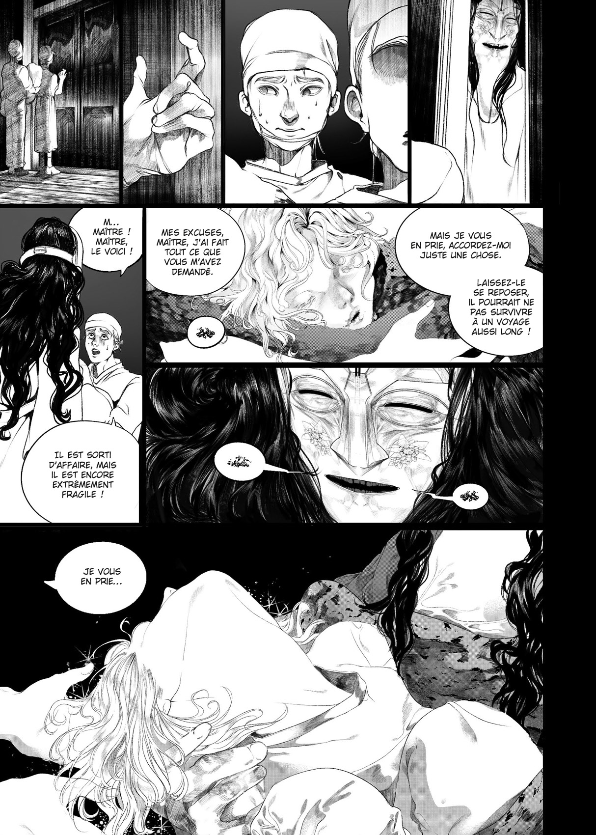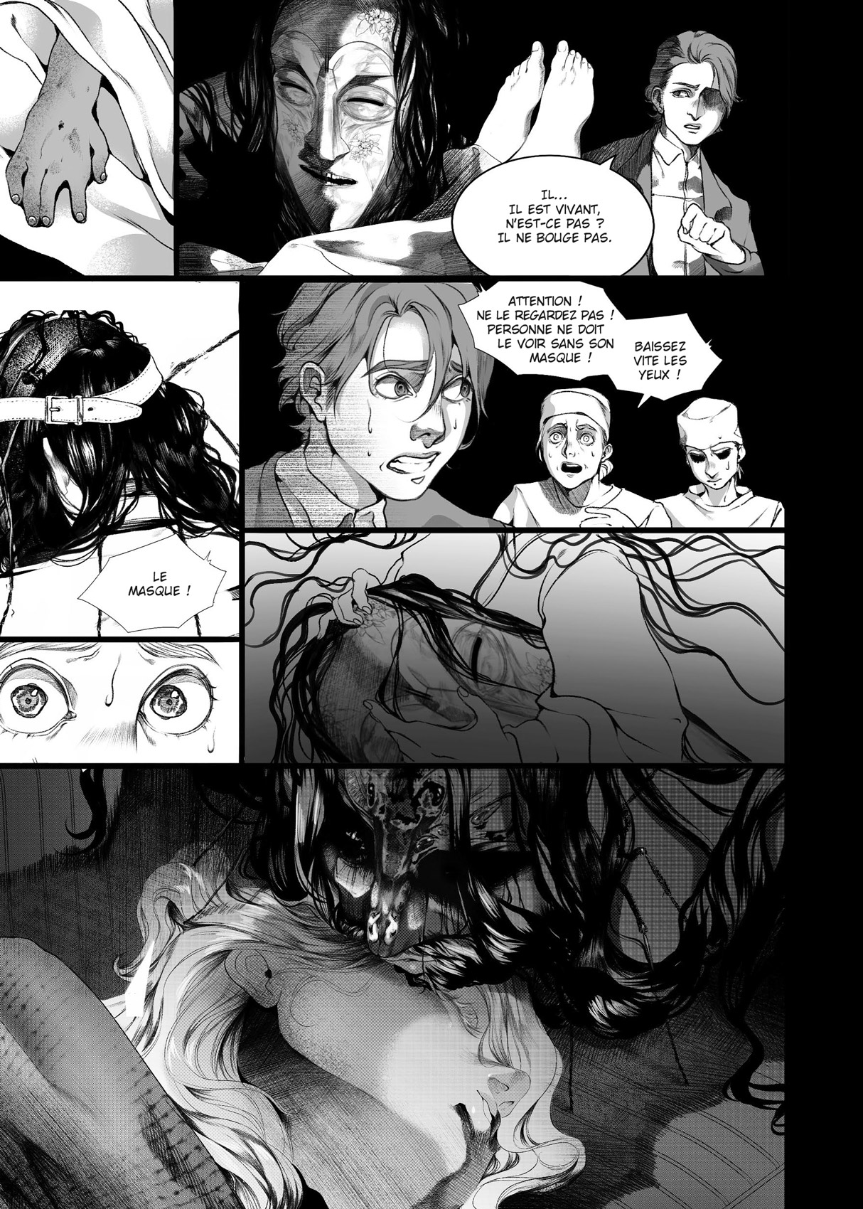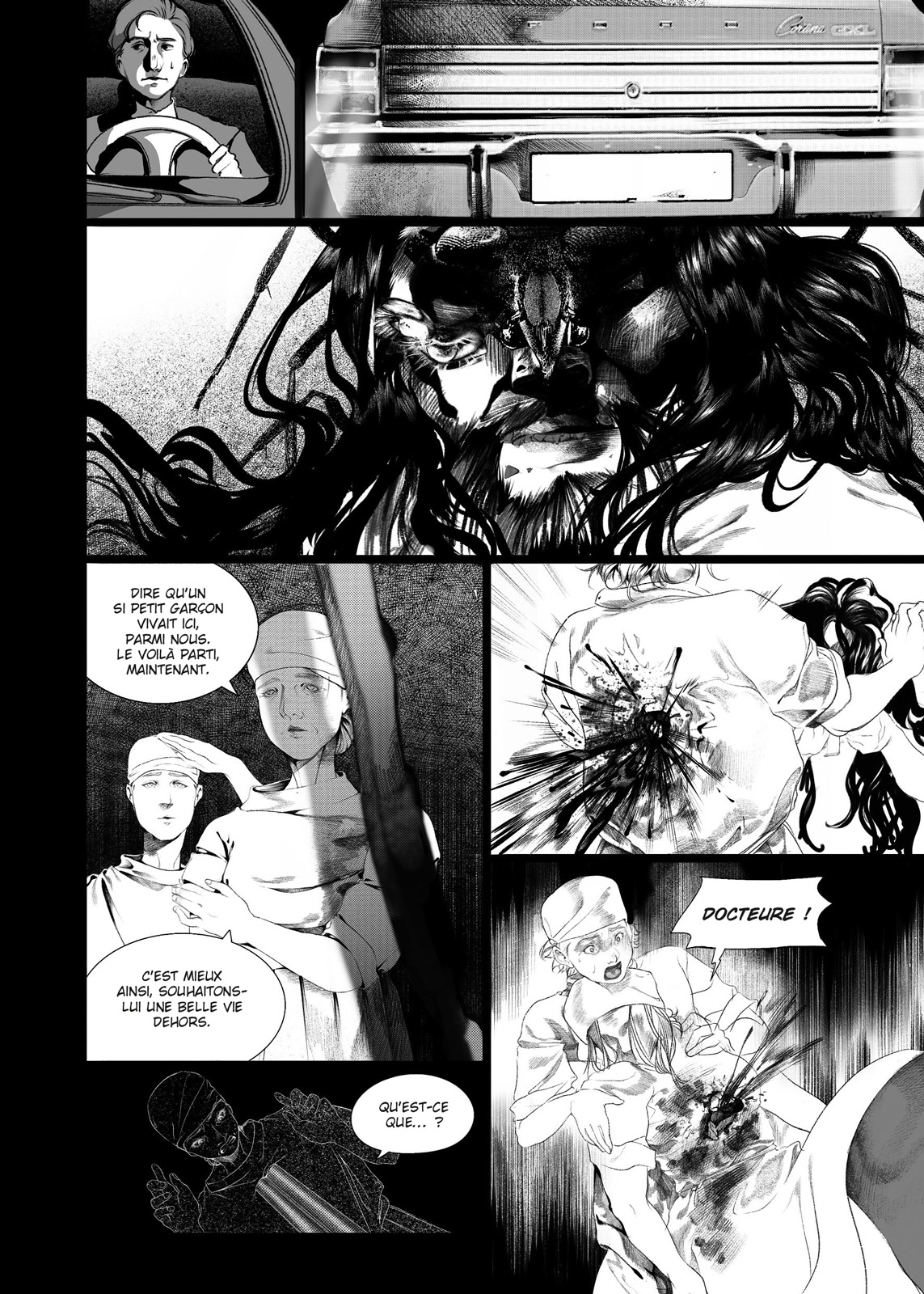 Moody Rouge est assez remarquable à plusieurs points de vue, d’autant plus lorsque l’on sait qu’il s’agit là de la première bande dessinée, disons plutôt du premier manga, d’Ariane Astier. Ce récit marque par sa qualité d’écriture qui dégage des ambiances horrifiques et malaisantes assez fortes relayées par un graphisme d’une beauté et d’une maturité assez incroyables. La jeune autrice lyonnaise maîtrise parfaitement les codes du genre et s’inscrit en toute modestie dans la lignée de ceux de Naoki Urasawa (Monster) ou encore Junji Ito (Tomie). Contrairement aux mangas classiques où les premières planches sont souvent en couleurs, Ariane Astier a pris le parti d’insérer six superbes illustrations colorisées, dont une double planche, à divers passages marquants de l’album. Elles sont autant d’impacts visuels et narratifs d’importance qui appuient les sensations d’enfermement, de gêne, de peur, de douleur mais aussi l’onirisme et le fantastique de l’univers dans lequel évoluent les personnages. Ajoutons à cela une maquette qui confère à l’album un côté à la fois mignon par la taille (150cm par 210cm) et suranné dans le style vieux livre.