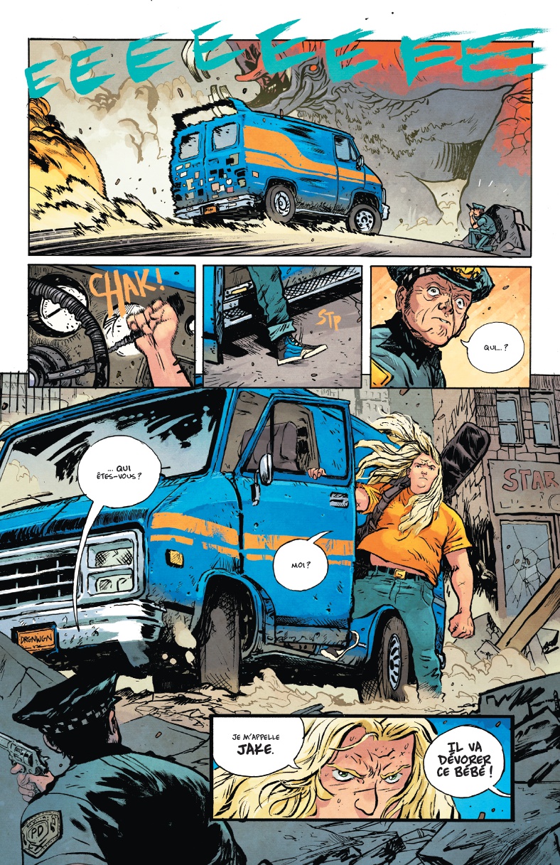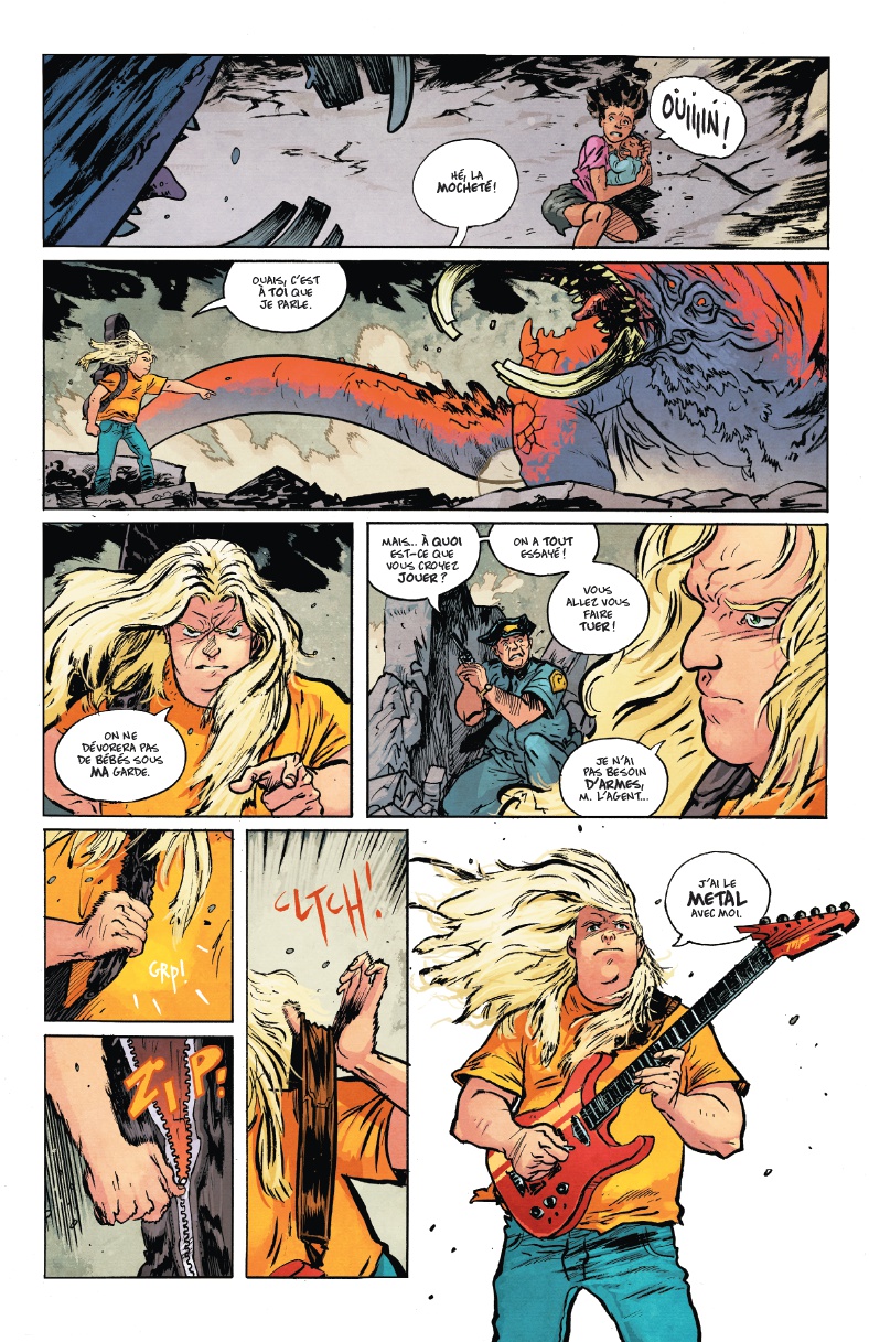 Delcourt réédite déjà cet album paru une première fois en 2020, alors que l’artiste américain se fait une place de plus en plus importante parmi les auteurs à suivre. Quelques jours avant l’étonnant The Moon is following us chez Urban Comics, Murder Falcon est donc remis en avant avec une nouvelle couverture notamment. C’est l’occasion rêvée de découvrir une des plus grandes passions de Daniel Warren Johnson, la musique metal. Rarement une bande dessinée aura aussi bien retranscrit la fureur sauvage et joyeuse de ce rock brut, en célébrant des légendes éternelles telles que Ronnie James Dio ou Lemmy Kilmister et en soulignant le bonheur de faire émerger des sons cathartiques. L’auteur joue particulièrement bien des émotions, avec l’histoire douloureuse de Jack – le final n’est pas garanti sans larmichette – et l’amitié salvatrice et réparatrice. Bien sûr, le reste de l’intrigue est très mince, avec son invasion de monstres hideux servant de simples méchants et un déroulement très linéaire. Mais l’essentiel est ailleurs, dans cette déclaration d’amour au metal et dans la célébration de la vie sous toutes ses formes.