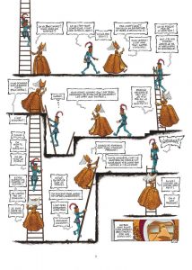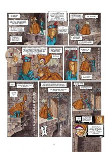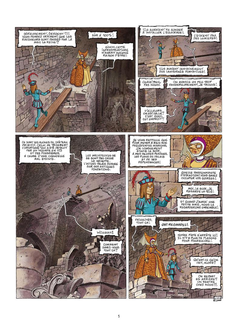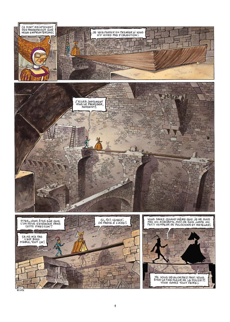 Le sergent Bonvoisin et Baltimore suivent la piste que ce dernier a trouvé sous la scène du théâtre. Après un parcours montant et descendant d’échelles, les voilà sur des planches au-dessus des fondations du château de « Sigebert l’infortuné » à partir desquelles l’édifice actuel est construit. Un monte-charge artisanal non référencé plus tard, ils atteignent une étendue d’eau sous-terraine qu’ils traversent en barque pour arriver le plus discrètement du monde dans les douves du château. À coup sûr, les ravisseurs de la reine Ophélie ont pris le même chemin ! Une intuition en partie confirmée par la présence d’habits dans une cabane non loin de là, vêtements qui pourraient sans aucun doute appartenir à la souveraine et dont Baltimore doit se parer sur ordre du sergent Bonvoisin afin de ne pas éveiller les soupçons… ou le ridiculiser ! Dans les hauteurs du palais, Gonzague met le doigt sur un indice grâce au Roy, prouvant définitivement que ses comptes sont bons et qu’il y a bien une malversation à l’origine des caisses vides de l’État. De son côté, l’inspecteur Roussin sort blanc comme neige du kioske de police de la Podespo et s’illustre rapidement lors d’un contrôle concernant Ambroise 1er. Après un bon dodo, les deux policiers émérites reprennent leurs investigations sur le trafic de coloquintes et non celles à propos de la disparition de la reine Ophélie ? Tout va à hue et à dia !