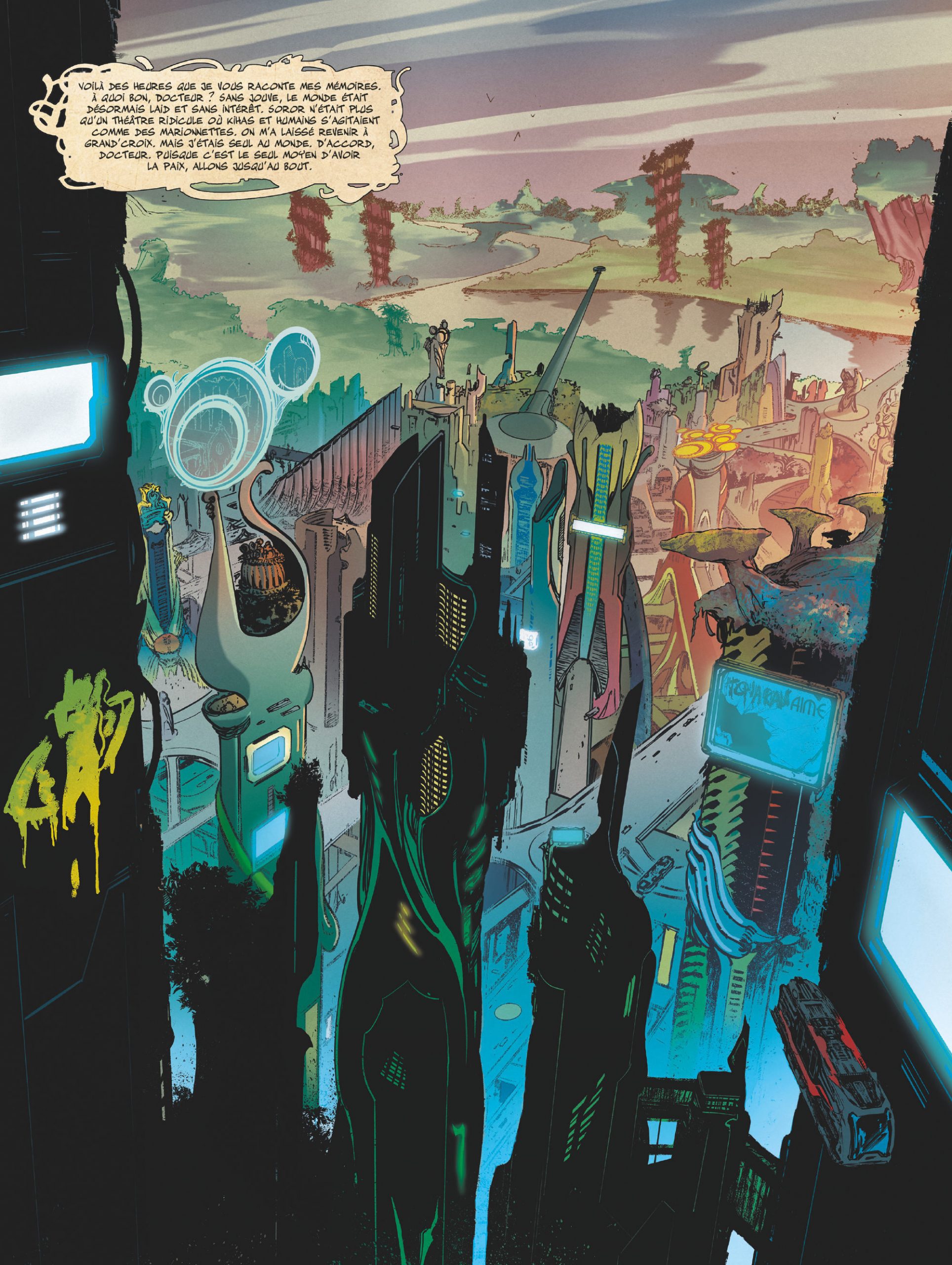 Après cinq ans d’attente, voici enfin la suite et fin de Noô, adaptation du roman de science-fiction de Stefan Wul. On retrouve avec plaisir les aventures de Brice Jouve, après la mort de son père adoptif, d’autant que de nombreuses péripéties l’attendent. Tellement nombreuses d’ailleurs qu’elles vont un peu vite, ne permettant pas de prendre le temps de tout comprendre. Le scénario de Laurent Genefort est efficace, mais il manque parfois quelques explications, les événements s’enchaînant sans réelles transitions, laissant un peu perdus. Heureusement les dessins d’Alexis Sentenac sont toujours aussi réussis, notamment les décors de la planète Soror, dont on découvre ici une grande mégapole, après les plaines désertiques et les forêts luxuriantes des précédents tomes. La fin se déroulant dans l’espace est également visuellement superbe, à défaut d’être scénaristiquement intéressante. On ressort donc de cette lecture un peu frustré après autant de temps à attendre sa conclusion, même si l’ensemble des trois tomes s’avère tout de même intéressant.