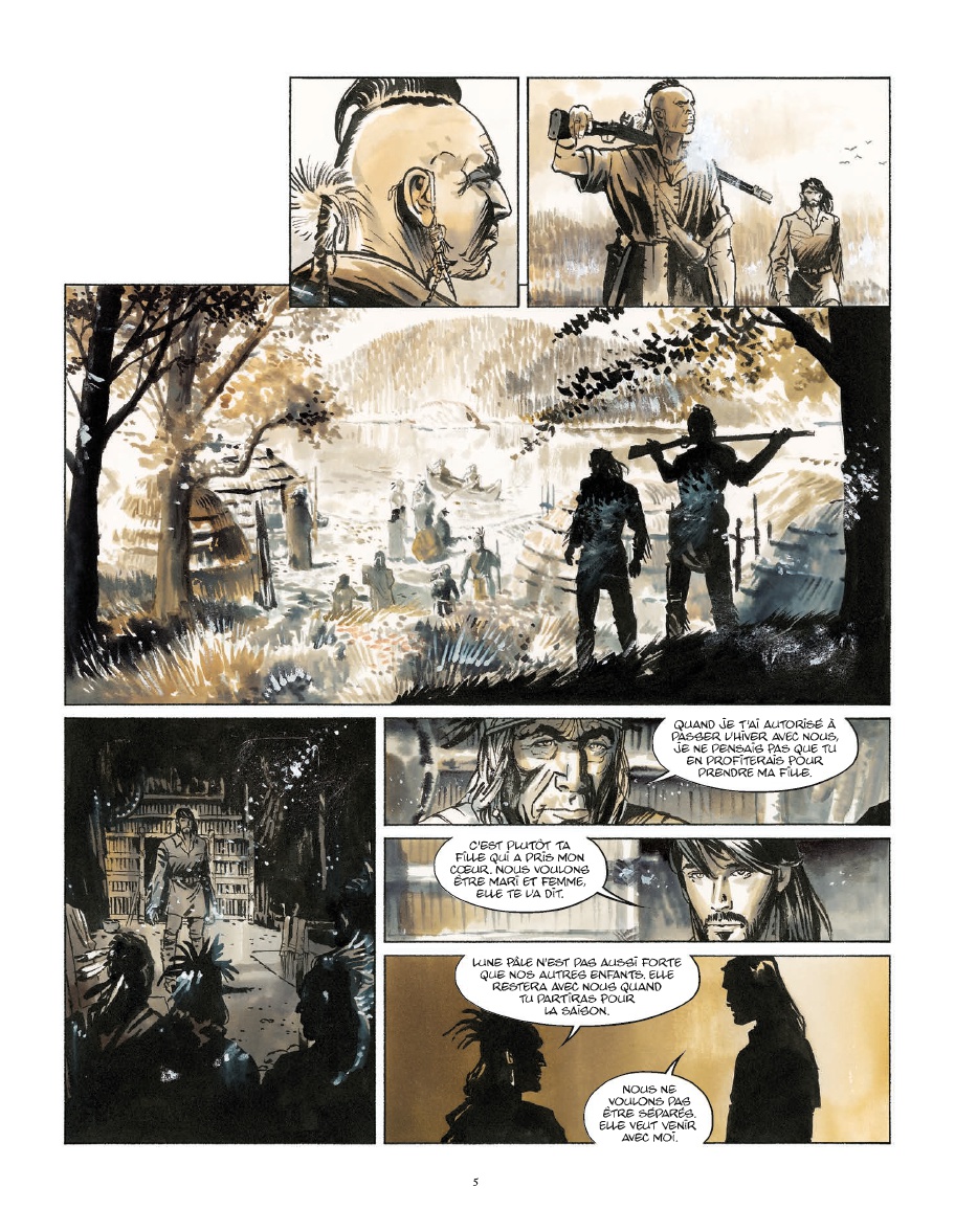 1754, dans la vallée de l’Ohio. Pierre Larchange est un coureur des bois expérimenté ayant fondé une famille avec une Indienne de la tribu des shawnees. Devenu éclaireur pour l’armée de France sur le continent américain, il assiste à une négociation entre soldats français et britanniques. Celle-ci tourne au fiasco quand un tomahawk iroquois, tribu alliée des Britanniques, vient tuer sur le coup le commandant Joseph de Jumonville. Dès lors les hostilités entre les deux nations sont lancées mais ce qui importe avant tout à Pierre Larchange est de poursuivre et arrêter l’Iroquois responsable de tout ce drame, Aakash…