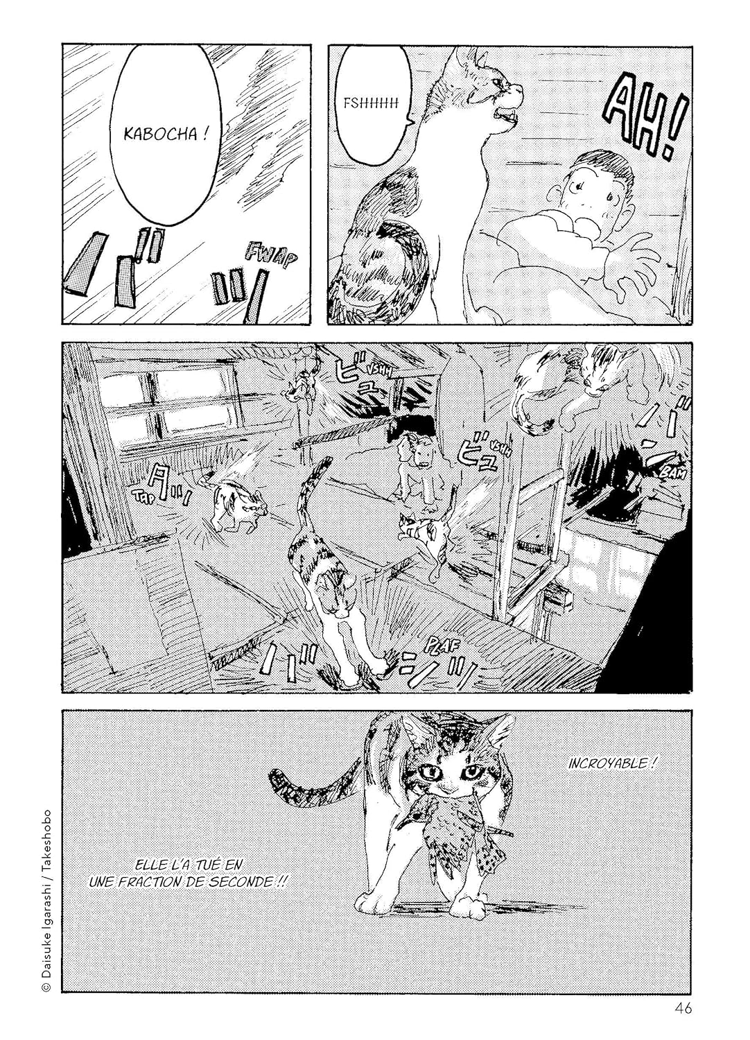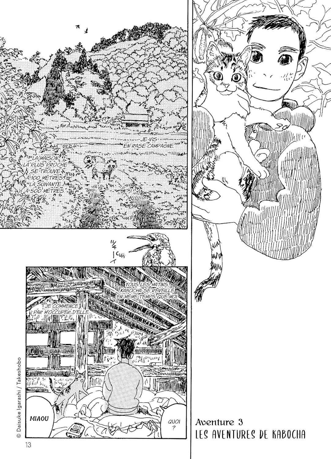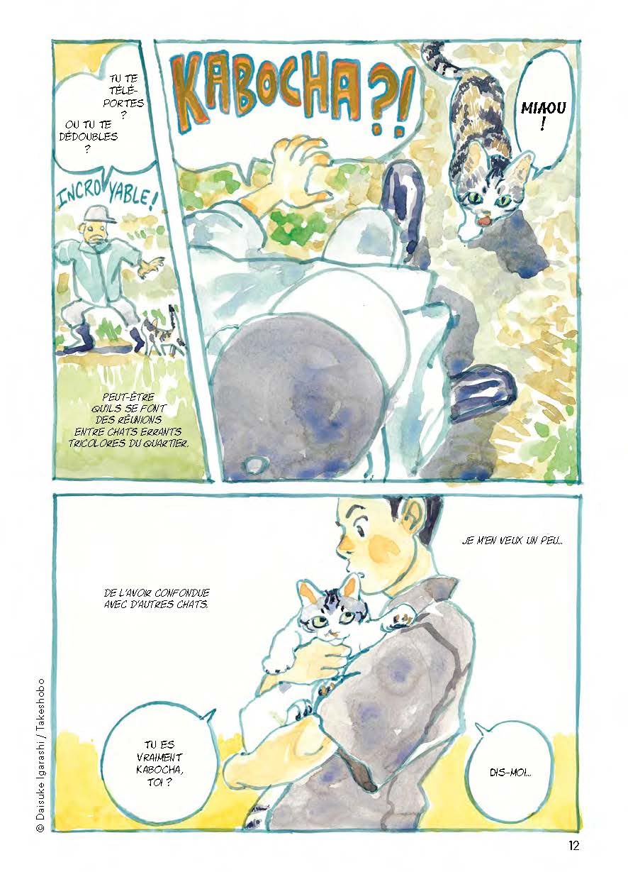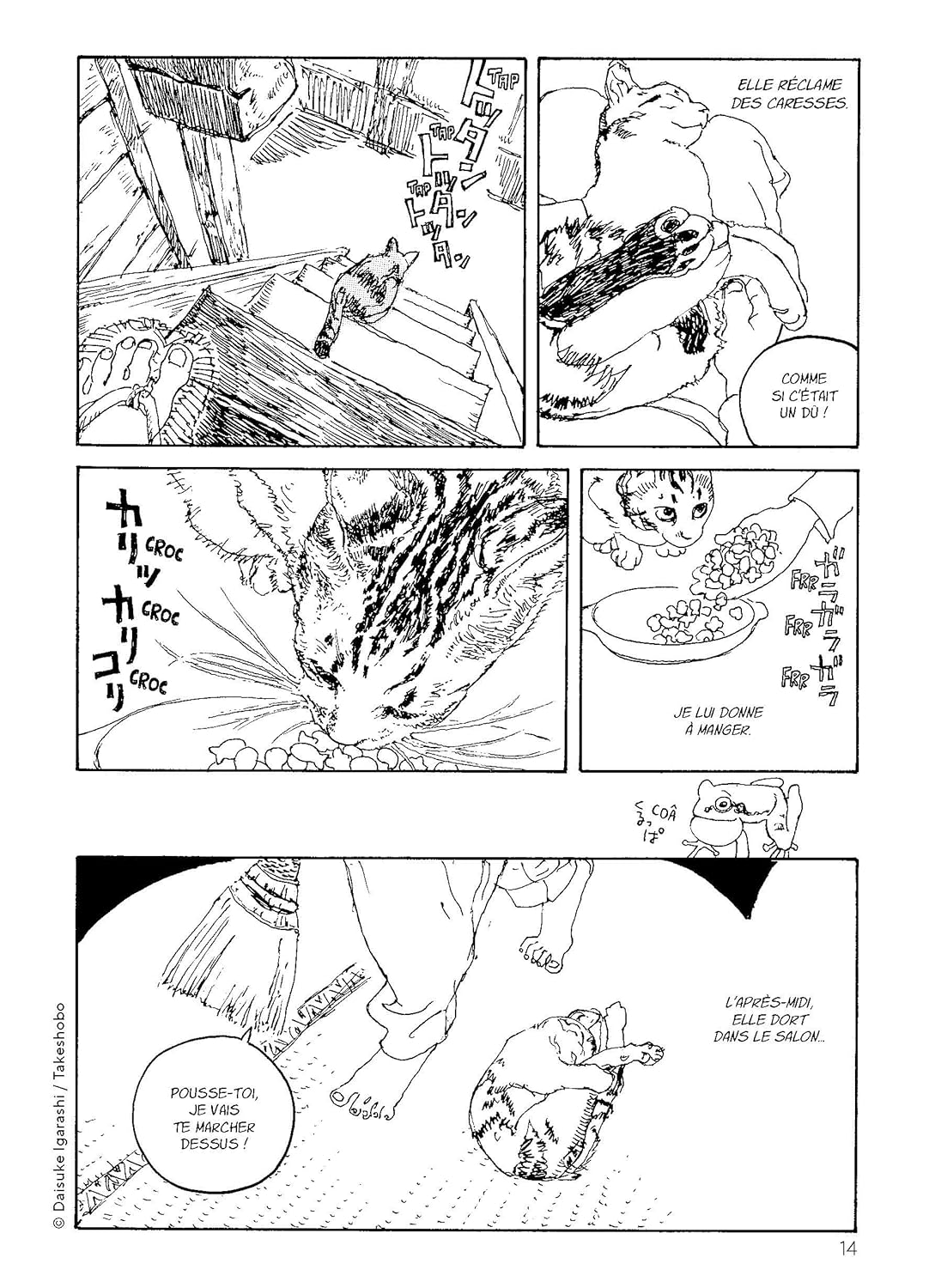 Avec Le Petit monde de Kabocha, on suit les aventures toutes mignonnes de la chatte Kabocha et de son maître. Chaque chapitre nous raconte un moment de vie de la minette, que ce soit des rencontres avec d’autres animaux ou bien encore sa manie de grimper sur le toit et de miauler sans cesse jusqu’à ce que son maître vienne la chercher, alors qu’elle est évidemment tout à fait capable d’en descendre toute seule. C’est justement tout cela qui fait l’intérêt de ce petit manga qui plaira sans nul doute à tous les amoureux de chats, qui y retrouveront parfois une partie des facéties que leur ami félin peut également leur faire subir. Visuellement toutefois ce n’est souvent pas parfait, notamment dans les proportions et surtout lorsqu’il s’agit du maître, qui a bien souvent un visage et des expressions plutôt ratées, alors que les paysages et animaux sont eux en général très réussis. Mais cela n’empêche en rien de passer un très bon moment de douceur à la lecture de ces mignonnes petites aventures félines.