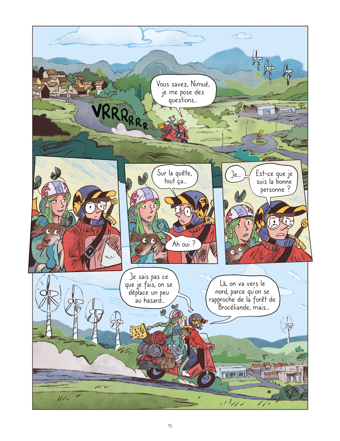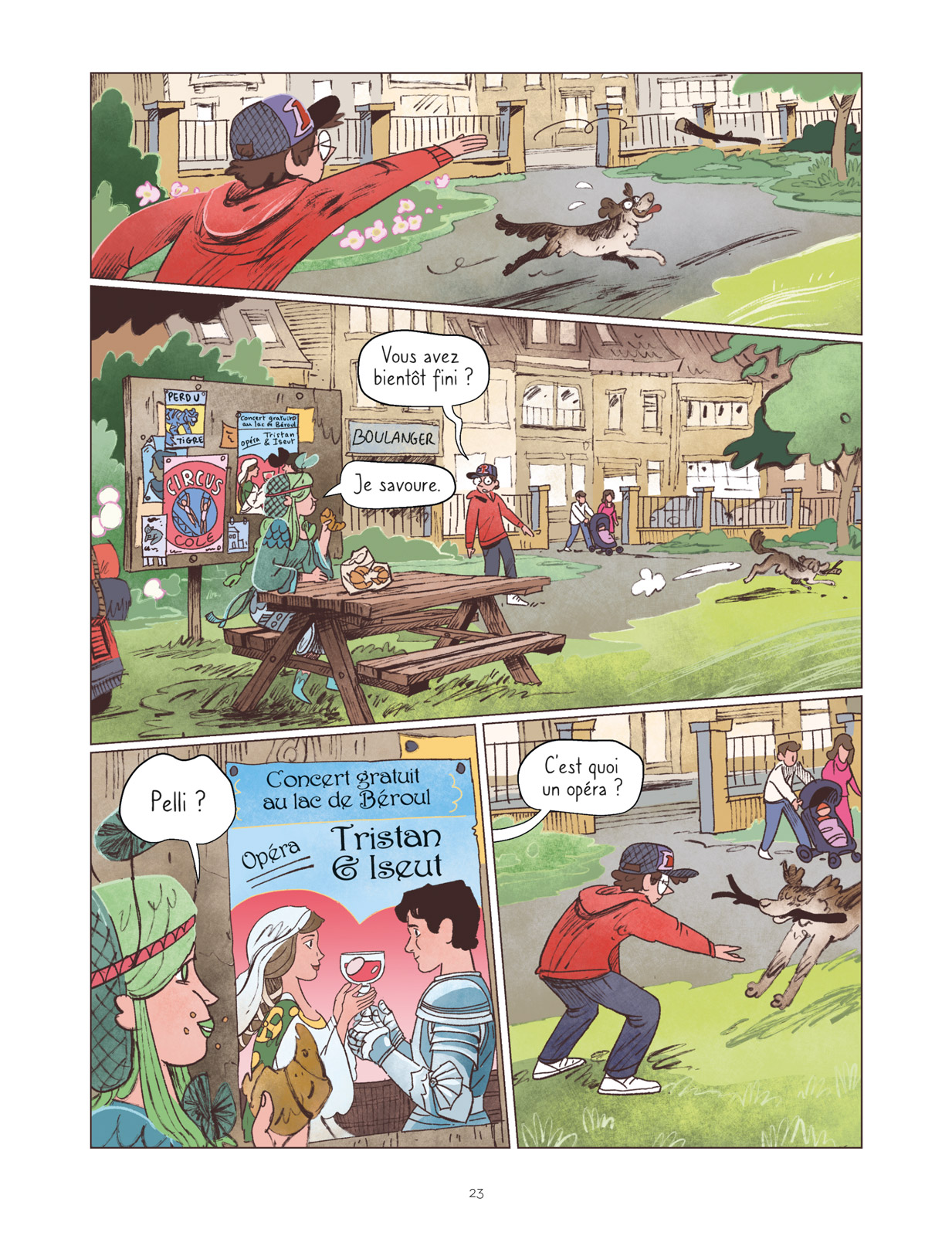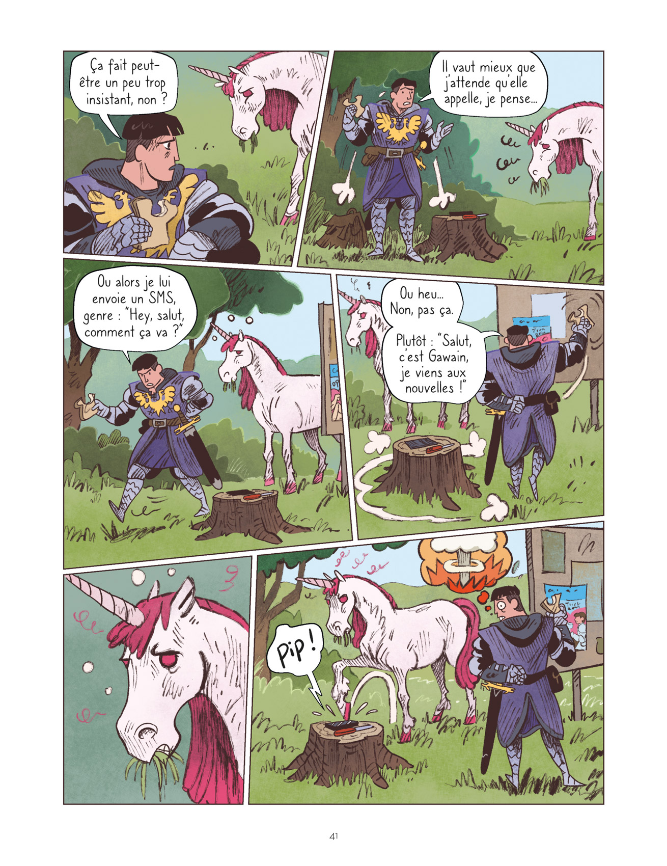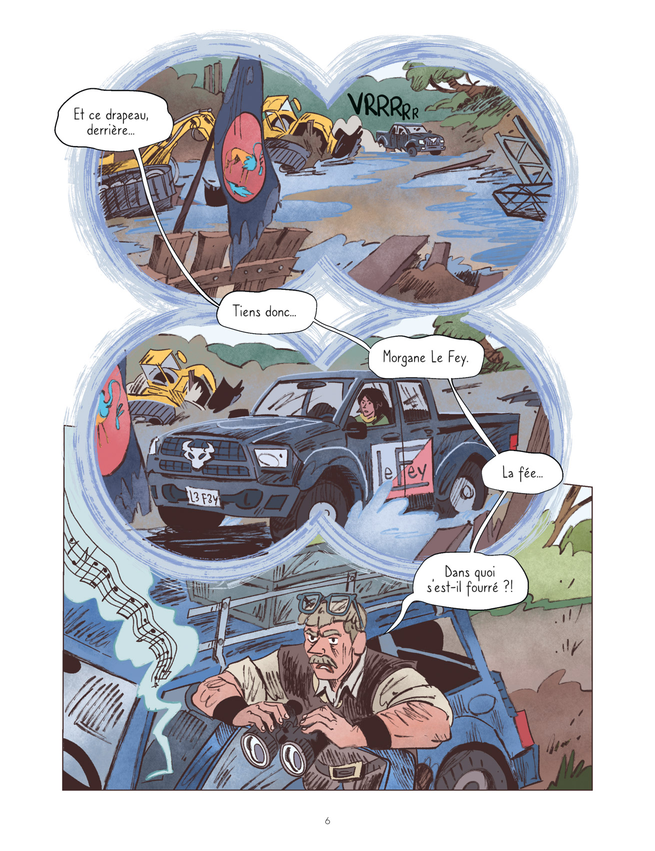 Le grand-père de Pelli observe de loin le chantier de l’autoroute stoppé par la rupture de la canalisation qui a inondé la vallée du roi Pêcheur. Il y voit Morgane Le Fey contrariée et ses agents de la banalité, ce qui ne présage rien de bon. Pire, il assiste à l’arrivée de son fils qui semble… qui a rejoint l’ennemi. En effet, la fée lui demande de reprendre sa quête pour stopper celle de son fils car, en traquant la bête questante avec Minué, il fait revenir la magie dans le monde. Pour cette mission, il fera équipe avec IIseut, ce qui n’enchante ni l’un ni l’autre. De leur côté, Pelli et Minué sont un peu en désaccord. La fée aimerait voir un opéra qui se joue non loin d’où ils se trouvent, alors que le jeune homme est décidé à poursuivre sa quête coûte que coûte. Dans le coin, Gawain et sa licorne Lune “échangent” à propos du béguin du chevalier pour Percie. Une discussion qui se conclut par un rencard à… l’opéra ! Et devinez ce que fait la bête questante alors qu’elle est tenue en joue sans le savoir ? Elle écoute du Wagner ! Il ne manquerait plus qu’un dragon pour compléter le tableau !