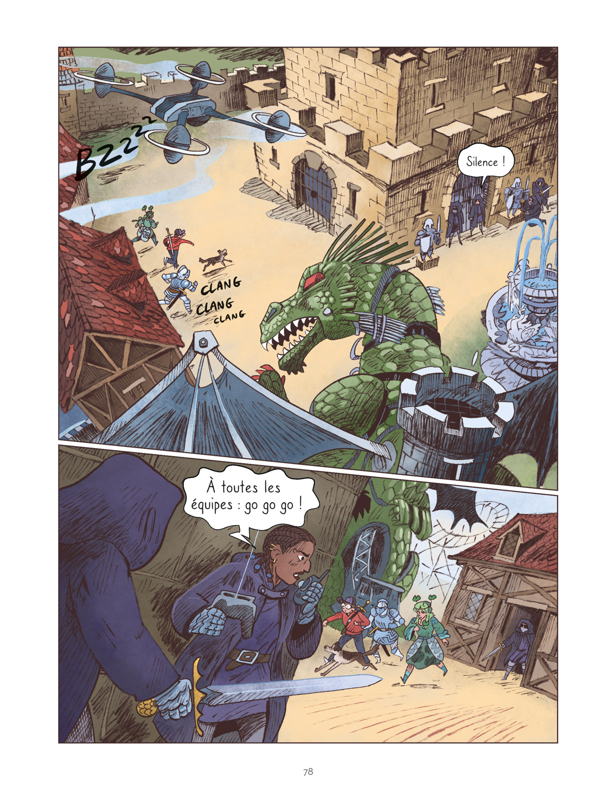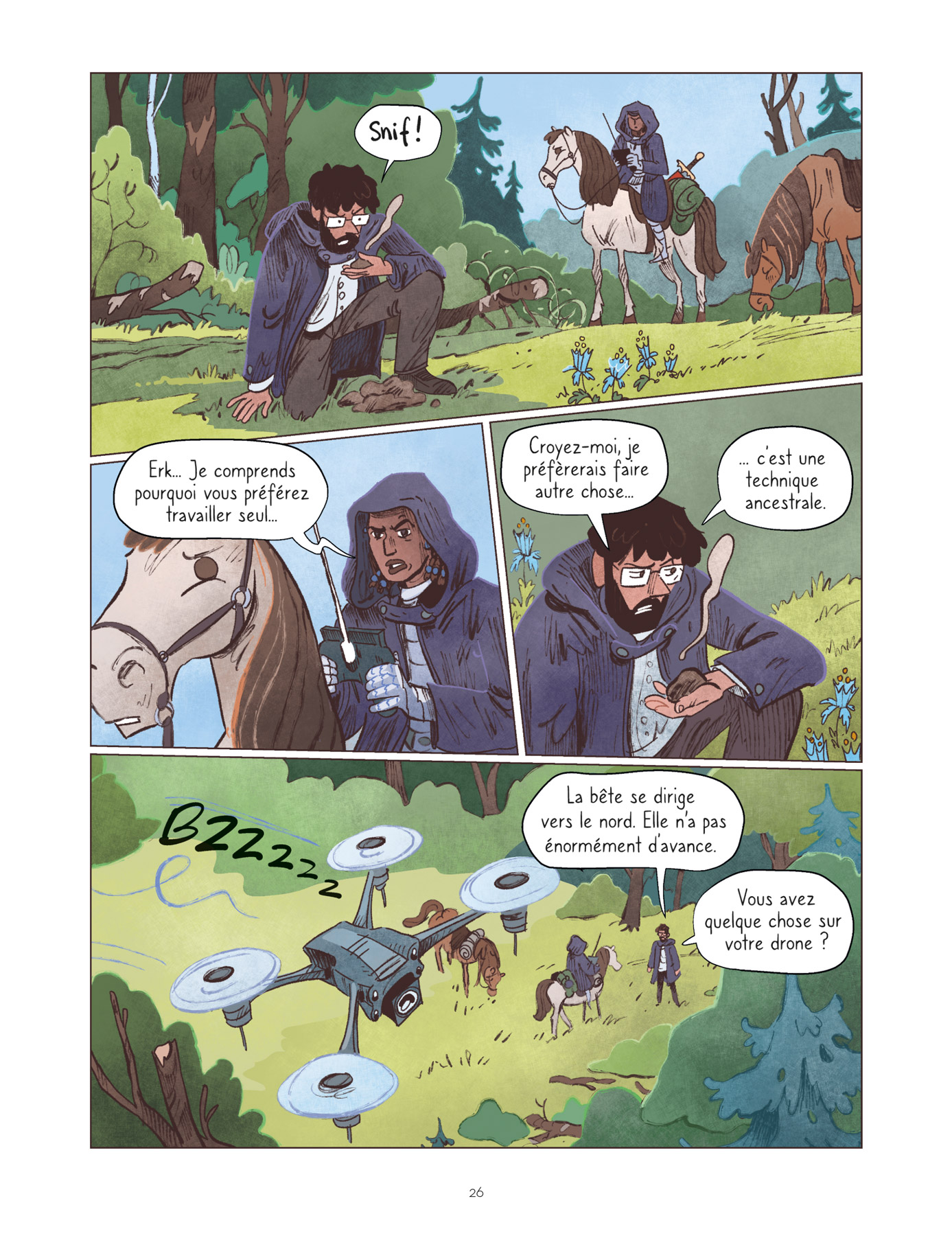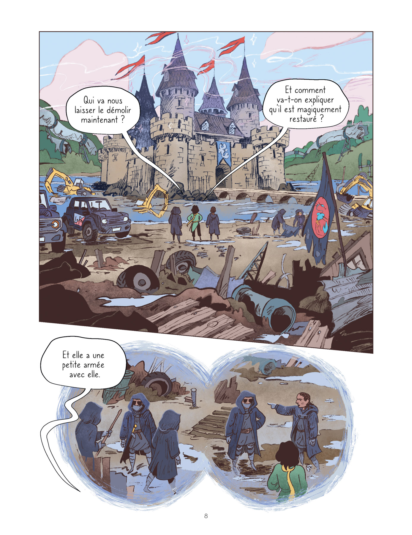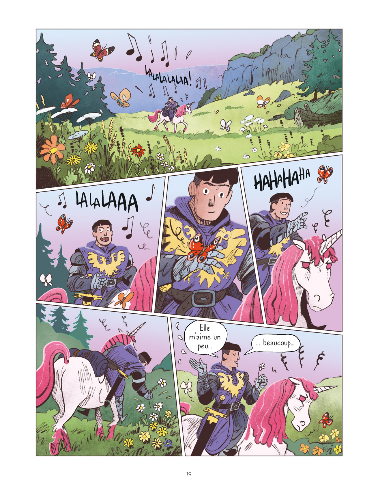 Le grand-père de Pelli observe de loin le chantier de l’autoroute stoppé par la rupture de la canalisation qui a inondé la vallée du roi Pêcheur. Il y voit Morgane Le Fey contrariée et ses agents de la banalité, ce qui ne présage rien de bon. Pire, il assiste à l’arrivée de son fils qui semble… qui a rejoint l’ennemi. En effet, la fée lui demande de reprendre sa quête pour stopper celle de son fils car, en traquant la bête questante avec Minué, il fait revenir la magie dans le monde. Pour cette mission, il fera équipe avec IIseut, ce qui n’enchante ni l’un ni l’autre. De leur côté, Pelli et Minué sont un peu en désaccord. La fée aimerait voir un opéra qui se joue non loin d’où ils se trouvent, alors que le jeune homme est décidé à poursuivre sa quête coûte que coûte. Dans le coin, Gawain et sa licorne Lune “échangent” à propos du béguin du chevalier pour Percie. Une discussion qui se conclut par un rencard à… l’opéra ! Et devinez ce que fait la bête questante alors qu’elle est tenue en joue sans le savoir ? Elle écoute du Wagner ! Il ne manquerait plus qu’un dragon pour compléter le tableau !