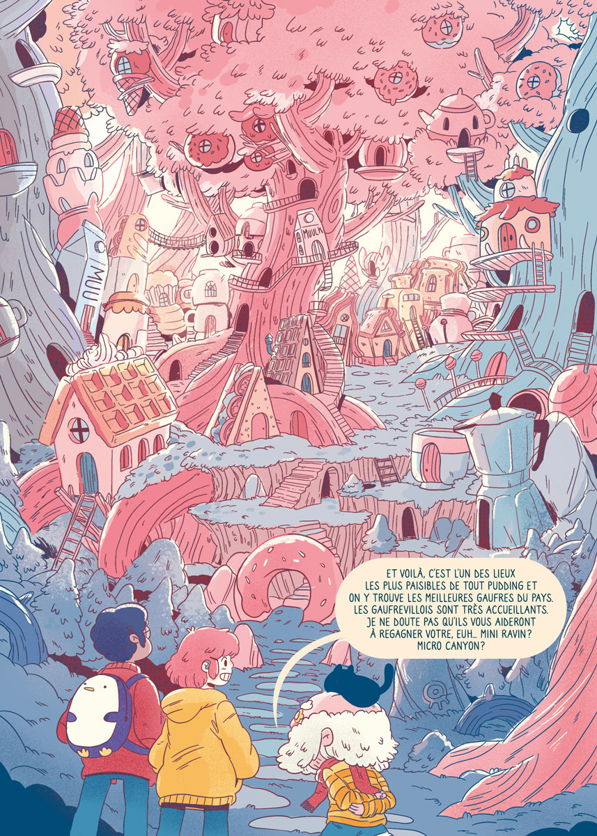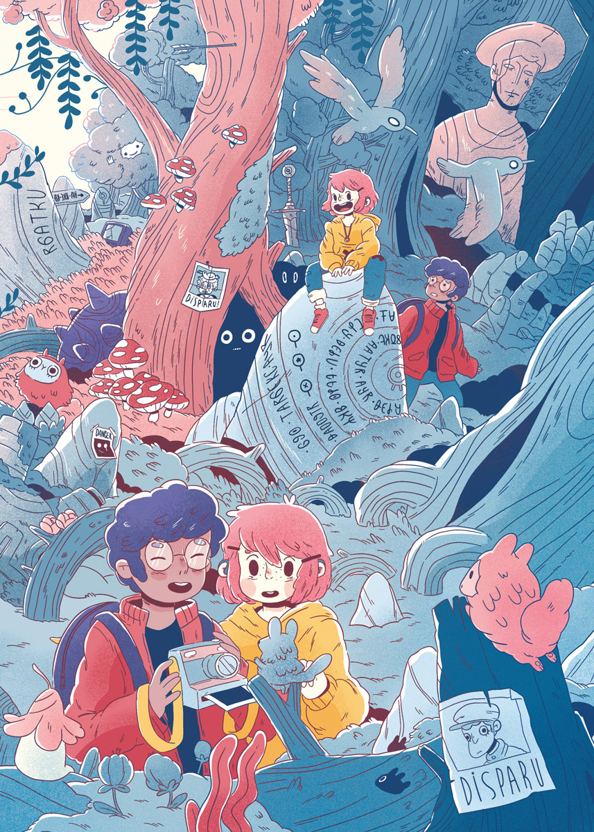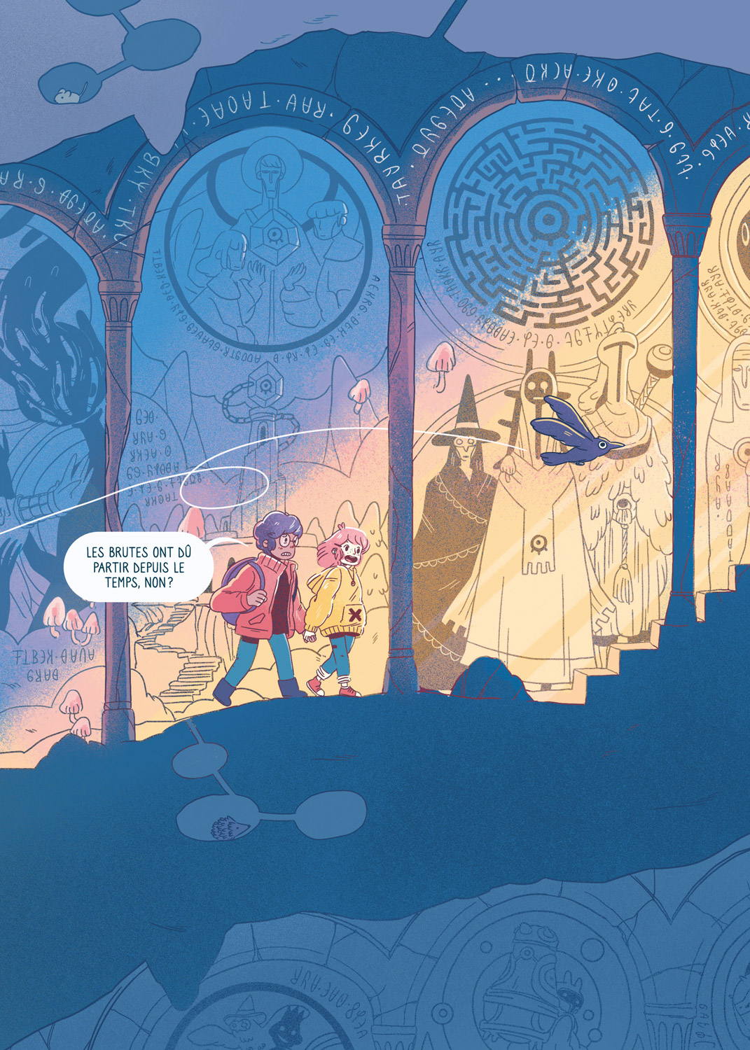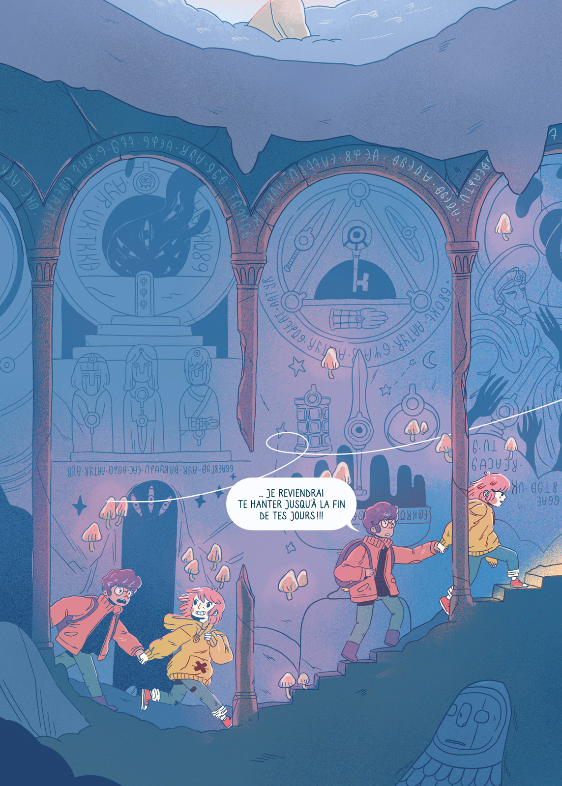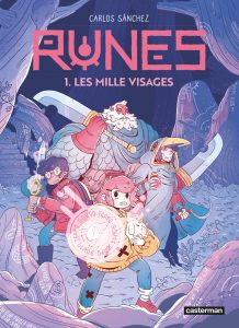 Runes est une série jeunesse (9-12 ans) prévue en trois tomes et réalisée par Carlos Sánchez. Sans nous tromper, nous pouvons dire que les héros de cette aventure fantastique, Chiri et Daï, vont très rapidement conquérir le cœur des lecteurs car leur histoire défend de très belles valeurs, les premières étant l’inclusion et l’acceptation de l’autre. En effet, les deux premières planches exposent le fait que Chiri est sourde et précisent que les bulles colorées correspondent aux dialogues signés. De plus, l’auteur précise que le langage des signes du Petit Val est un mélange de BSL (langue des signes britanniques) et d’une langue des signes fictive qu’il a inventée. Il y est également question d’amitié forte, de solidarité et de lutte contre le harcèlement. L’univers imaginé est ultra original, empreint de magie, consistant et complet avec notamment un alphabet runique présent dans tout Pudding. Chaque inscription peut se traduire et a une réelle signification. Des heures de jeu en perspective ! Les personnages secondaires sont suffisamment nombreux, très intéressants – notamment Sophie – et hauts en couleur. En bref, ce premier tome est une très belle réussite qui tient en haleine du début à la fin. Graphiquement, l’illustrateur impose sans mal une identité affirmée et unique qui est réellement en symbiose avec l’ensemble du récit. Trait et mise en couleurs attirent et régalent les papilles oculaires.