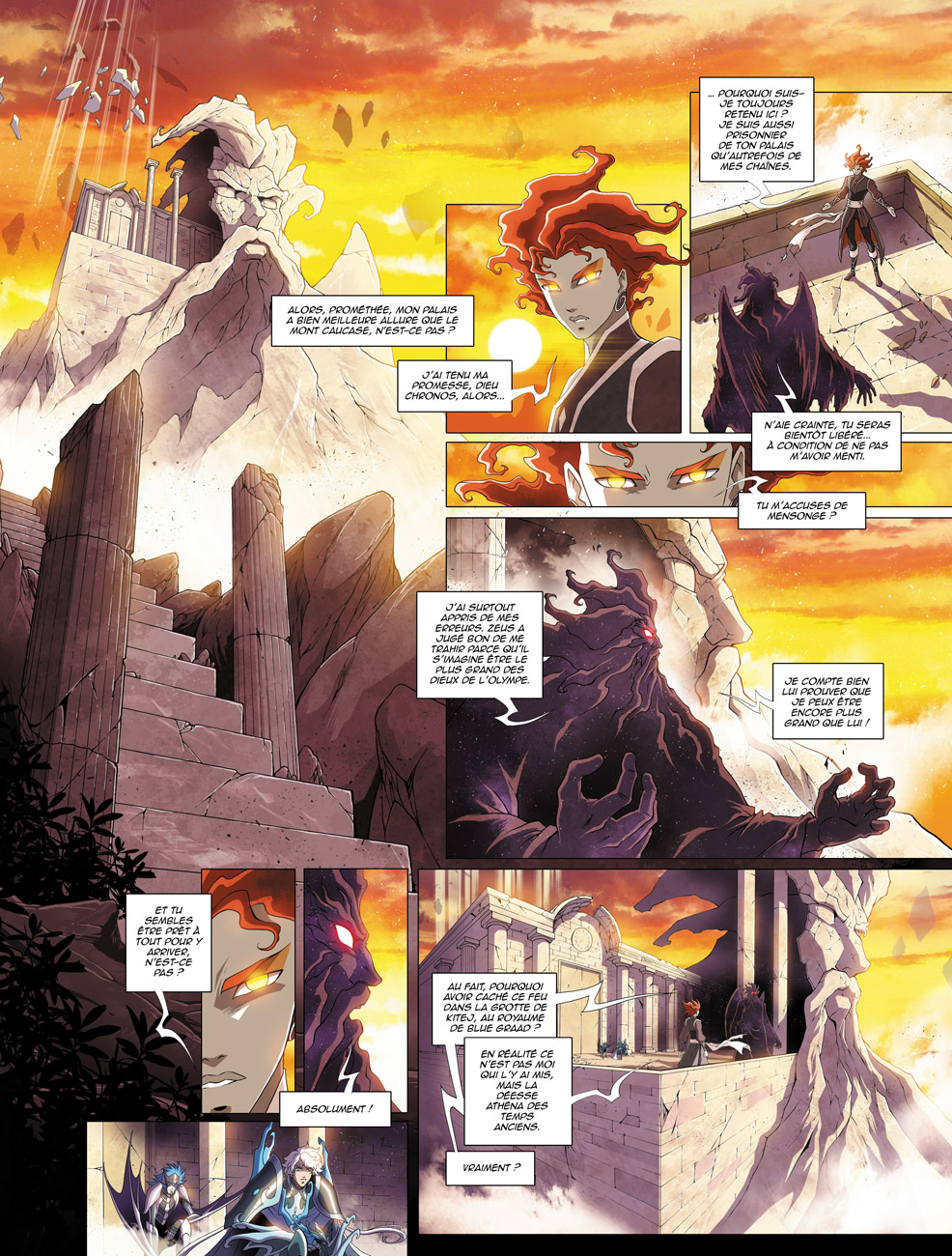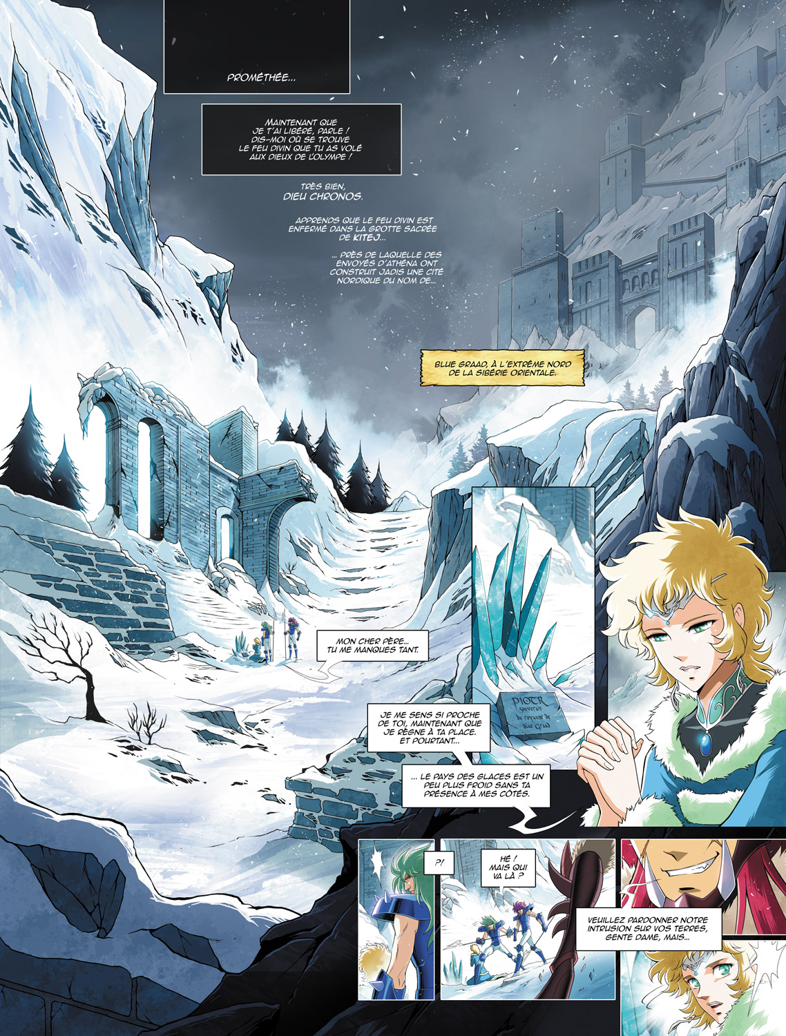 Prométhée est enfin libéré de sa prison du mont Caucase et se trouve dans le palais de Chronos. Il est temps pour le Titan de remplir sa part du marché. Il révèle donc à son hôte que le feu de l’Olympe se trouve dans la grotte sacrée de Kitej, sous les fondations du palais de la cité de Blue Graad dans l’extrême nord de la Sibérie orientale. Cependant, il y a un obstacle de taille pour y pénétrer : seule Athéna peut l’ouvrir, son sceau apposé sur la porte ne l’ouvre qu’au contact de son cosmos. C’est exactement pour cela que Chronos agit maintenant. Saori, réincarnation de la déesse, se rend justement à Blue Graad avec quelques-uns de ses chevaliers après la récente victoire sur Julian Solo afin de ramener à Kitej l’urne renfermant l’âme du dieu des océans comme cela a déjà été le cas auparavant. Un groupe de guerriers du dieu du temps se rend sur place pour profiter de cette occasion afin de lui ramener le feu divin dont il a besoin pour concevoir les rouages de son Horloge de l’Apocalypse. Ainsi, la princesse Natassia et deux de ses blue warriors puis le prince Alexer font face aux quatre premières Leptas avant que Hyôga, venu annoncer l’arrivée de Saori, n’intervienne pour les sauver. Une nouvelle bataille est engagée !
