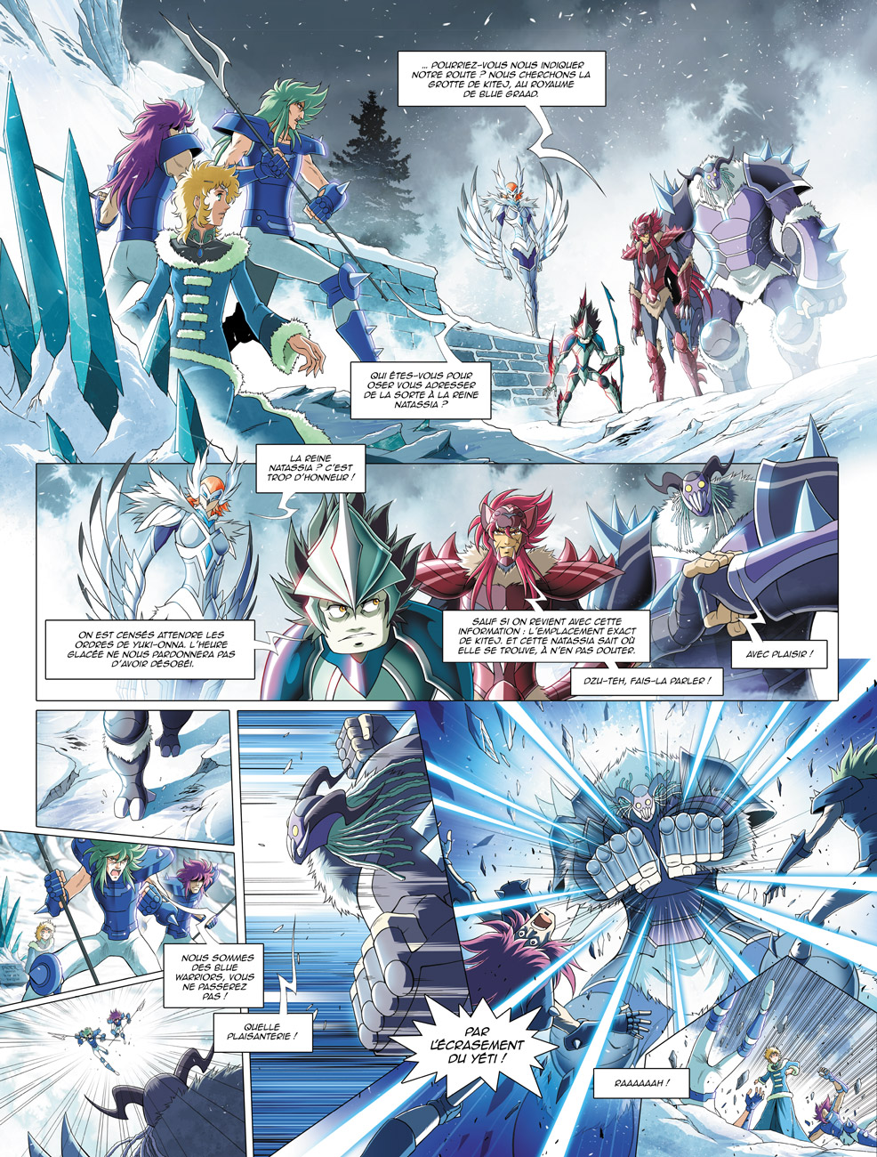 Tout en poursuivant le développement de la trame principale de leur récit, Arnaud Dollen et Jérôme Alquié font intervenir un grand nombre de personnages – existants et créés par leurs soins – pour nous proposer un épisode hors du commun et d’une densité incroyable. Le rythme narratif très élevé et la succession des coups de théâtre, mais aussi des nombreuses révélations, tiennent en haleine les lecteurs du début jusqu’à la fin sans leur laisser le temps de reprendre leur souffle. Les auteurs prouvent une fois de plus leur énorme capacité à prolonger l’existant et à développer de nouveaux axes d’évolution avec un respect absolu de l’œuvre de Masami Kurumada. Comme le suggère la couverture, ce troisième opus est centré essentiellement sur Hyôga dont l’histoire personnelle, notamment ses liens affectifs avec sa mère, son maître Camus du Verseau et Milo du Scorpion, est parfaitement exploitée. De même que le lieu où se déroule l’action est en totale adéquation avec le chevalier du Cygne et la proposition de la situer juste après l’arc de Poséidon. Saluons les trouvailles concernant les caractérisations des Heures et des Leptas qui reposent sur des légendes nordiques, celtiques, inuites, entre autres… et même japonaises, en particulier l’Heure Yuki-Onna, la mort aux doigts glacés, qui est un Yokai. Graphiquement, c’est une masterclass de Jérôme Alquié ! La passion transpire de ses dessins et de ses mises en page audacieuses dans chaque planche qu’il est donné de parcourir. Et que dire des apparitions enflammées d’Ikki et de l’intervention de Kanon, ex-général Marinas, un pur régal ! Si l’occasion vous est donnée de vous procurer une édition collector, n’hésitez pas. Elle comprend un fourreau représentant le coffre de l’armure de Hyôga, un album grand format incluant un livret collector sur les coulisses de la création de celui-ci qui regorge de détails incroyables, une « side story » très intéressante et deux pages de bande dessinée supplémentaires, intégrées au récit, par rapport à la version classique.