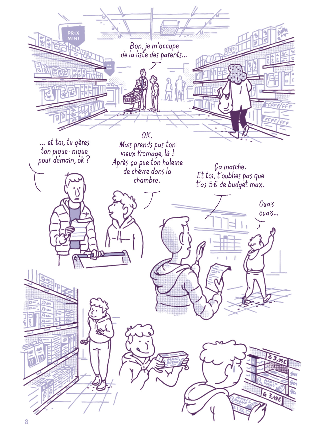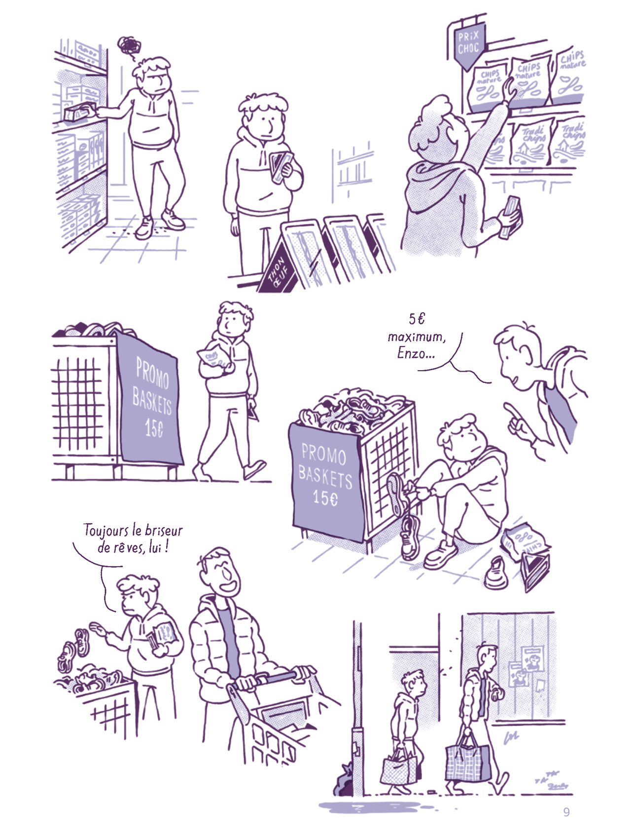 Le scénario de cette bande dessinée est librement inspiré du livre Une brève histoire de l’égalité de Thomas Piketty paru au Seuil en 2021. Le travail de composition réalisé par Julie Scheibling est de belle facture et aboutit à un récit tout à fait intelligible pour le public visé. Le titre est particulièrement bien choisi car il est à double sens. En effet, il s’agit de jeux de classes d’école/sociales où sont constatées les inégalités. Les quelques mots qui peuvent poser un problème de compréhension aux jeunes lecteurs sont regroupés dans un glossaire qui en donne des définitions claires. La diversité des personnages proposée par la scénariste est tout à fait judicieuse et les caractérisations qu’elle en a réalisées les rendent très rapidement attachants. La partition est interprétée graphiquement par Quentin Vijoux dont le style sert parfaitement les propos et offre une lisibilité optimale. Les cases détourées et le trait allant à l’essentiel y sont pour beaucoup. Tout autant que la douce monochromie violette choisie comme mise en couleurs.