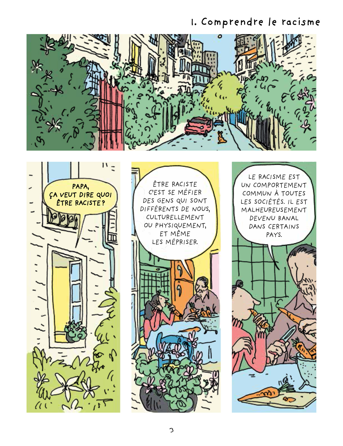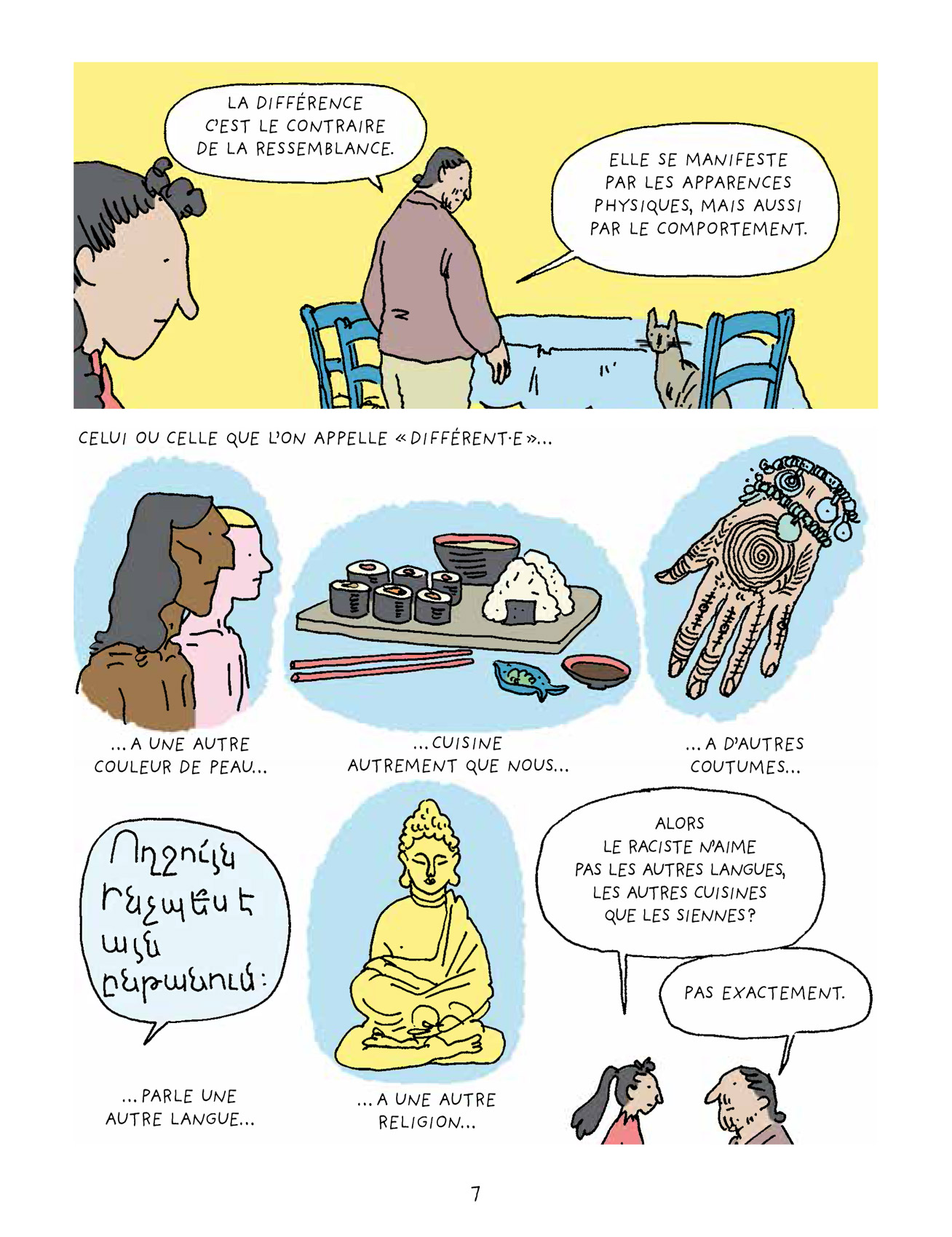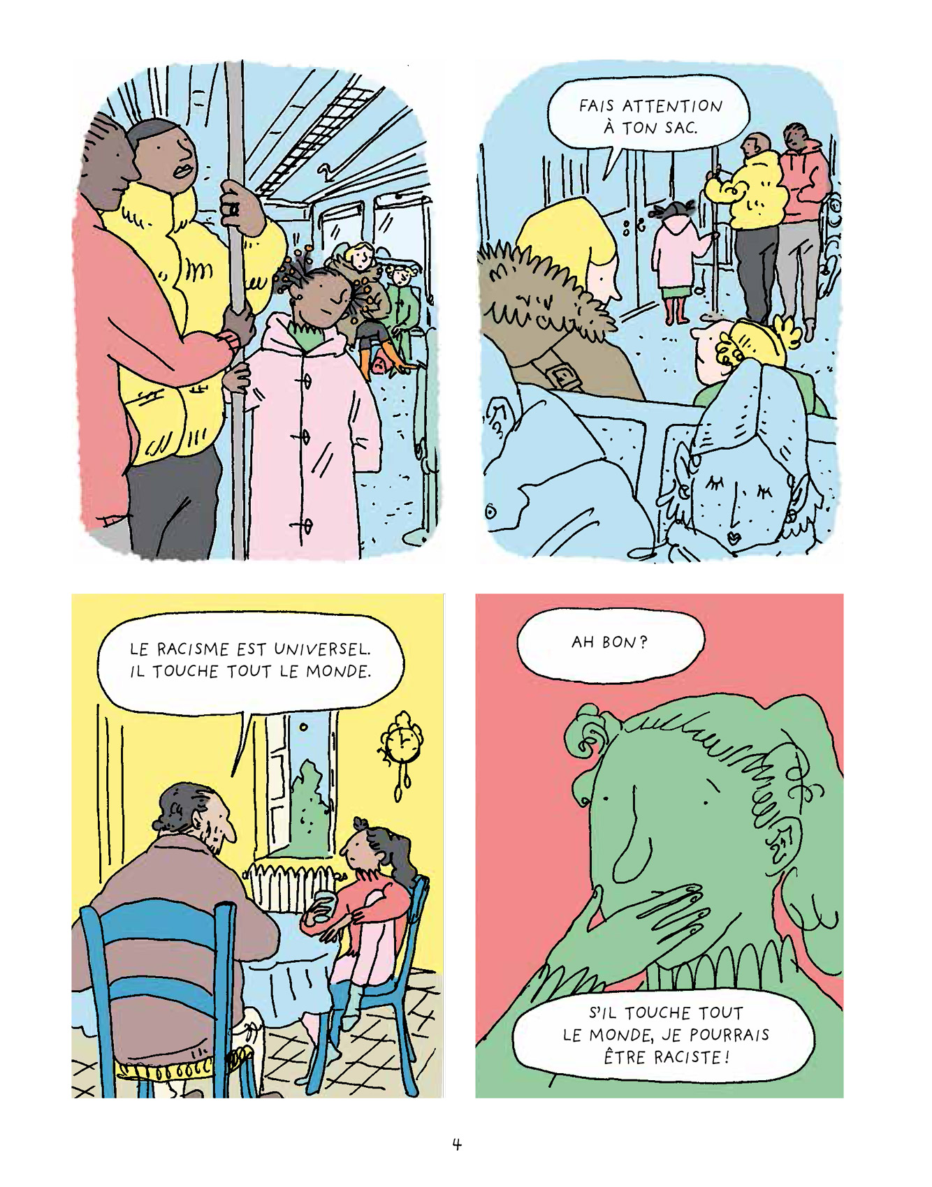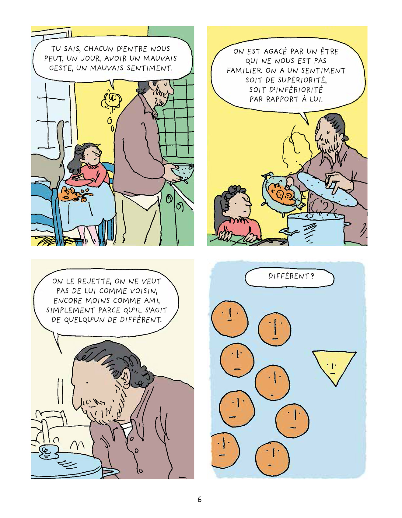Le Racisme expliqué à ma fille est l’adaptation du best-seller éponyme de Tahar Ben Jelloun que s’est chargé de réaliser Marzena Sowa, un défi relevé avec brio par la scénariste qui a pris le parti d’organiser sa bande dessinée en chapitres reprenant les différentes idées développées par l’écrivain, peintre et poète franco-marocain afin de ne pas perdre les jeunes lecteurs. L’ensemble est fluide et suffisamment explicite pour une lecture seule ou accompagnée d’un parent pour les 8/10 ans. En effet, certaines notions ne sont pas si simples que cela à appréhender. Là aussi, un glossaire vient aider à la compréhension. Graphiquement, c’est Hélène Le Cam qui est à la manœuvre. L’autrice, dont il s’agit de la première bande dessinée, réalise une prestation de qualité et affirme déjà son style. À l’aide d’un gaufrier classique, mais original toutefois par l’absence des contours de cases, et d’une colorisation aux tons pastel qui atténue la dureté du thème, l’illustratrice nous emmène avec une certaine poésie aux côtés de Mérième et son papa.