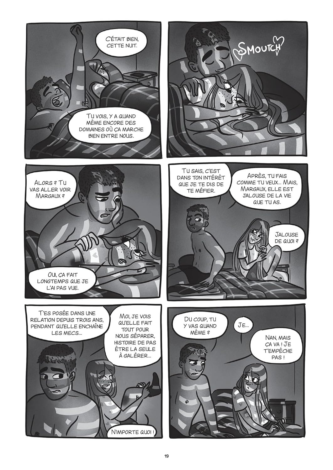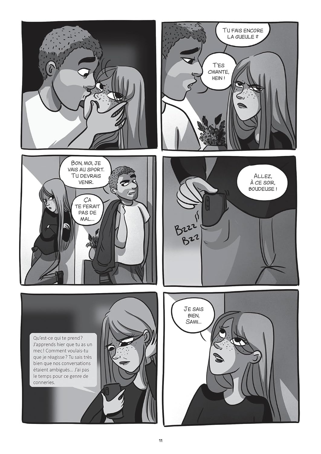 Initialement publié sur le compte Instagram dédié de Fanny Vella, cette BD s’offre une exposition encore plus grande avec cette arrivée dans les rayons de nos chers libraires. C’est d’autant plus important que le sujet abordé dans Le Seuil est grave et mérite qu’on s’y attarde alors que de plus en plus de langues se délient. L’utilisation du noir et blanc et de teintes de gris renforce le degré dramatique d’un tel sujet. L’autrice nous plonge dans le quotidien de cette jeune femme vivant une relation toxique avec un homme à l’humeur changeante. La tension est palpable au fil de la lecture car la violence à laquelle fait face la jeune femme est autant physique que verbale. C’est d’ailleurs le concept même de relation toxique qui est mis en exergue dans le récit. Pourtant, comme le montre Fanny Vella, l’entourage a un rôle prépondérant à jouer pour sortir la victime de cette situation. Cette histoire est particulièrement bien écrite et construite autour de ce thème qui n’a pourtant rien de simple. Grâce à cette autrice engagée, on se questionne mais surtout on est susceptible d’avoir des réponses si un jour on est confronté à ce type d’événement avec un proche.