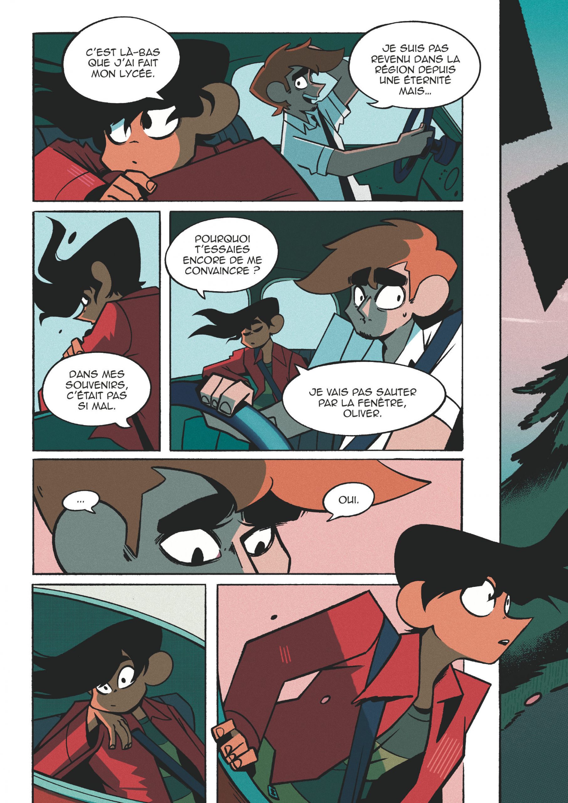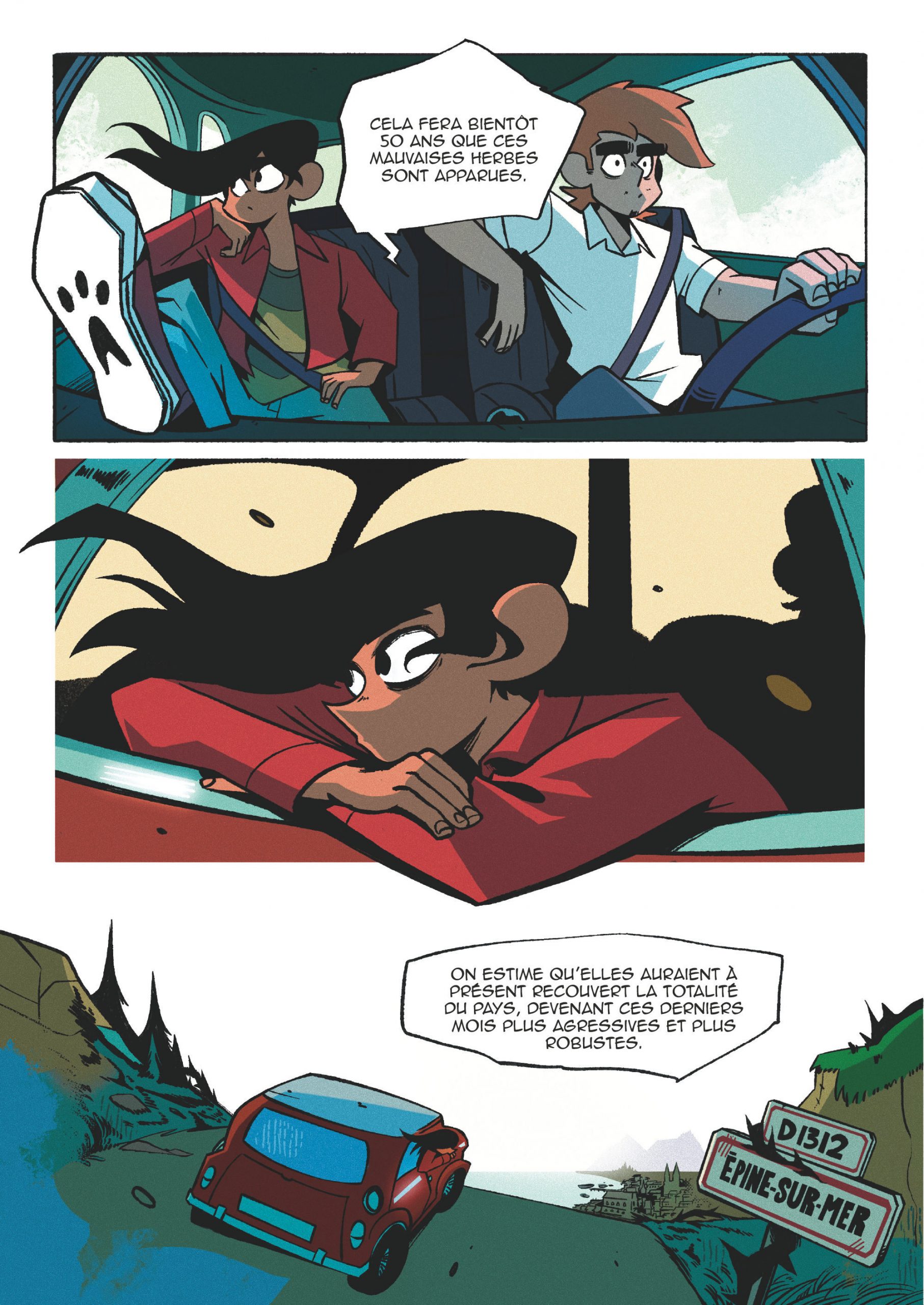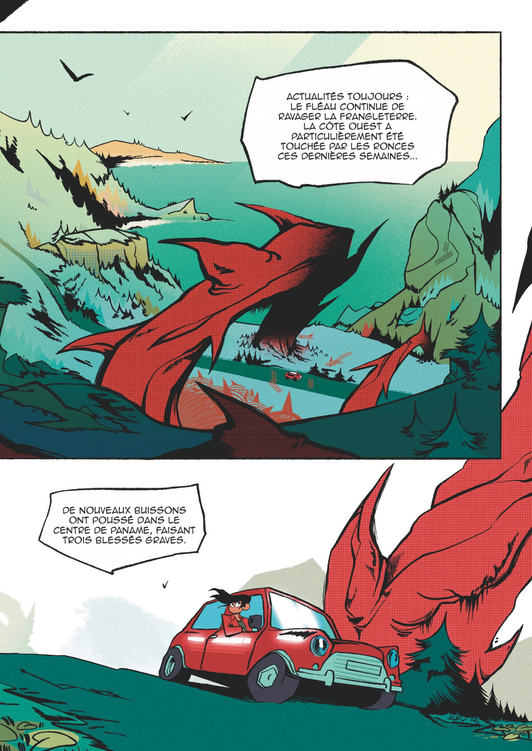 Pour son premier album, Pendragon, jeune auteur parisien, imagine une histoire à la fois conventionnelle par certains aspects et originale par d’autres. En effet, on connaît déjà de nombreux récits où le héros solitaire débarque dans un établissement scolaire peu commun, se lie d’amitié avec d’autres élèves un peu spéciaux et avec qui il combat un ennemi qui menace le monde. Malgré tout, la particularité de l’intrigue réside dans cet ennemi inédit que sont les ronces. Est-ce un retour de bâton de la part de la nature vis-à-vis des humains qui n’en prennent pas soin ? Tout semble ouvert et les réponses attendent les lecteurs dans le second tome de ce diptyque. Au-delà de ces interrogations, l’auteur développe son histoire autour de l’adolescence et l’amitié qui en découle tout autant que la confiance en soi dont souffrent bon nombre d’adolescents dans notre société. Visuellement on ne peut s’empêcher de penser que les références de Pendragon viennent d’Outre-Atlantique et plus précisément des comics américains. Le résultat est très réussi et embarque dans une aventure menée tambour battant.