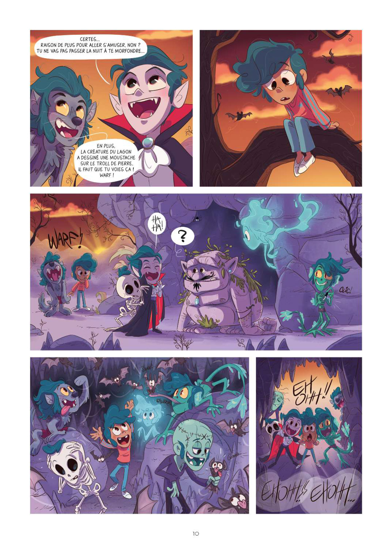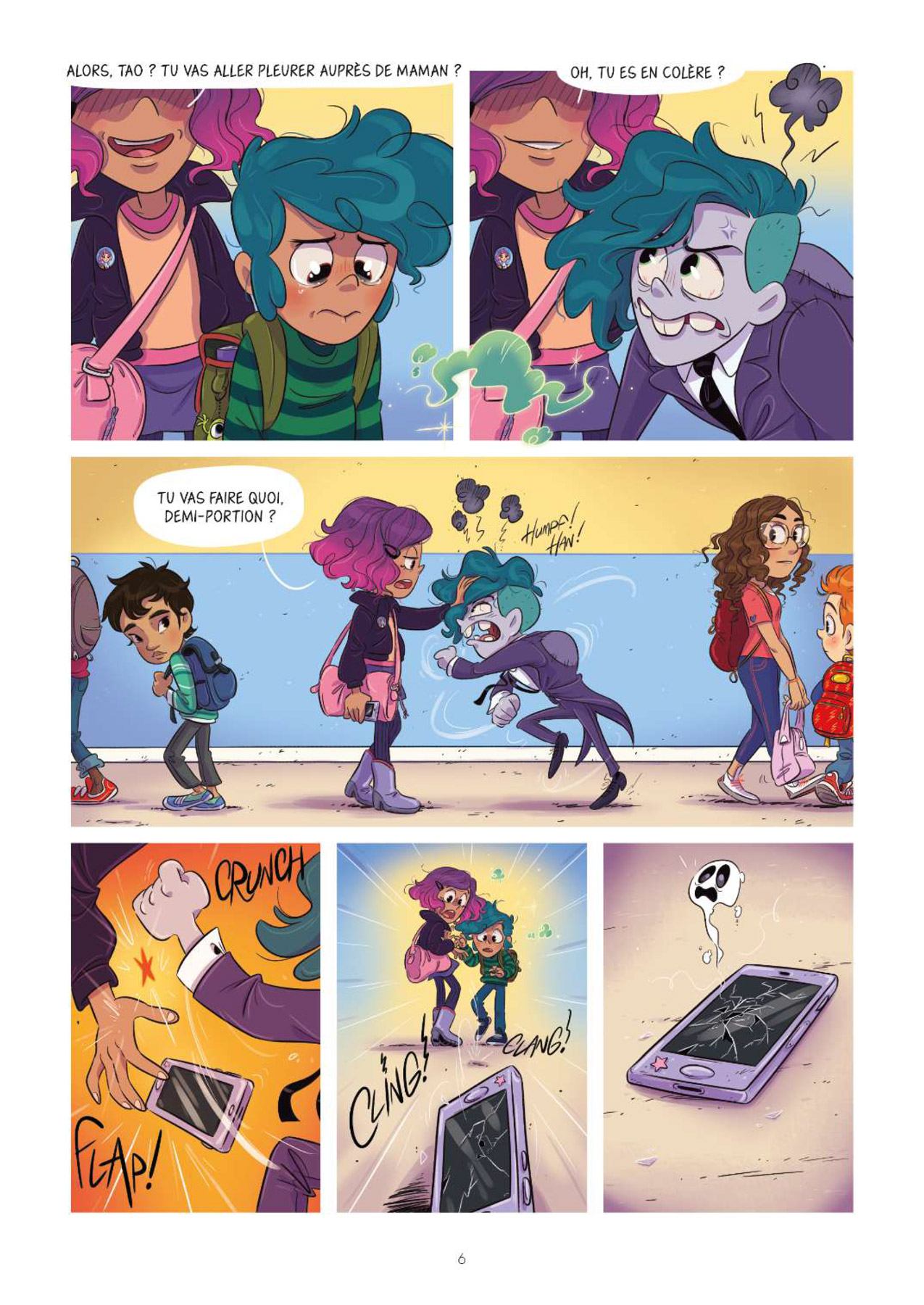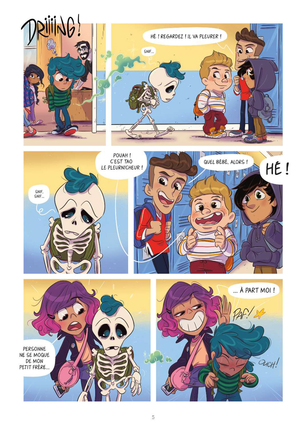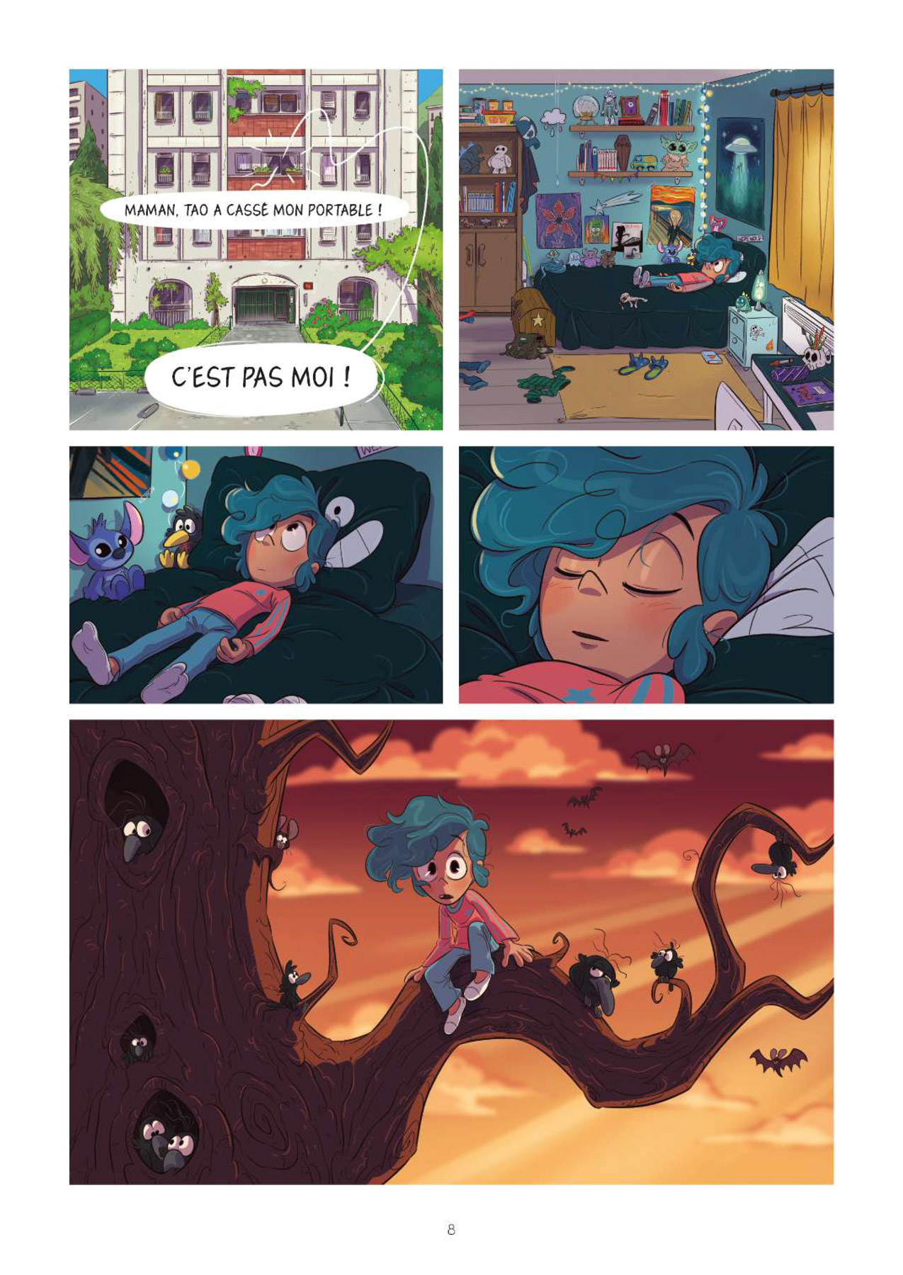 Comme autant de sentiments qui envahissent l’esprit d’un préadolescent lors de sa construction et de sa recherche de soi, les fantômes de Tao s’invitent dans sa vie pour le mettre dans de drôles de situations, d’abord dans ses rêves puis petit à petit au quotidien dans ses attitudes et comportements. Après Elles, Kid Toussaint s’intéresse à nouveau à cette thématique en l’abordant avec une dimension plus humoristique et fantastique que précédemment. Cette fois-ci, le scénariste place le lectorat du côté d’un garçon. Ainsi, ce premier tome pose les bases de cette nouvelle série et introduit chaque personnage (Tao, Robin, les monstres, Victoria, etc.) de manière efficace avec en complément des fiches en fin d’album. Indubitablement, l’auteur sait comment s’adresser à son cœur de cible et il le fait bien. Comme à l’accoutumée, les tranches de rire sont nombreuses. L’autre bonne surprise de cet album est le retour aux crayons de David Gilson (Bichon). Le dessinateur met toute son expérience acquise dans les différents studios d’animation pour lesquels il a travaillé au service de l’histoire. Le trait atteint ainsi un très haut niveau d’expressivité. De plus, les lecteurs attentifs repéreront les nombreuses références parsemées de-ci de-là comme, par exemple, la ressemblance frappante entre Robin et une certaine Line, personnage de Elles.