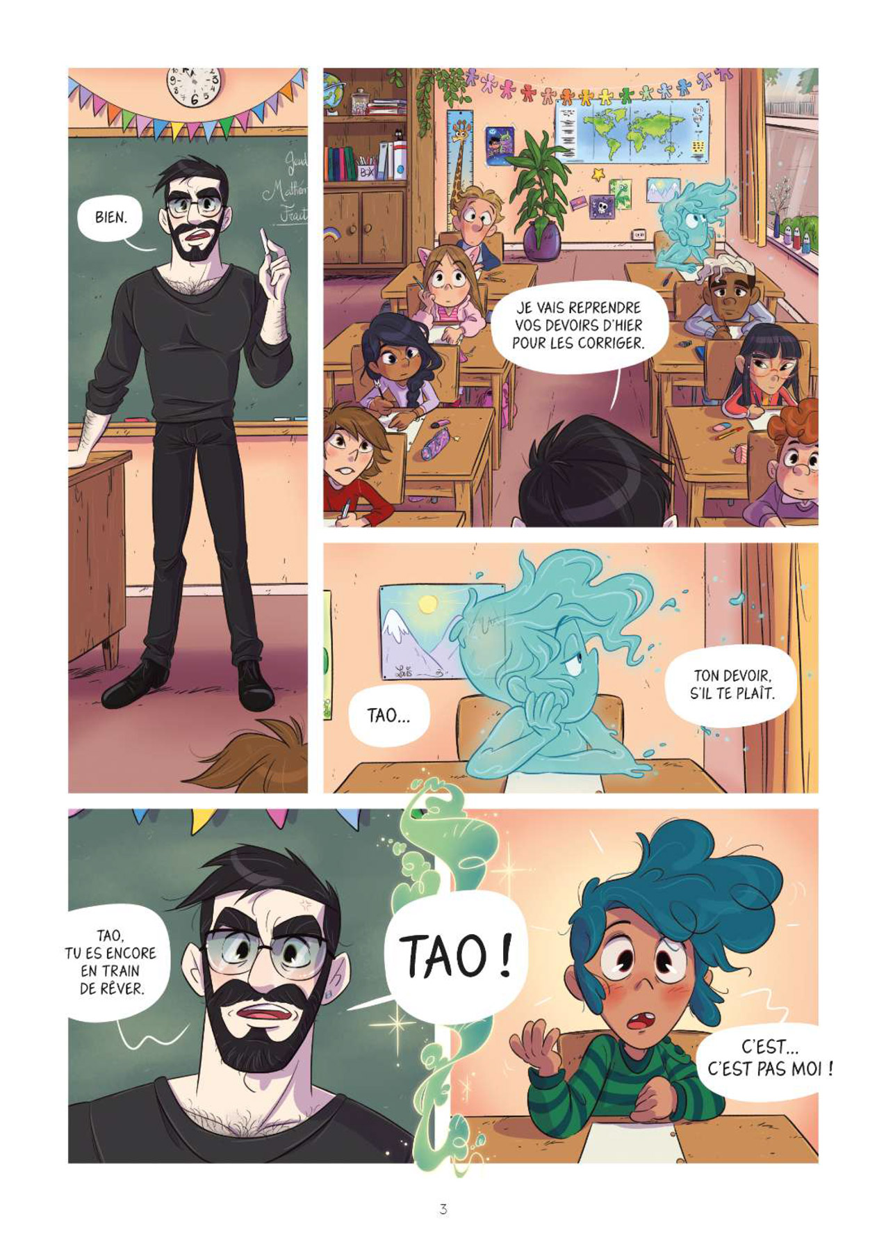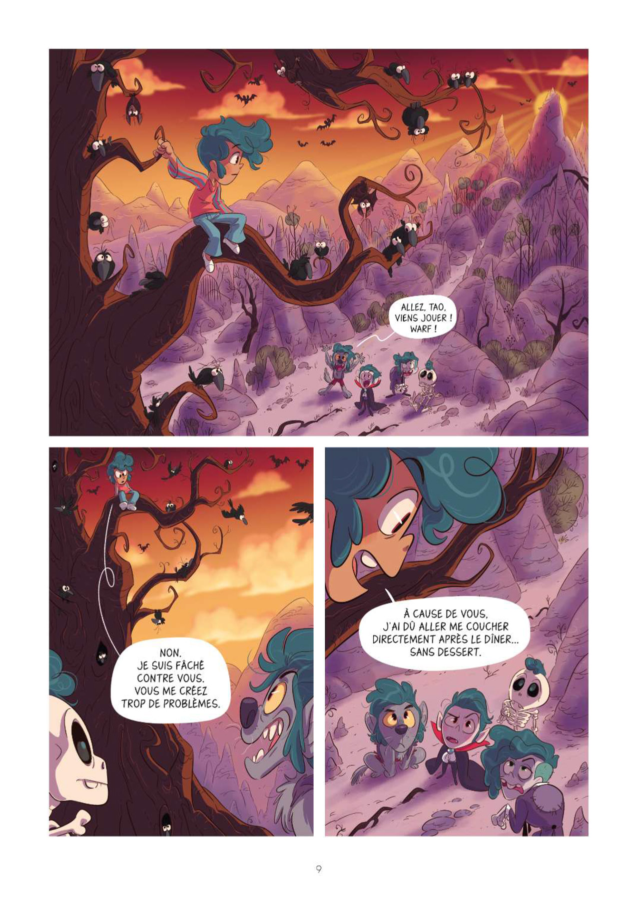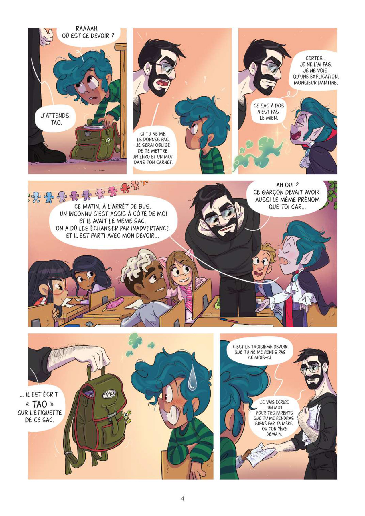 Cela fait trois fois en un mois que Tao n’a pas rendu son devoir et cela risque de lui coûter très cher. Cependant, comme il le dit si bien, ce n’est pas lui ! En effet, ses monstres intérieurs ont une fâcheuse tendance à le mettre dans le pétrin. Le squelette trouillard, le vampire menteur, le fantôme distrait, le loup-garou casse-cou… Tous sèment une sacrée pagaille que le garçon doit gérer après. C’est pour cela que son carnet est enterré là où se trouve son devoir et que ses parents ne verront jamais le mot écrit par son instituteur. Pour que les choses changent, il faudrait qu’il trouve le prince parfait. Le problème est qu’il est enfermé depuis longtemps ! Le lendemain, Tao est réveillé par sa maman qui lui demande d’aider Granny, sa grand-mère, et Chloé, sa sœur, pour les tâches ménagères. À peine est-il arrivé dans la cuisine que Chloé lui refile sa mission : acheter de l’ail des ours pour Granny. En sortant de l’appartement, Tao croise Robin qui joue à la console portable dans le couloir. Comme de bien entendu, rien ne se passe comme prévu et les deux copains se retrouvent perdus dans la forêt. Heureusement, un « ange gardien » veille sur lui sans qu’il le sache !