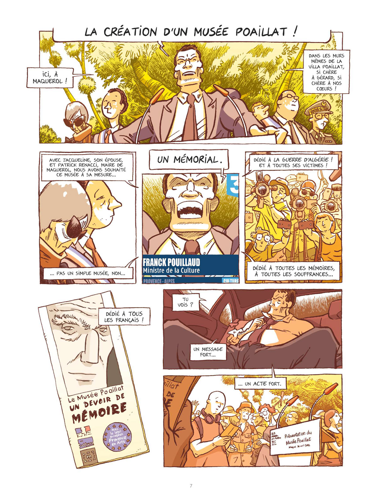 Le rire est une arme redoutable, non seulement pour détendre une atmosphère pesante mais aussi pour aborder de manière légère des sujets importants. Cela, Nicolas Juncker l’a compris depuis bien longtemps, comme nous avons pu le constater avec la série Les Mémoires du dragon Dragon et surtout avec Un général, des généraux. Ainsi, avec la même approche humoristique, l’auteur aborde avec un pas de côté le douloureux héritage de la guerre d’Algérie. Pour cela, il utilise un trio de personnages – l’historienne, le politique et l’artiste – qui sont en désaccord sur beaucoup de choses car ils ne poursuivent pas les mêmes objectifs pour le projet de musée. Leurs implications personnelles dans un projet mémoriel de la vie courante ne sont pas sans conséquences, comme cela a été le cas avec l’abandon du Musée de la France et l’Algérie à Montpellier en 2014 où les pressions politiques – voire diplomatiques – étaient trop grandes. D’ailleurs, il est très drôle de voir le maire de Maquerol (clin d’œil à maquereau ?) s’écrier : “Maquerol symbolisera une vaste réconciliation nationale”. Cette réconciliation est-elle réalisable ? Rien n’est moins sûr car, presque 60 ans après les accords d’Évian, les tensions sont toujours palpables entre l’État, les harkis, les pieds-noirs et les Algériens. C’est ce que l’on ressent à la lecture de ce one-shot mis en images par Nicolas Juncker lui-même dans un style on ne peut plus en phase avec le récit. Pour finir, les lecteurs apprécieront à sa juste valeur la référence à Gordon Matta-Clark, l’artiste américain connu pour ses œuvres sur site réalisées dans les années 1970, à travers Jean-Claude Wollaert. Mention spéciale pour Juliette Laude et sa mise en couleurs singulière et très bien sentie.